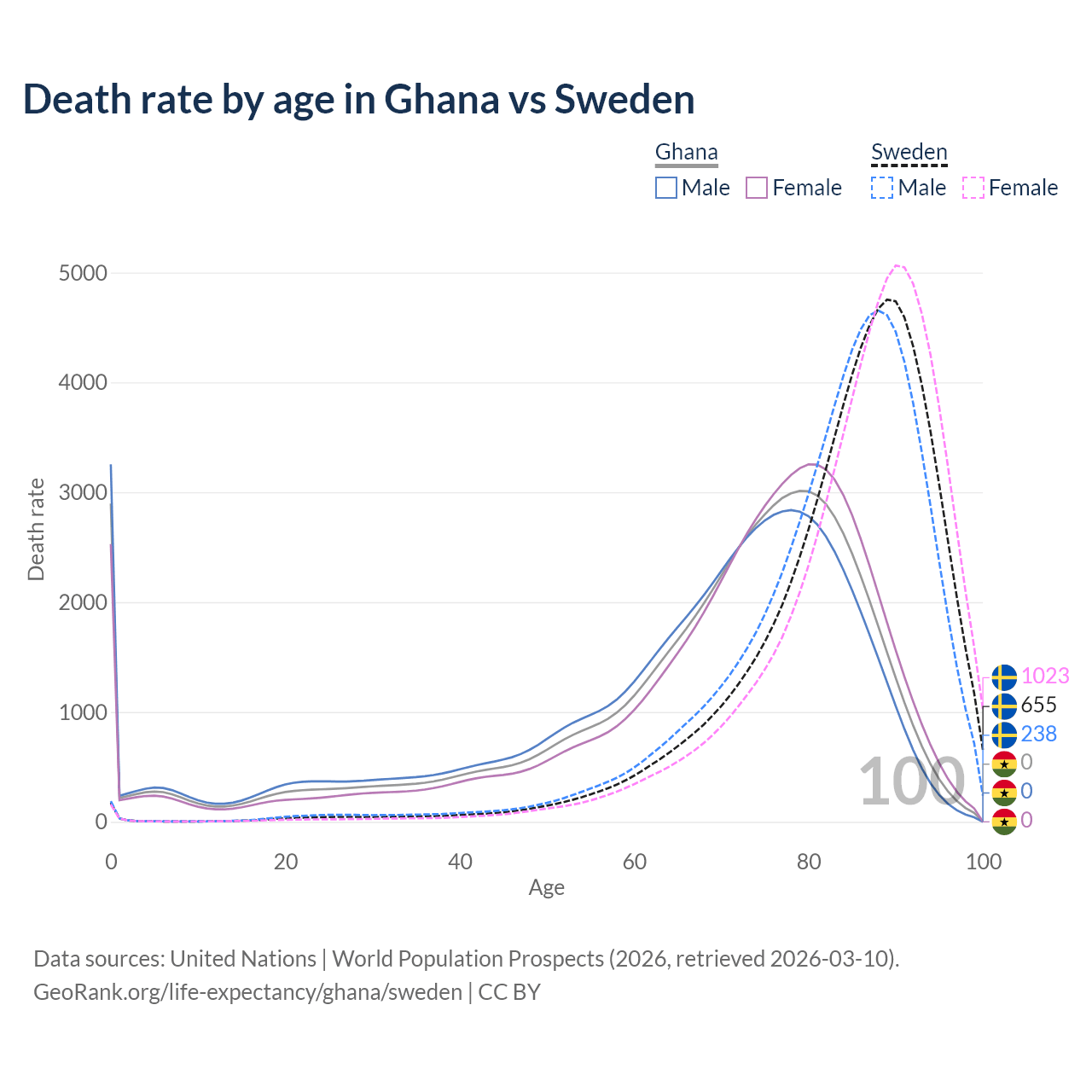 The average life expectancy at birth is 66.1 years in Ghana vs 83.7 in Sweden. Ghana is ranked 169/197 by life expectancy, and Sweden is 14/197. In Ghana, the life expectancy is 63.7 years for males and 68.6 years for females. In Sweden, it's 82 years for males and 85.5 years for females.