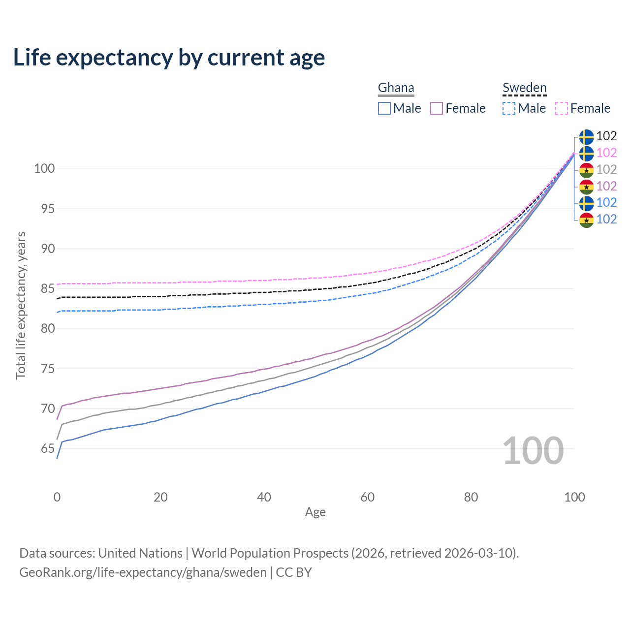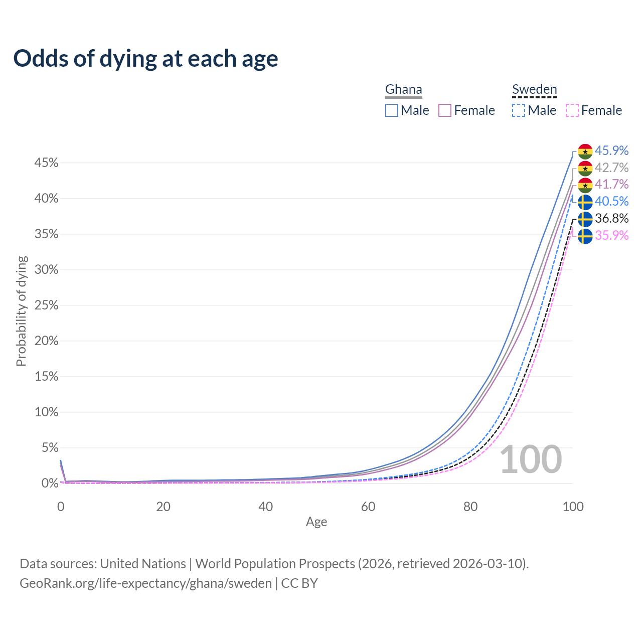 This life expectancy calculator shows the odds of living to 100, 95, 90, and below based on current age for both males and females in Ghana and Sweden, along with mean and median age of death. The calculations are based on the 2026 life tables (actuarial tables) from the UN World Population Prospects.
