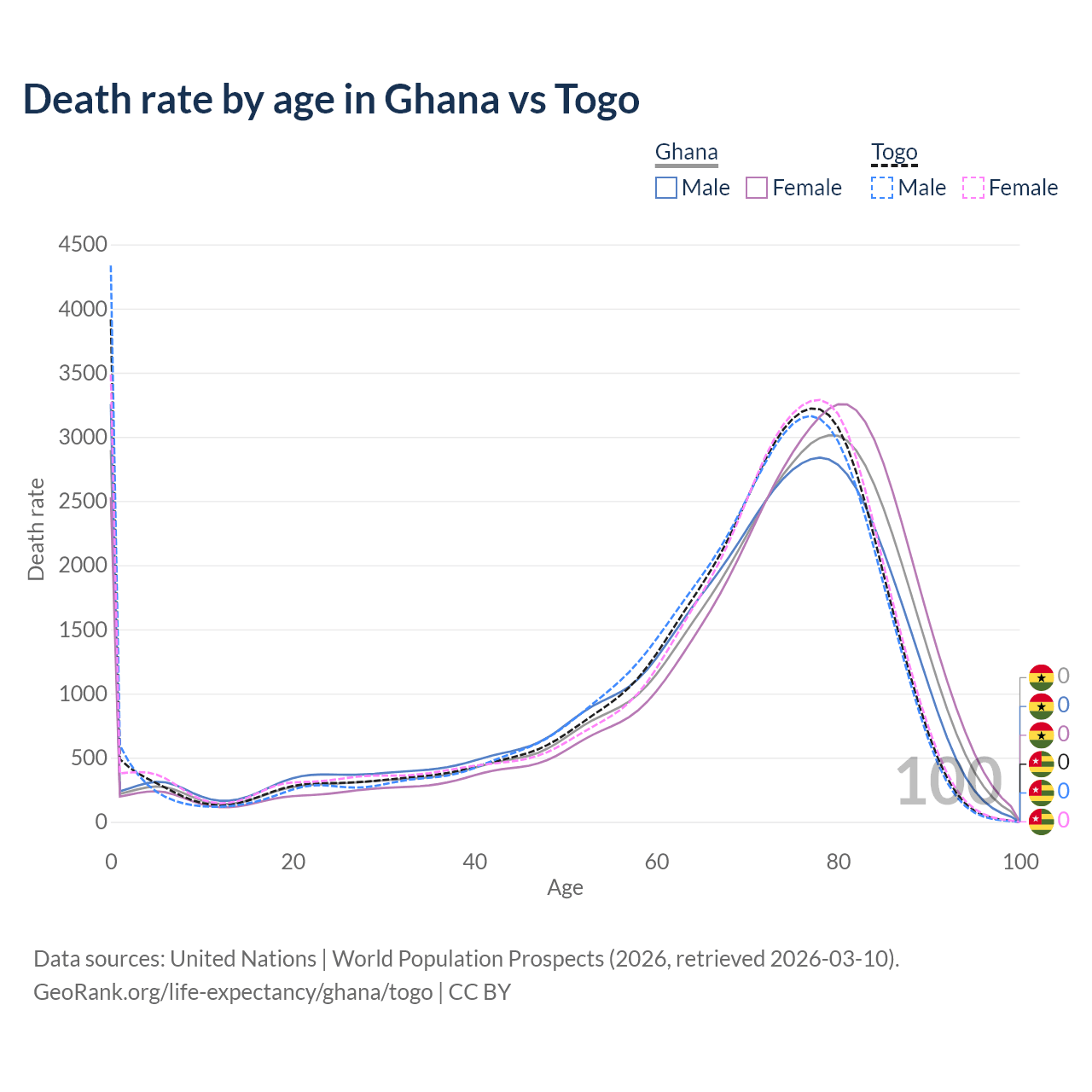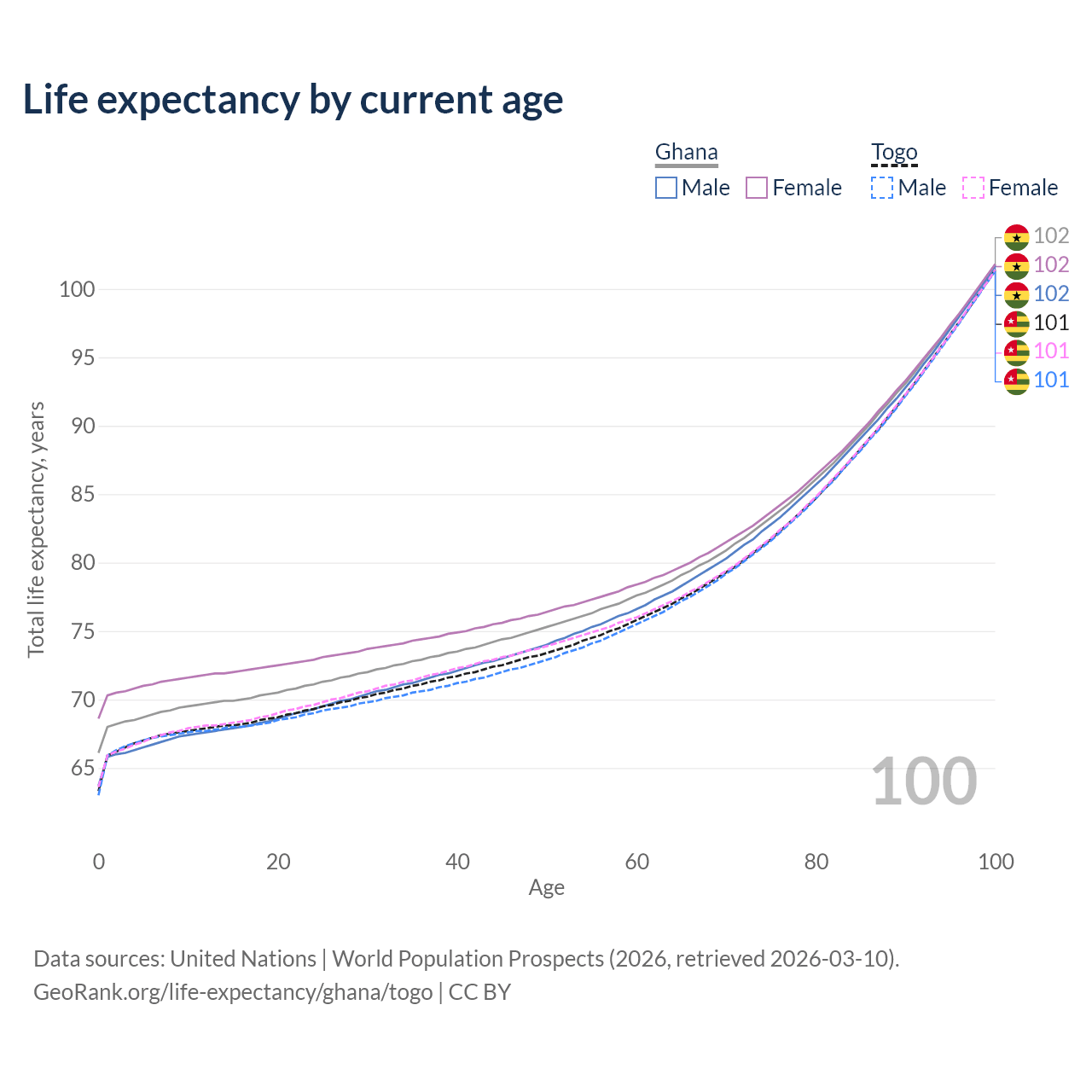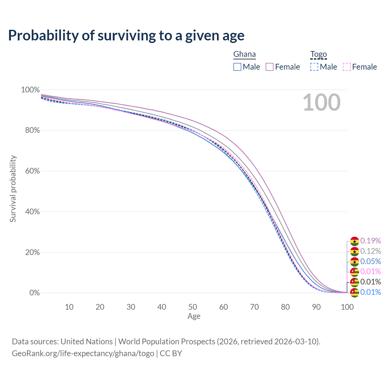This life expectancy calculator shows the odds of living to 100, 95, 90, and below based on current age for both males and females in Ghana and Togo, along with mean and median age of death. The calculations are based on the 2026 life tables (actuarial tables) from the UN World Population Prospects.