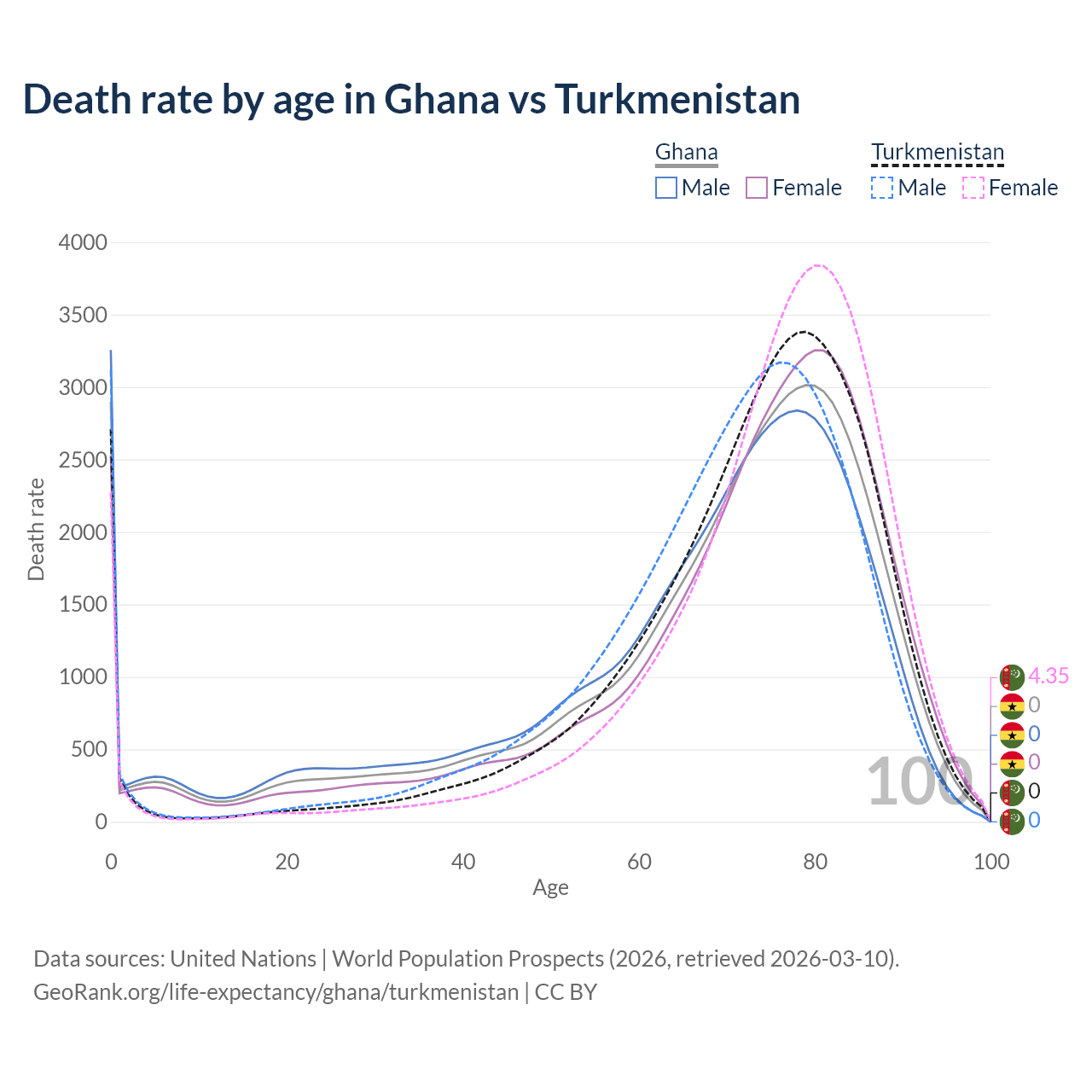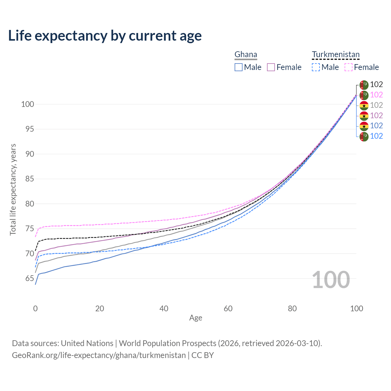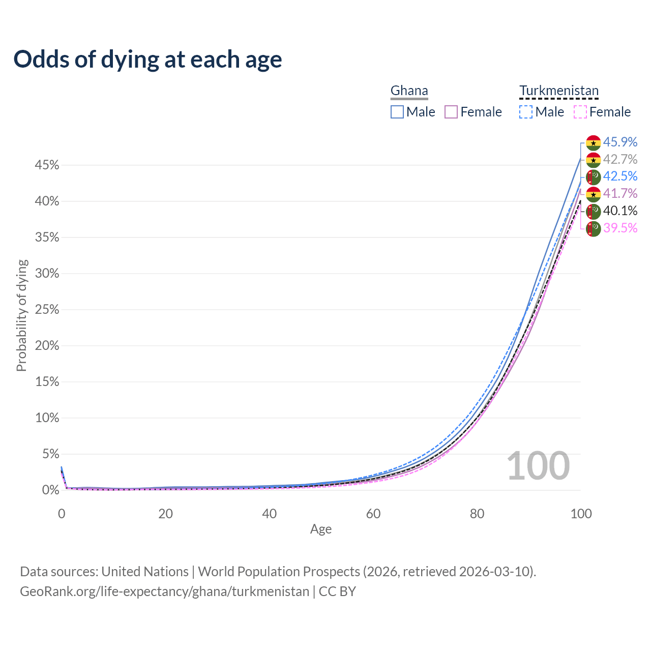 This life expectancy calculator shows the odds of living to 100, 95, 90, and below based on current age for both males and females in Ghana and Turkmenistan, along with mean and median age of death. The calculations are based on the 2026 life tables (actuarial tables) from the UN World Population Prospects.