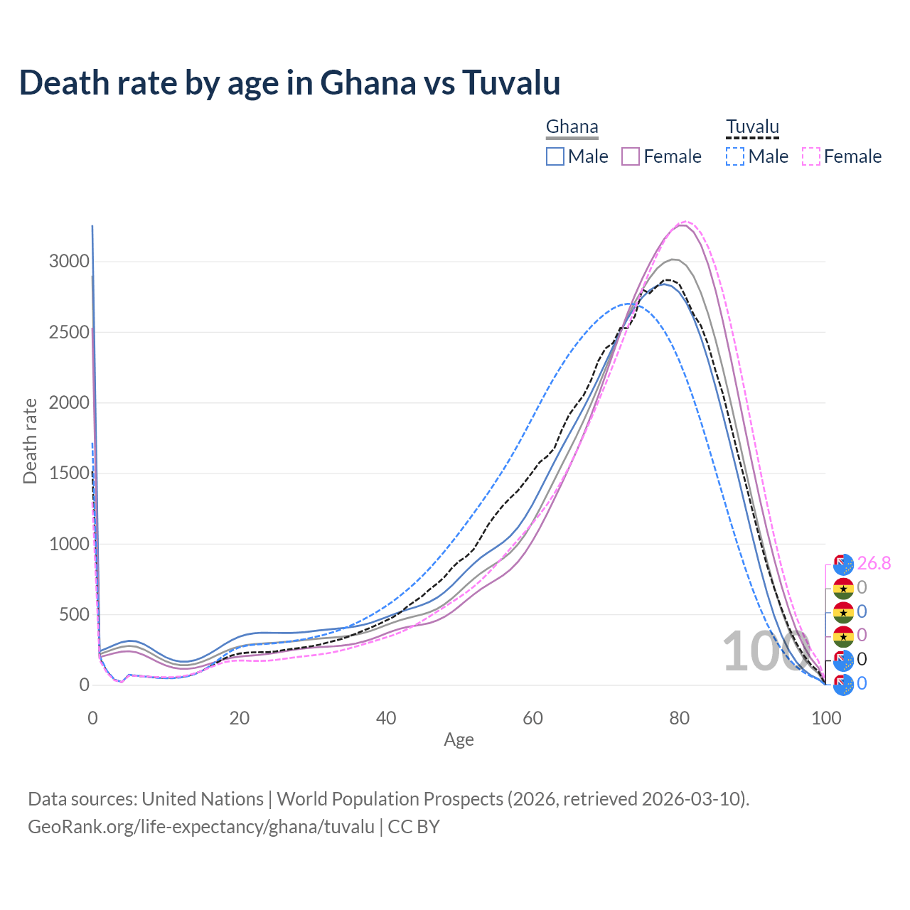In Ghana, the most common age of death is 79, compared to 78 in Tuvalu. The median age of death is 73 in Ghana and 71.9 in Tuvalu, meaning only half of each cohort is expected to live past that age.