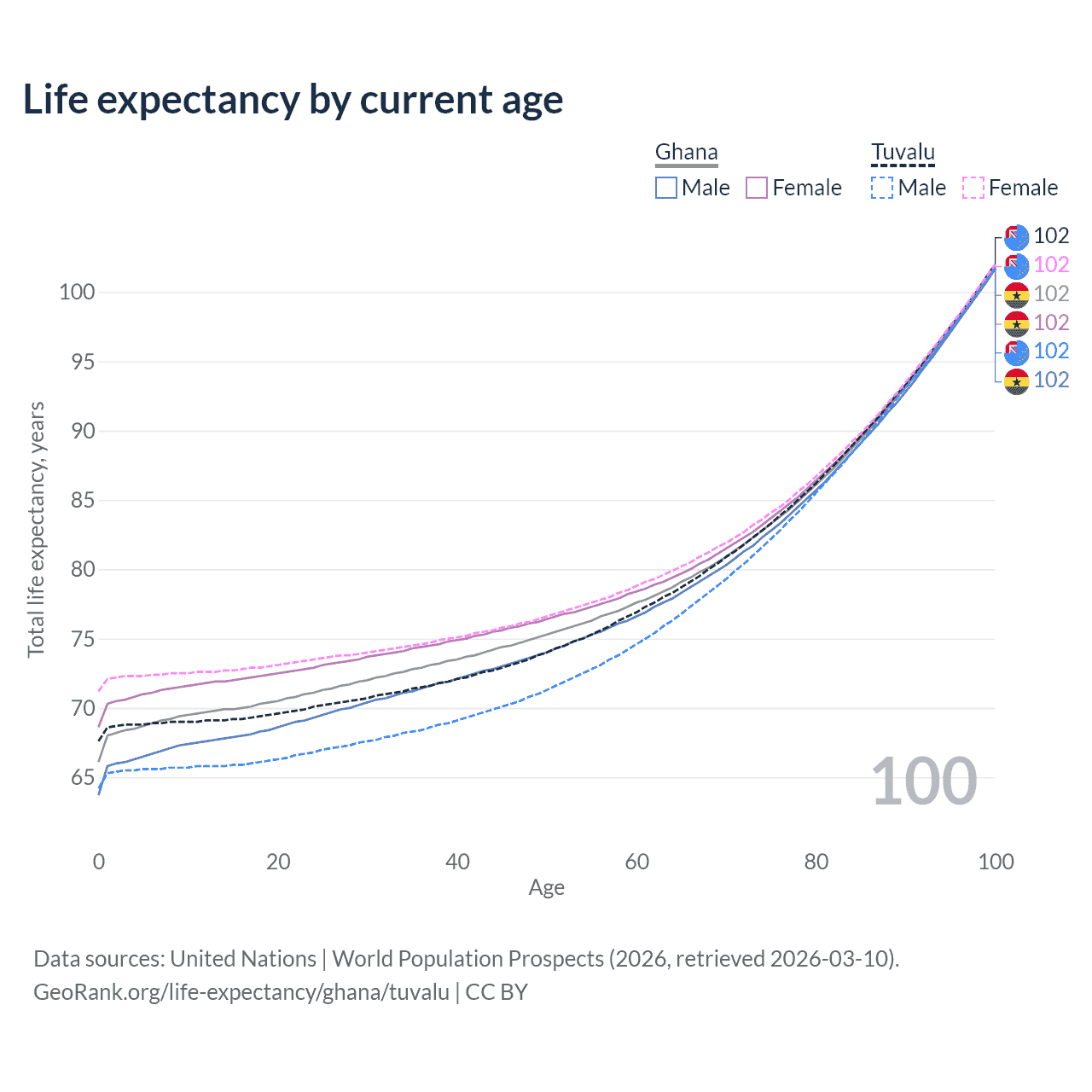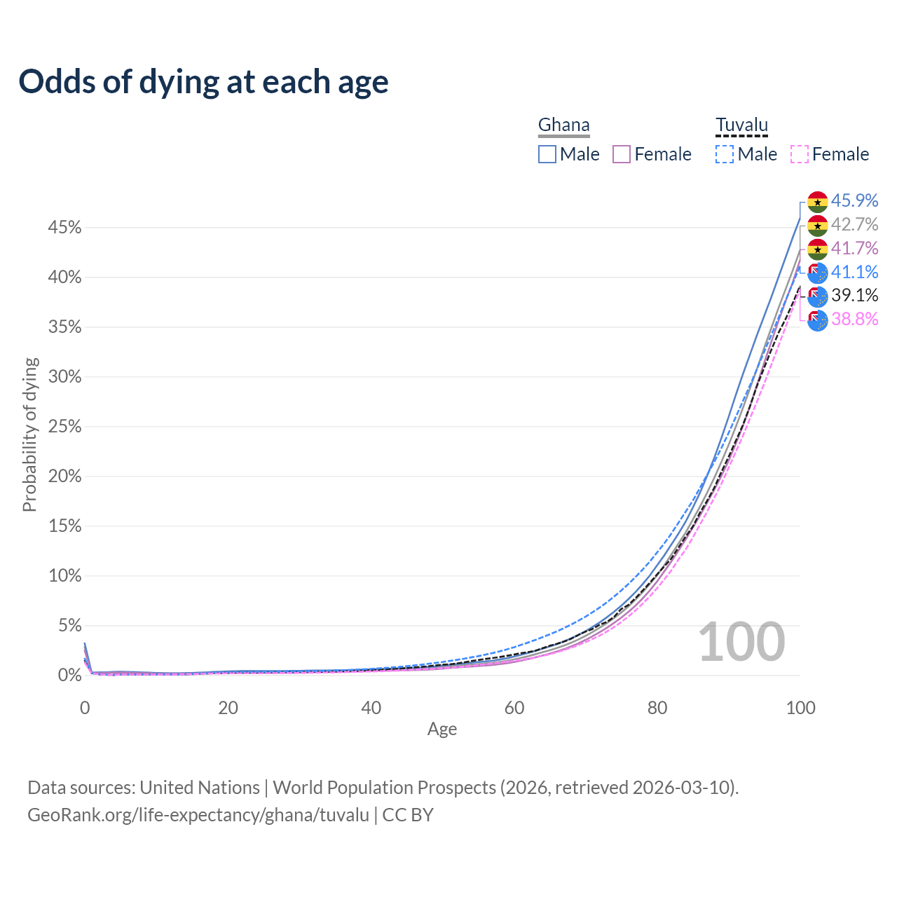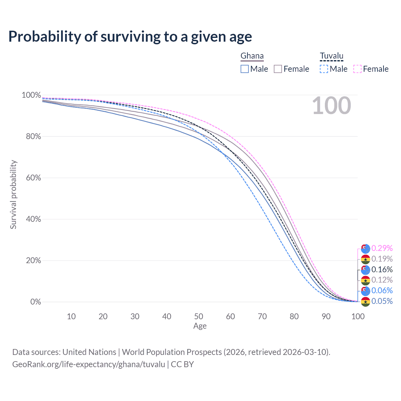 This life expectancy calculator shows the odds of living to 100, 95, 90, and below based on current age for both males and females in Ghana and Tuvalu, along with mean and median age of death. The calculations are based on the 2026 life tables (actuarial tables) from the UN World Population Prospects.