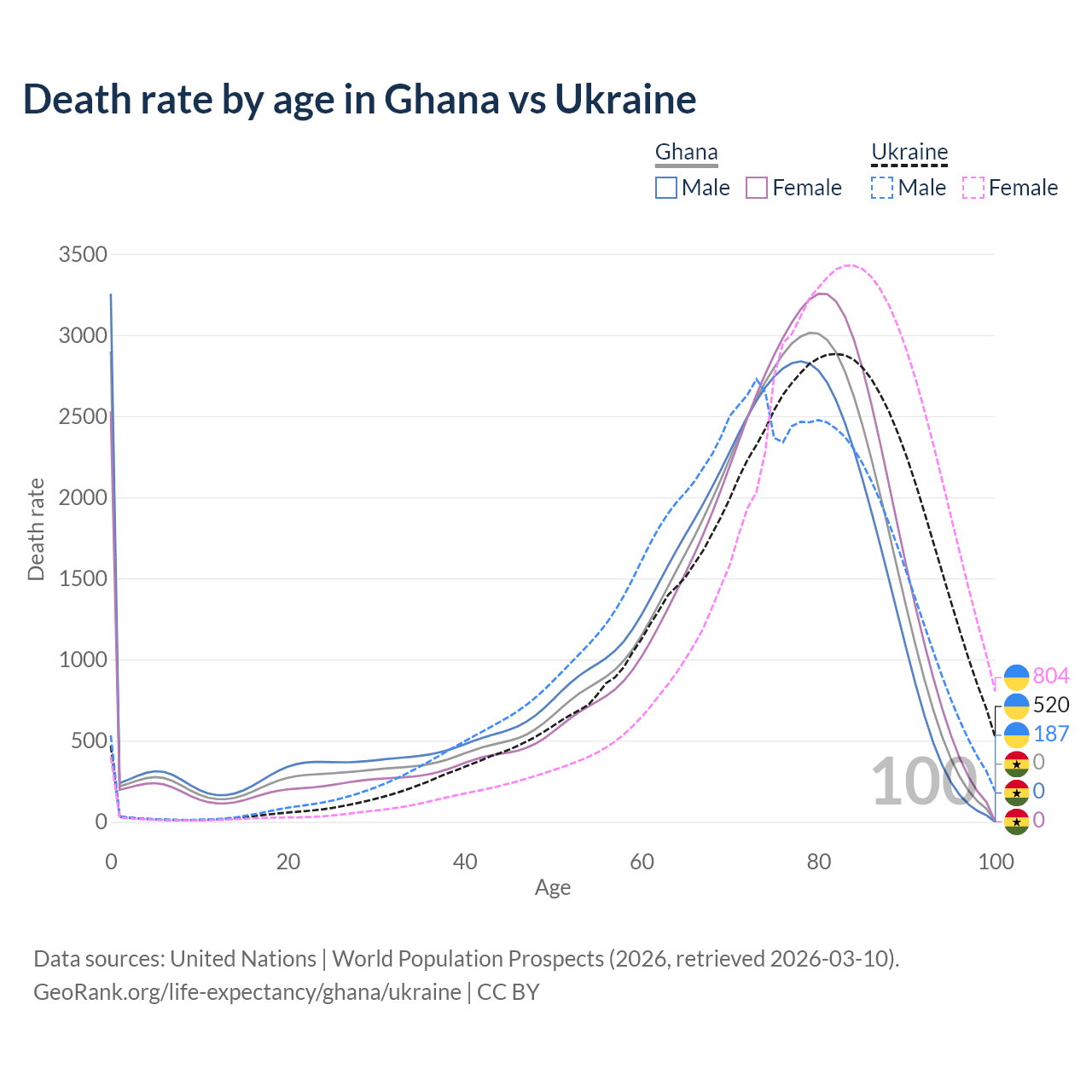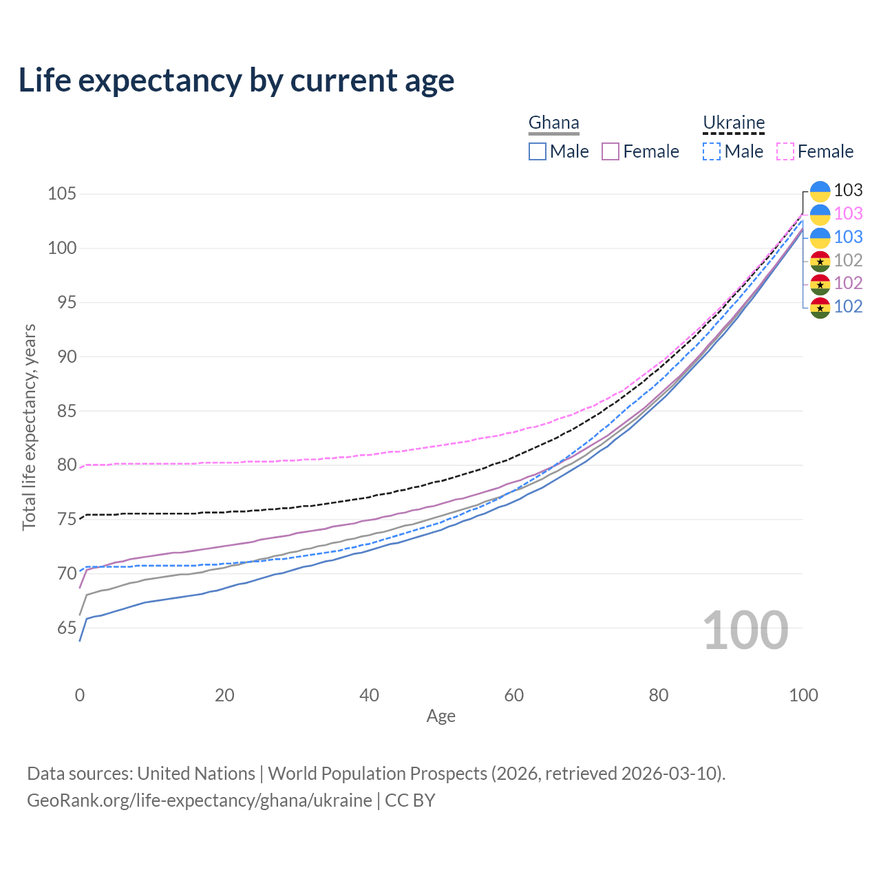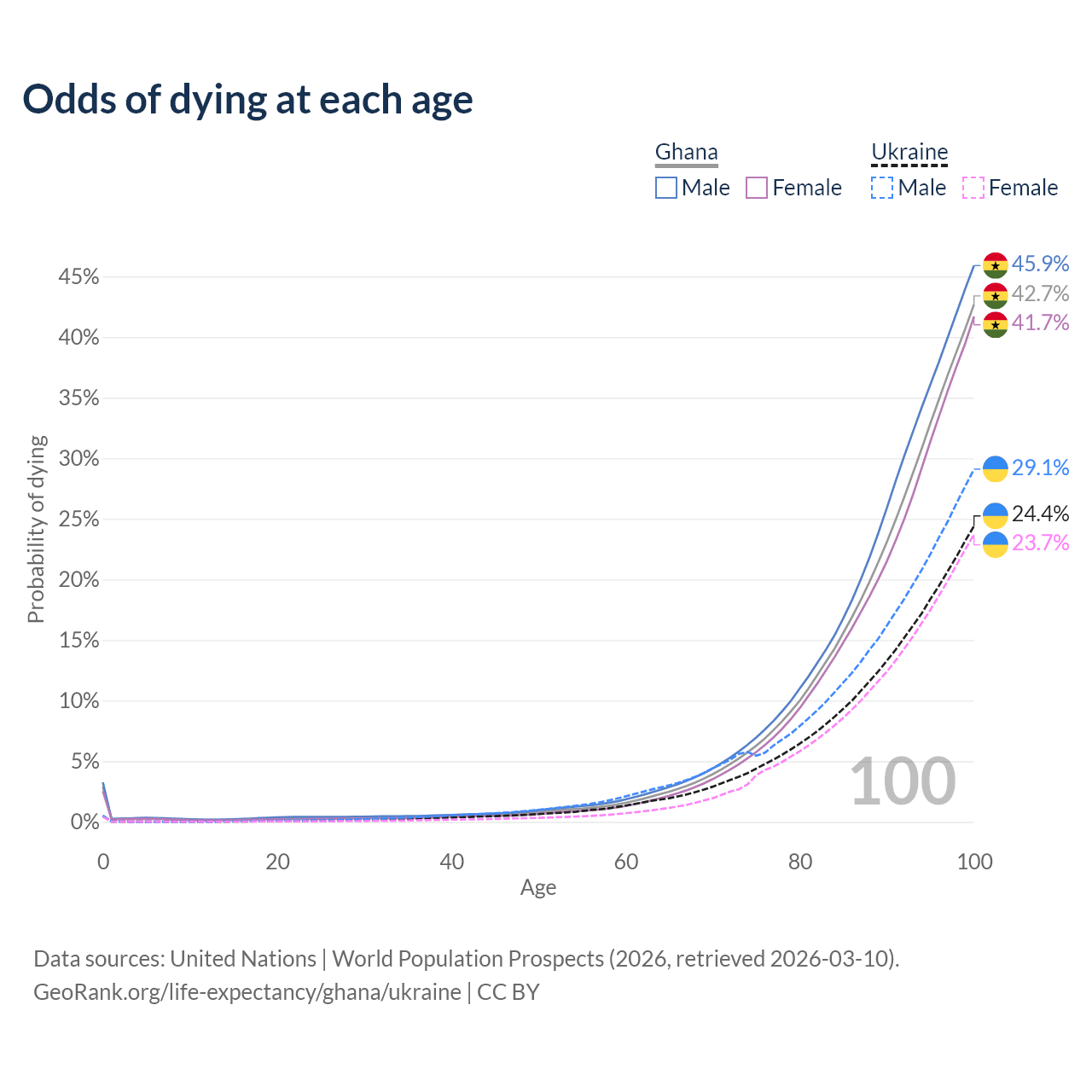 This life expectancy calculator shows the odds of living to 100, 95, 90, and below based on current age for both males and females in Ghana and Ukraine, along with mean and median age of death. The calculations are based on the 2026 life tables (actuarial tables) from the UN World Population Prospects.