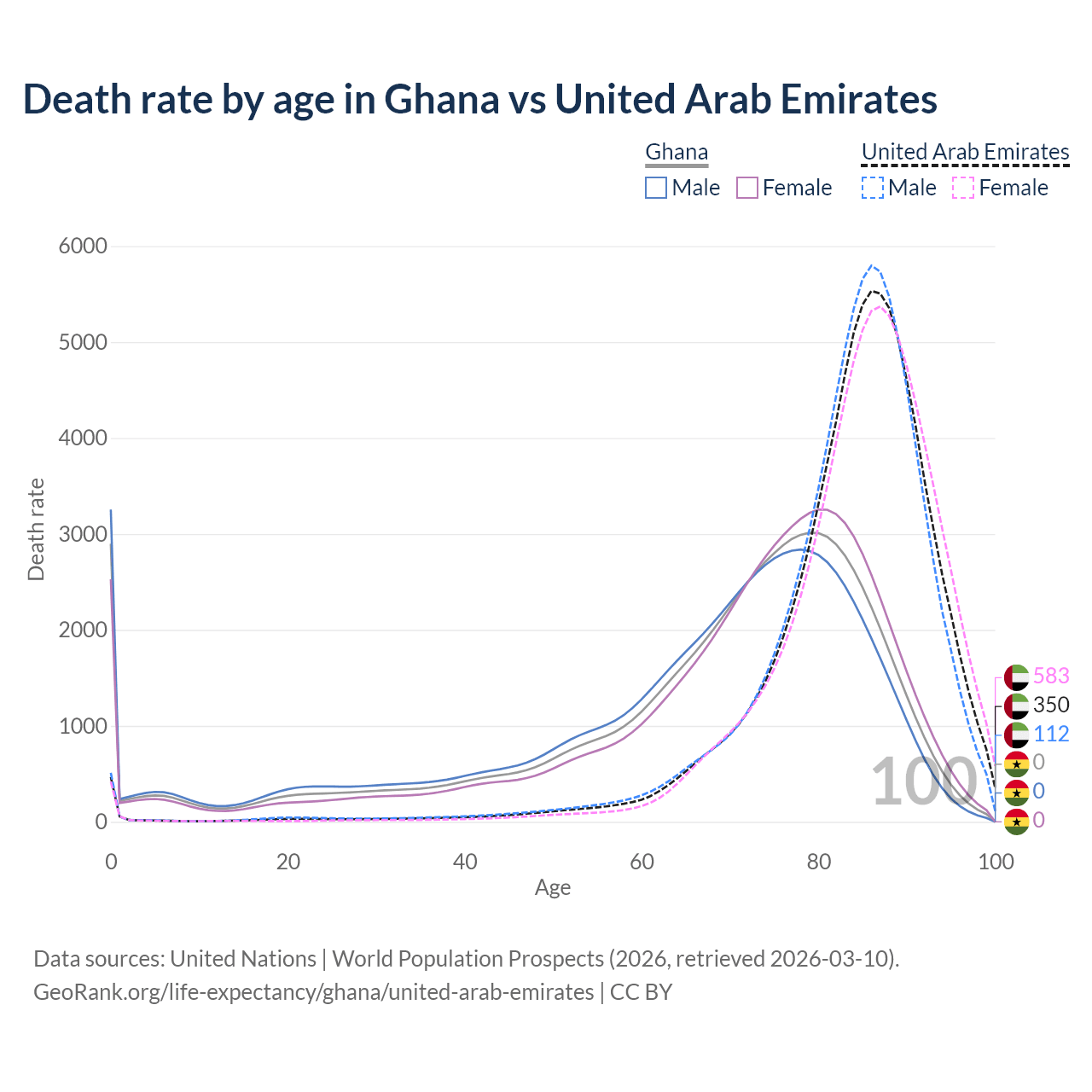 In Ghana, the most common age of death is 79, compared to 86 in the United Arab Emirates. The median age of death is 73 in Ghana and 85.6 in the United Arab Emirates, meaning only half of each cohort is expected to live past that age.