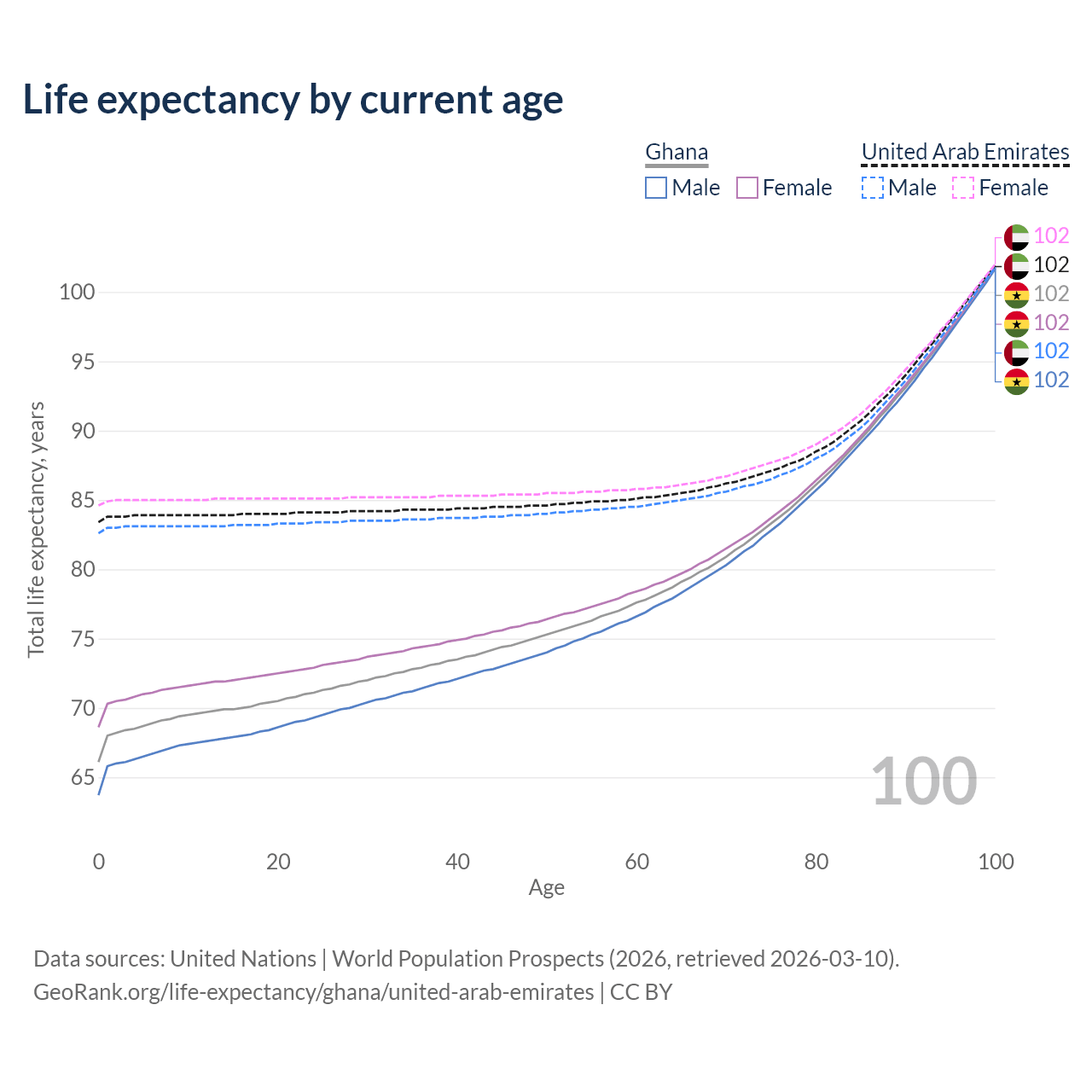 This life expectancy calculator shows the odds of living to 100, 95, 90, and below based on current age for both males and females in Ghana and the United Arab Emirates, along with mean and median age of death. The calculations are based on the 2026 life tables (actuarial tables) from the UN World Population Prospects.