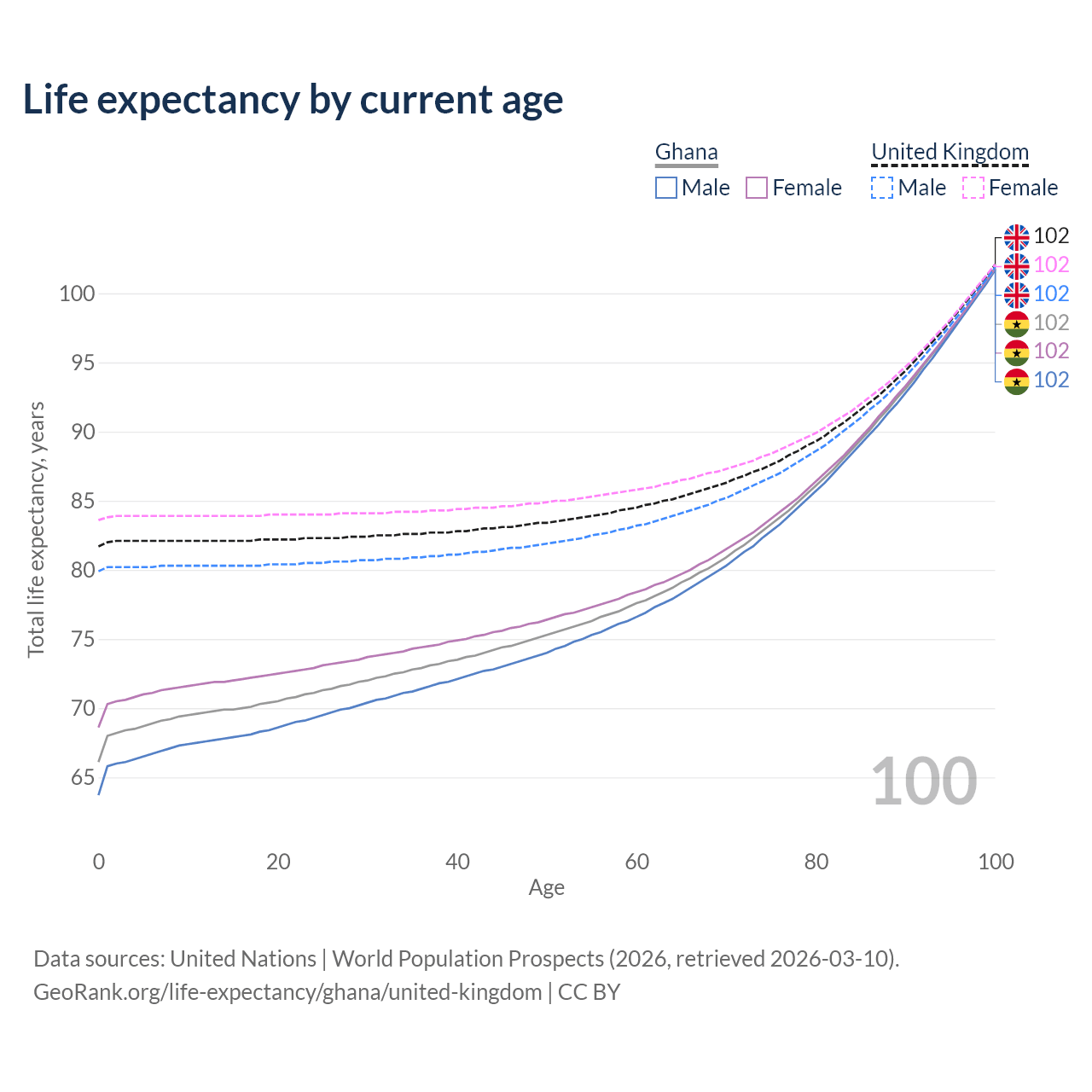This life expectancy calculator shows the odds of living to 100, 95, 90, and below based on current age for both males and females in Ghana and the United Kingdom, along with mean and median age of death. The calculations are based on the 2026 life tables (actuarial tables) from the UN World Population Prospects.