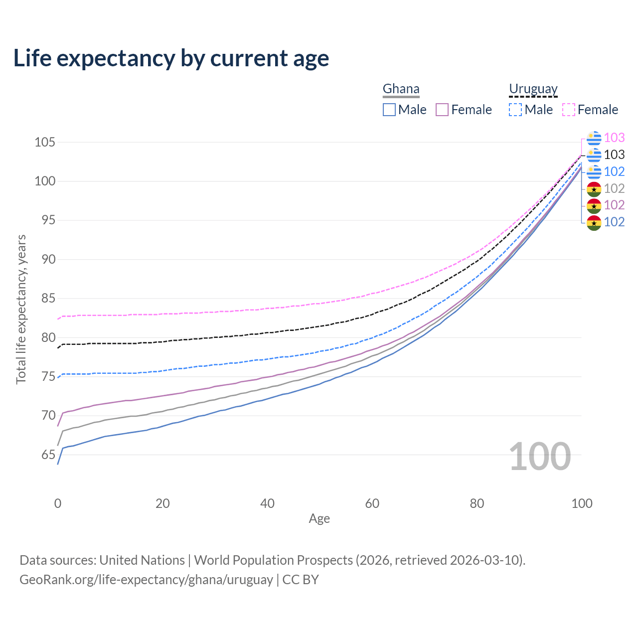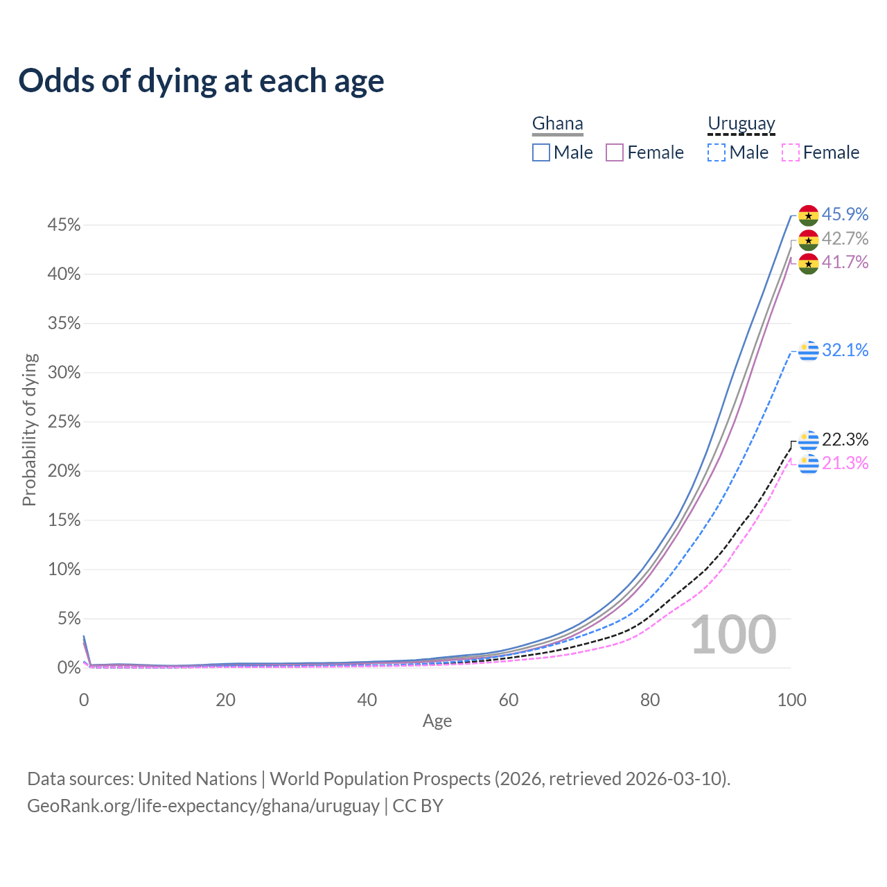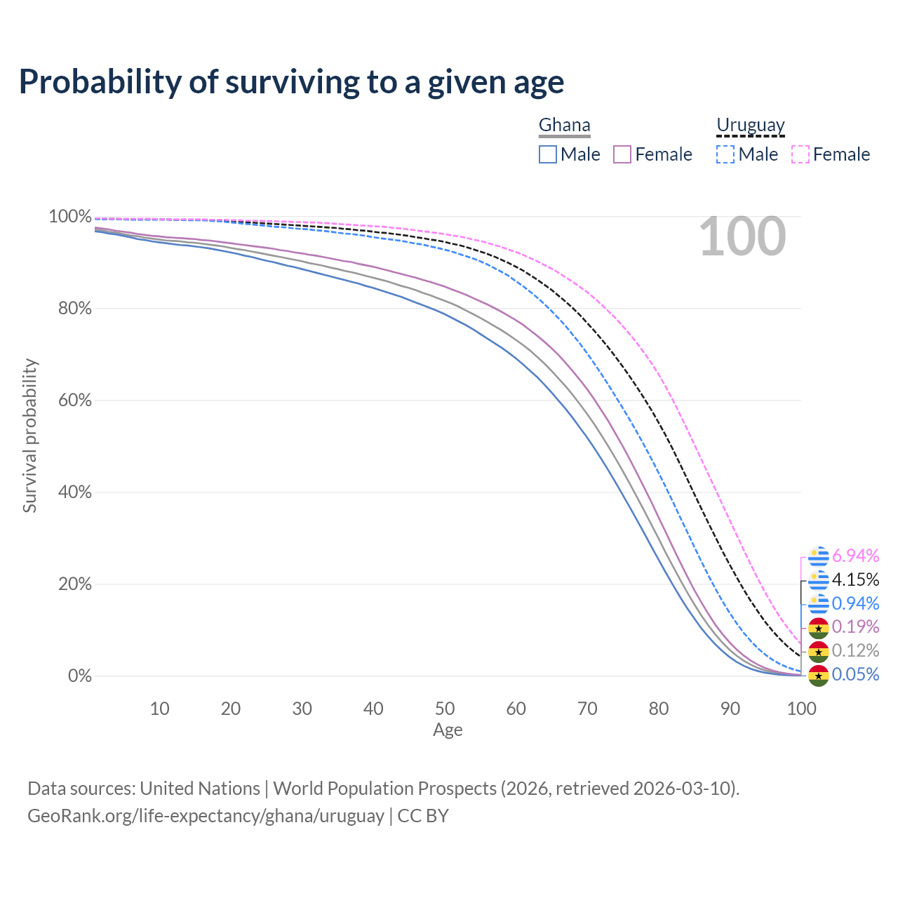 This life expectancy calculator shows the odds of living to 100, 95, 90, and below based on current age for both males and females in Ghana and Uruguay, along with mean and median age of death. The calculations are based on the 2026 life tables (actuarial tables) from the UN World Population Prospects.
