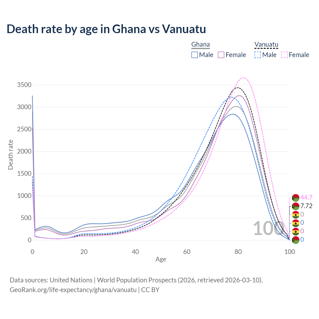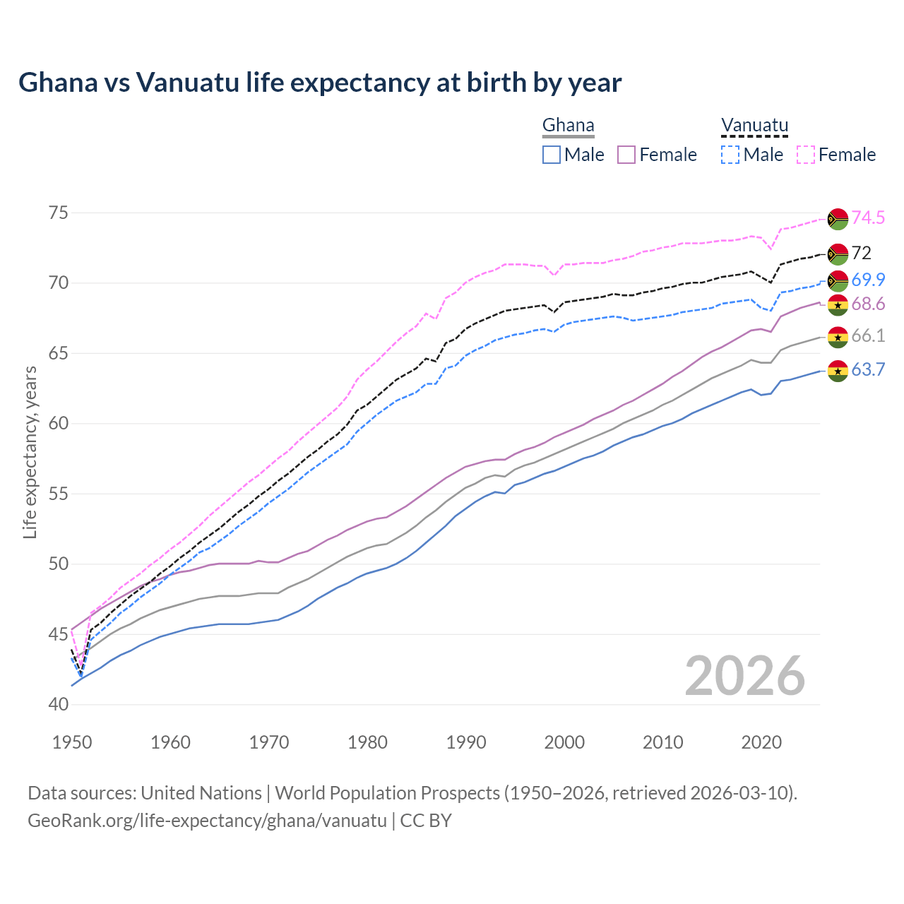 The average life expectancy at birth is 66.1 years in Ghana vs 72 in Vanuatu. Ghana is ranked 169/197 by life expectancy, and Vanuatu is 125/197. In Ghana, the life expectancy is 63.7 years for males and 68.6 years for females. In Vanuatu, it's 69.9 years for males and 74.5 years for females.
