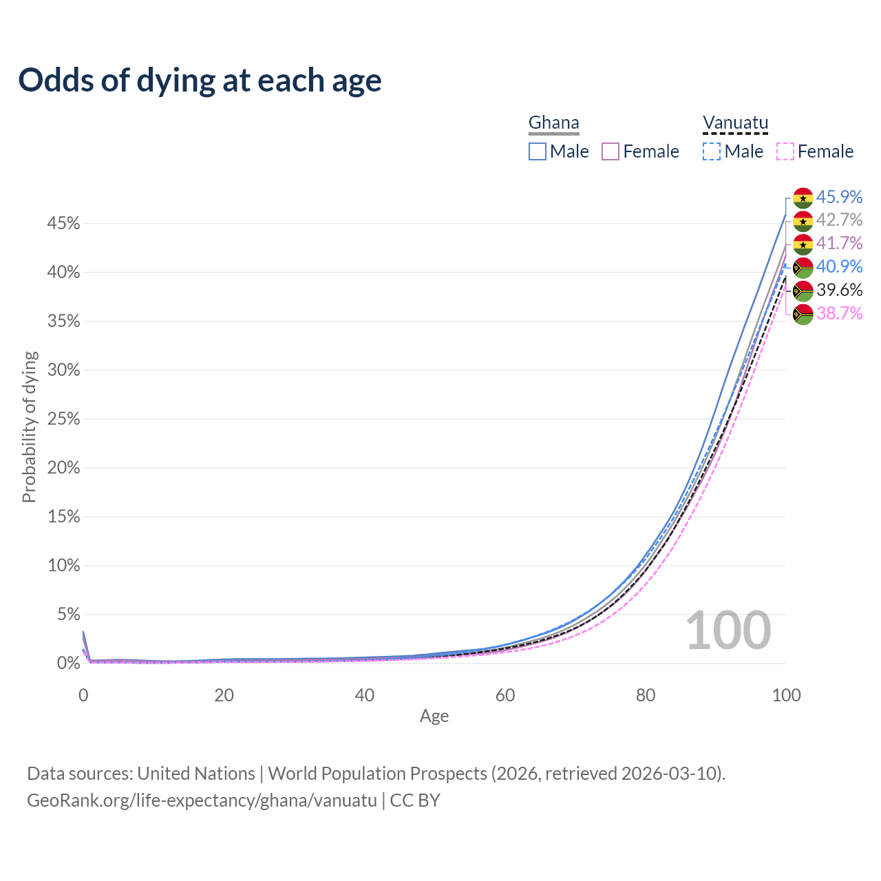 This life expectancy calculator shows the odds of living to 100, 95, 90, and below based on current age for both males and females in Ghana and Vanuatu, along with mean and median age of death. The calculations are based on the 2026 life tables (actuarial tables) from the UN World Population Prospects.