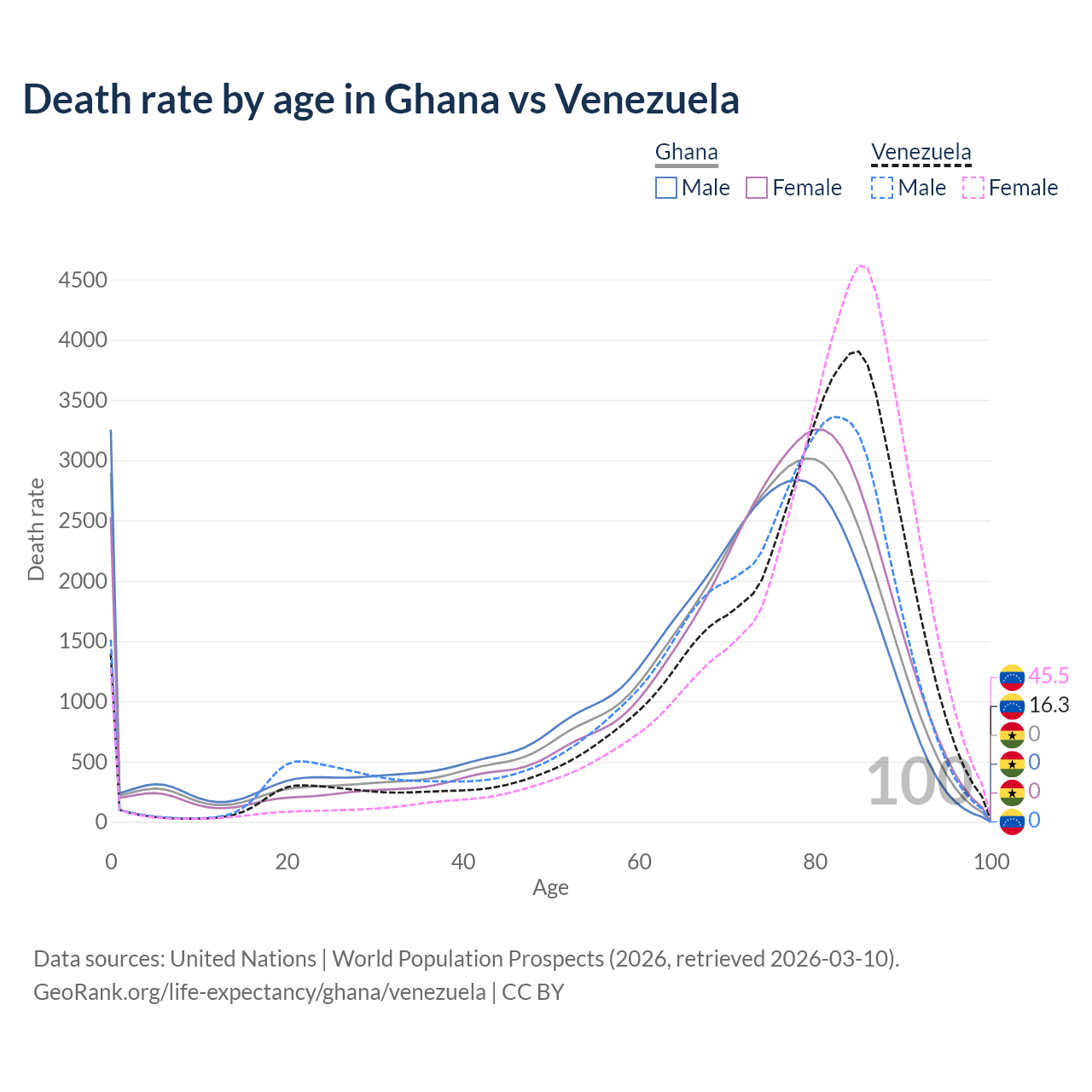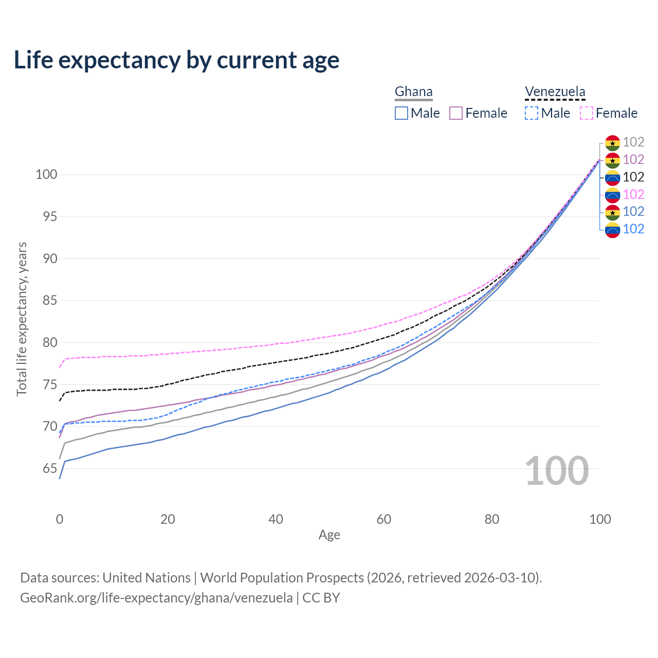 This life expectancy calculator shows the odds of living to 100, 95, 90, and below based on current age for both males and females in Ghana and Venezuela, along with mean and median age of death. The calculations are based on the 2026 life tables (actuarial tables) from the UN World Population Prospects.