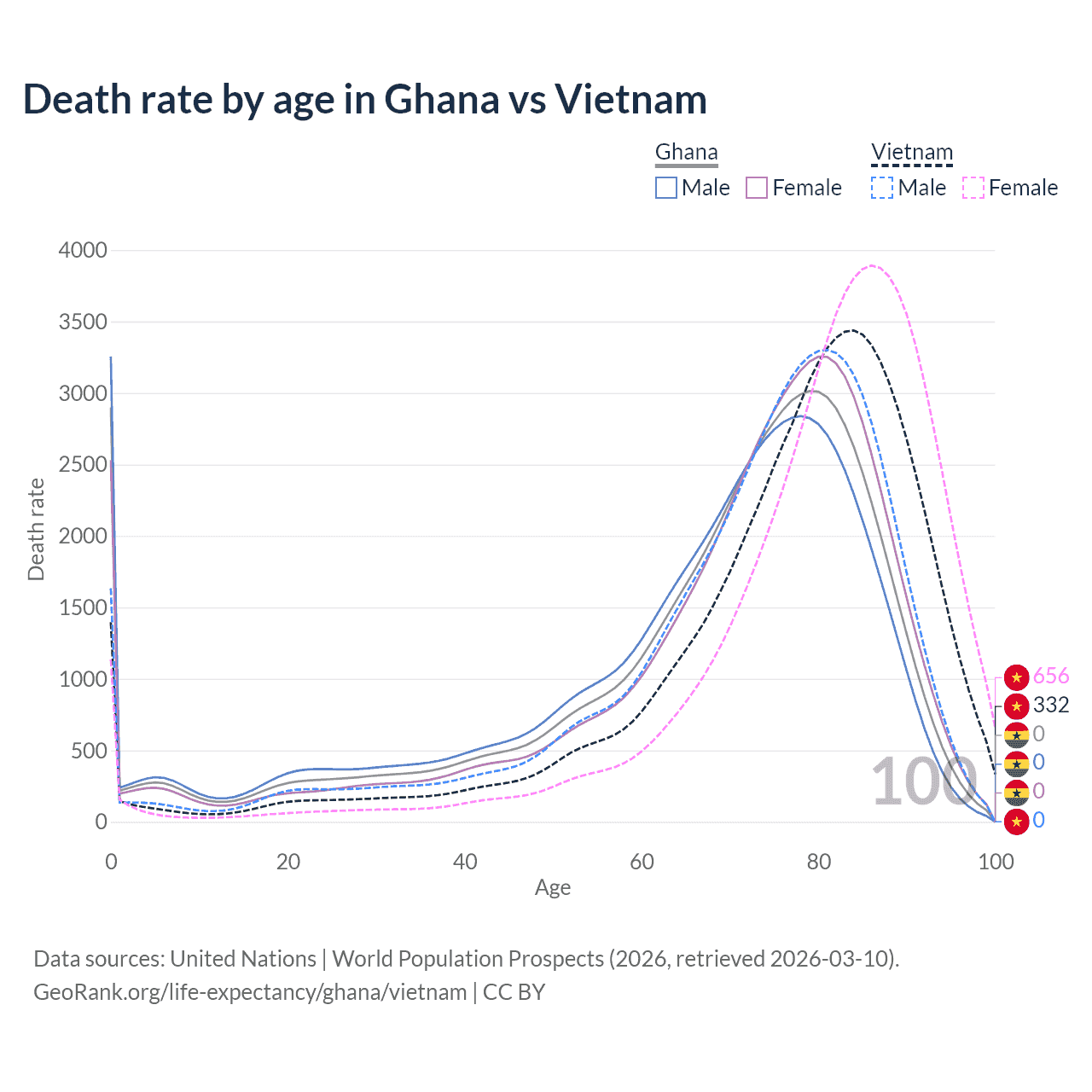 Note that this chart does not show rates per 100,000 population, as those would be skewed by age structure differences and reflect the demographics of Ghana and Vietnam more than their death rates.