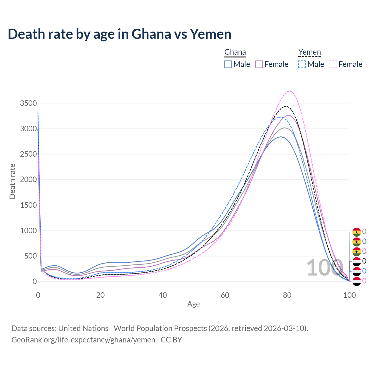 Note that this chart does not show rates per 100,000 population, as those would be skewed by age structure differences and reflect the demographics of Ghana and Yemen more than their death rates.
