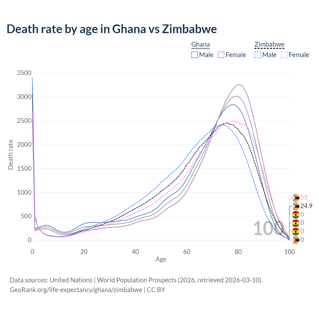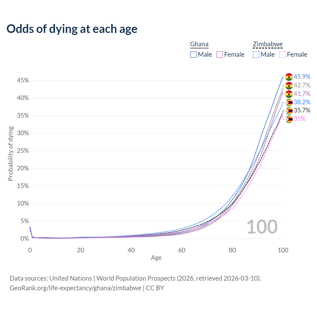 This life expectancy calculator shows the odds of living to 100, 95, 90, and below based on current age for both males and females in Ghana and Zimbabwe, along with mean and median age of death. The calculations are based on the 2026 life tables (actuarial tables) from the UN World Population Prospects.