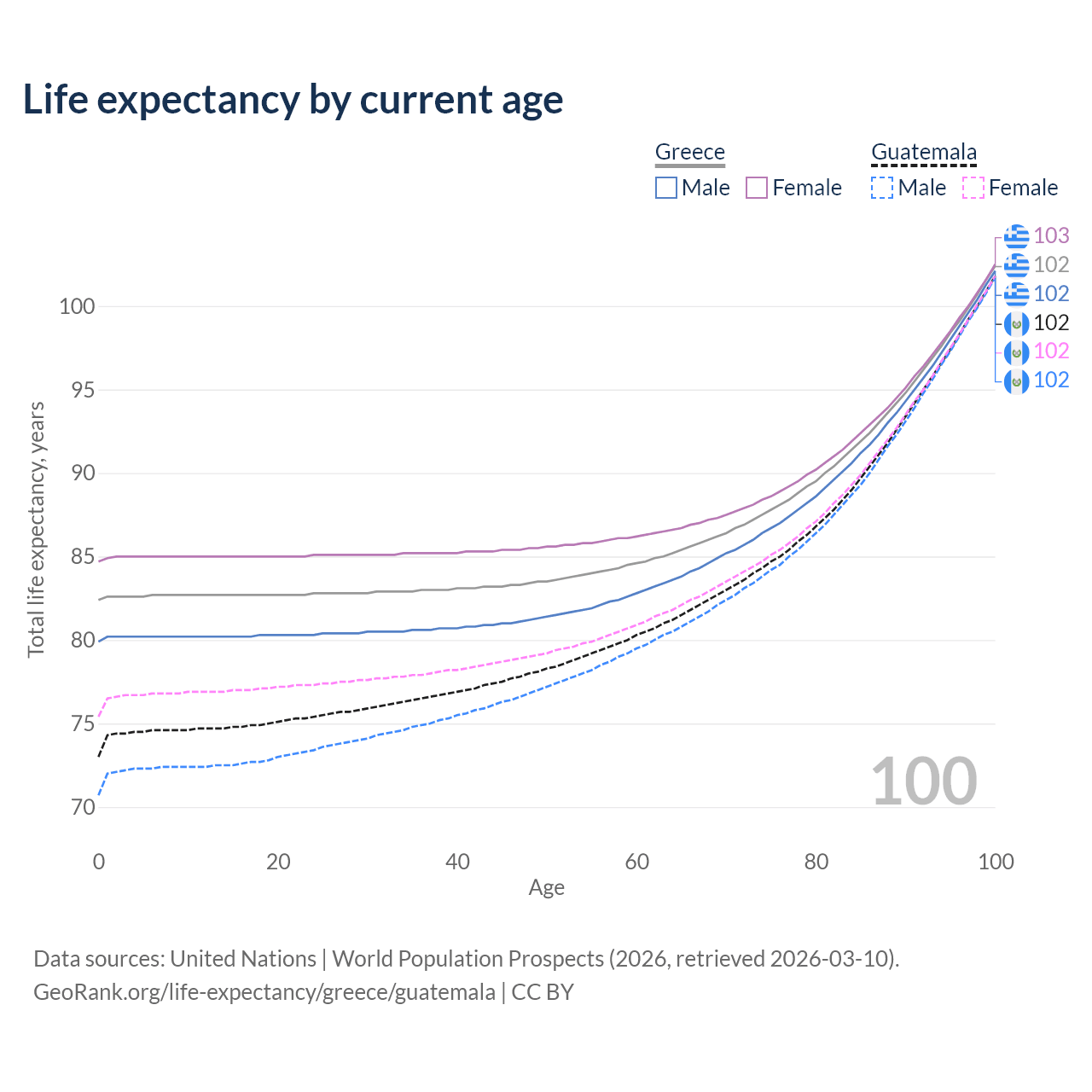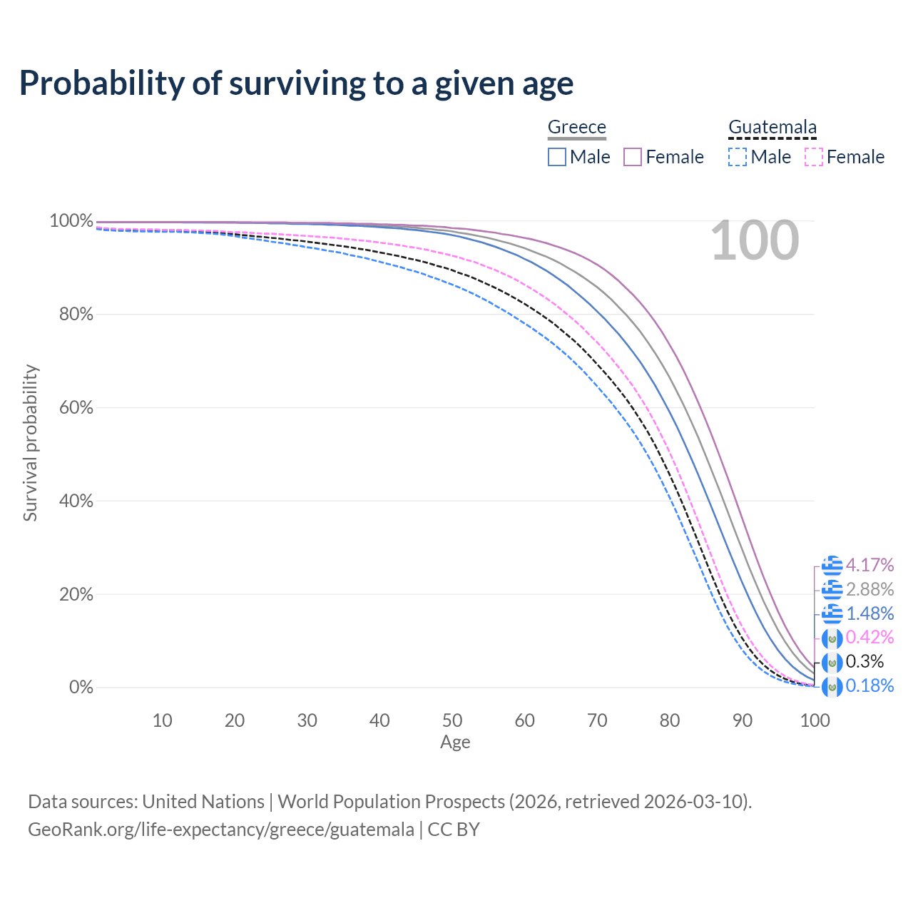This life expectancy calculator shows the odds of living to 100, 95, 90, and below based on current age for both males and females in Greece and Guatemala, along with mean and median age of death. The calculations are based on the 2026 life tables (actuarial tables) from the UN World Population Prospects.
