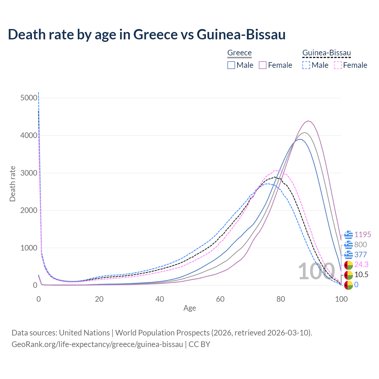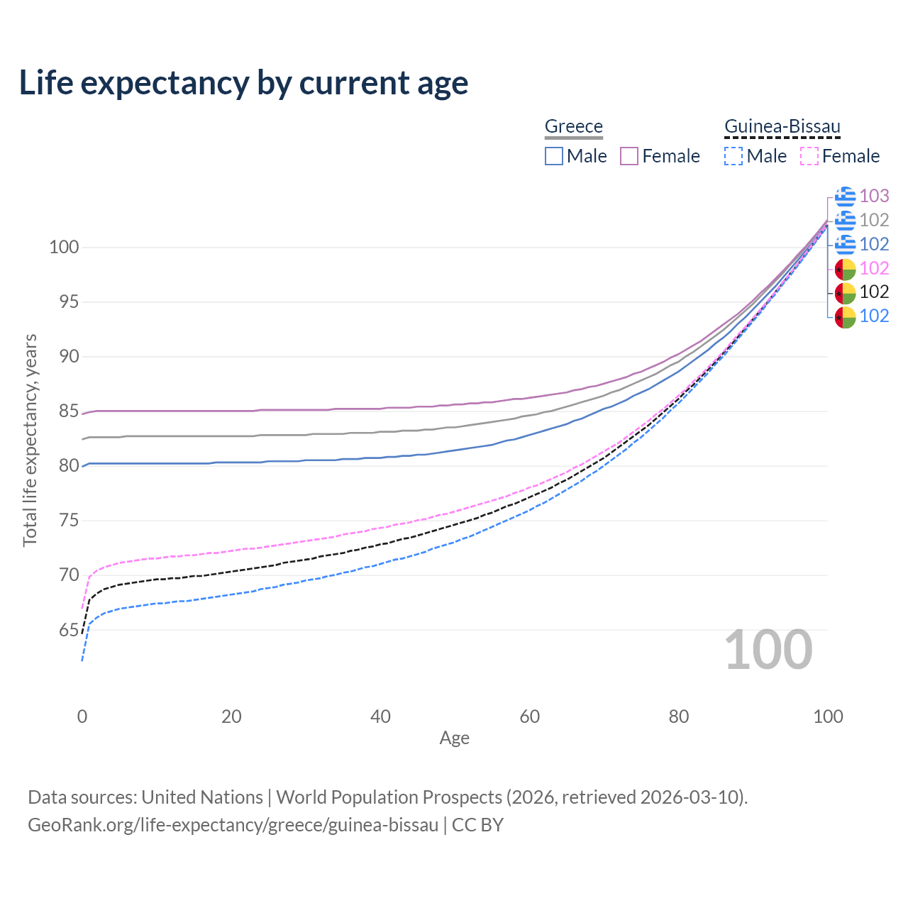 This life expectancy calculator shows the odds of living to 100, 95, 90, and below based on current age for both males and females in Greece and Guinea-Bissau, along with mean and median age of death. The calculations are based on the 2026 life tables (actuarial tables) from the UN World Population Prospects.
