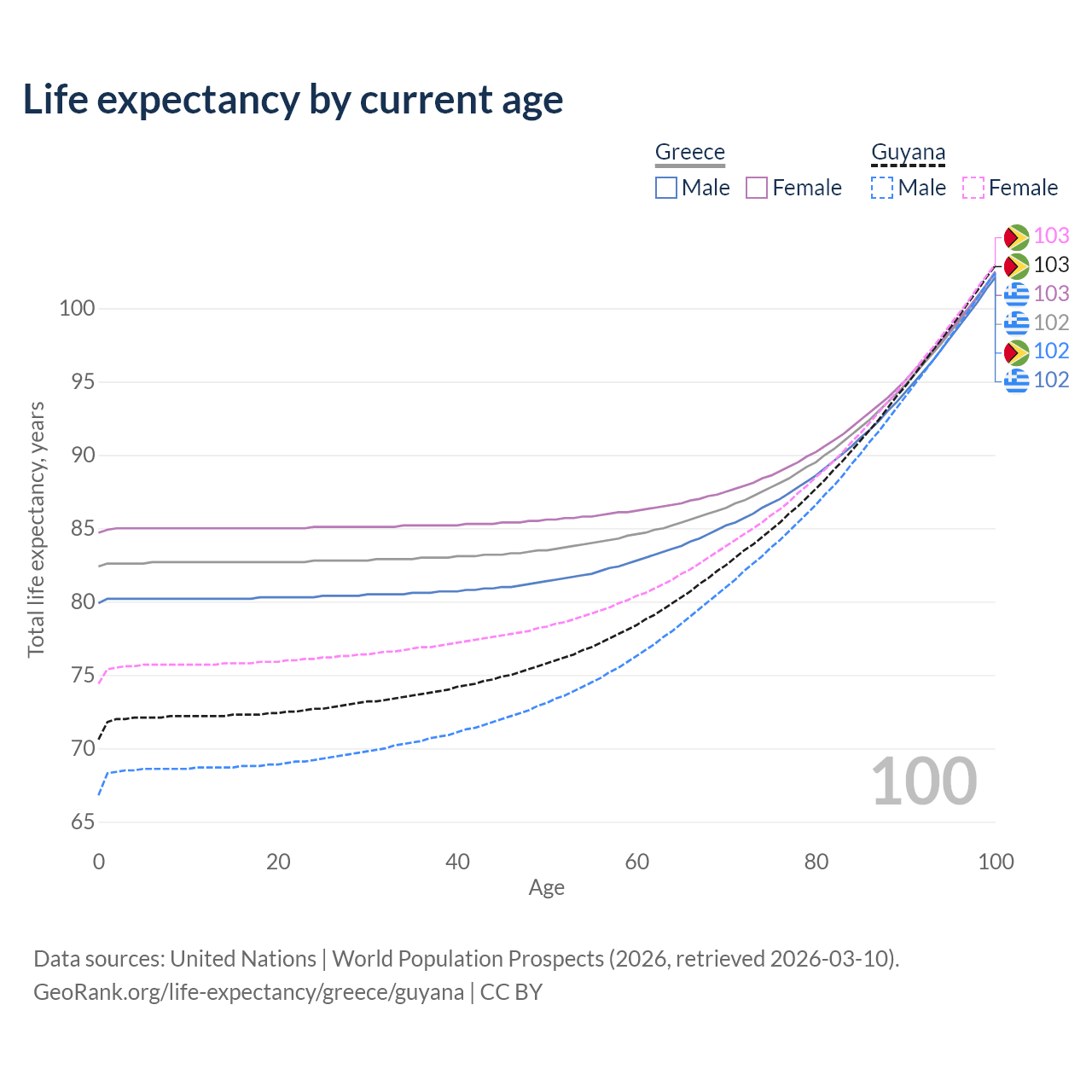 This life expectancy calculator shows the odds of living to 100, 95, 90, and below based on current age for both males and females in Greece and Guyana, along with mean and median age of death. The calculations are based on the 2026 life tables (actuarial tables) from the UN World Population Prospects.