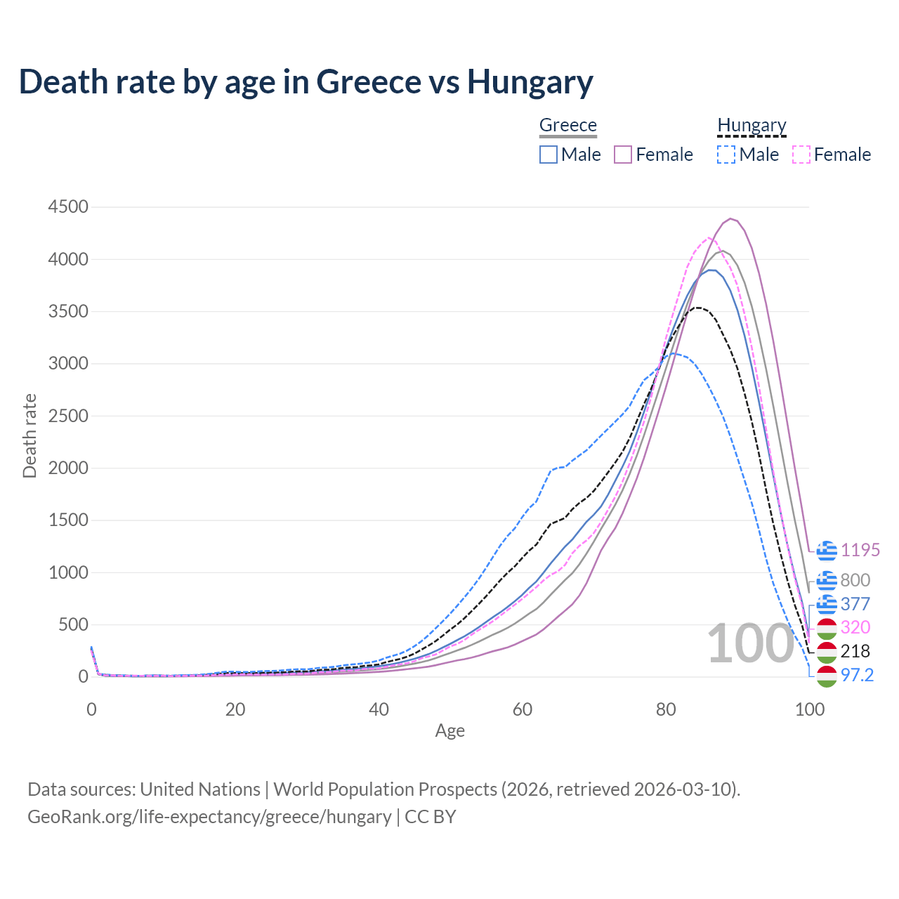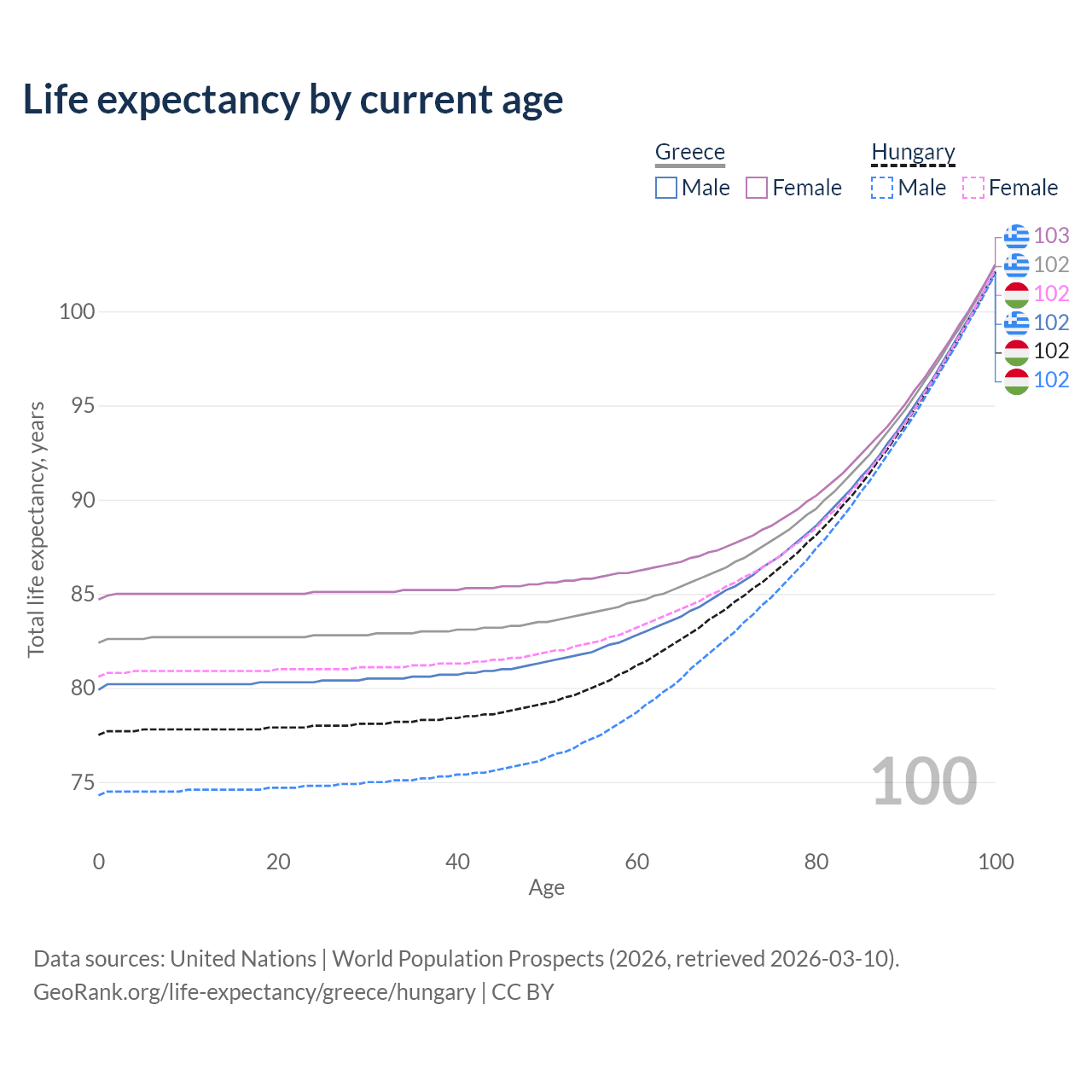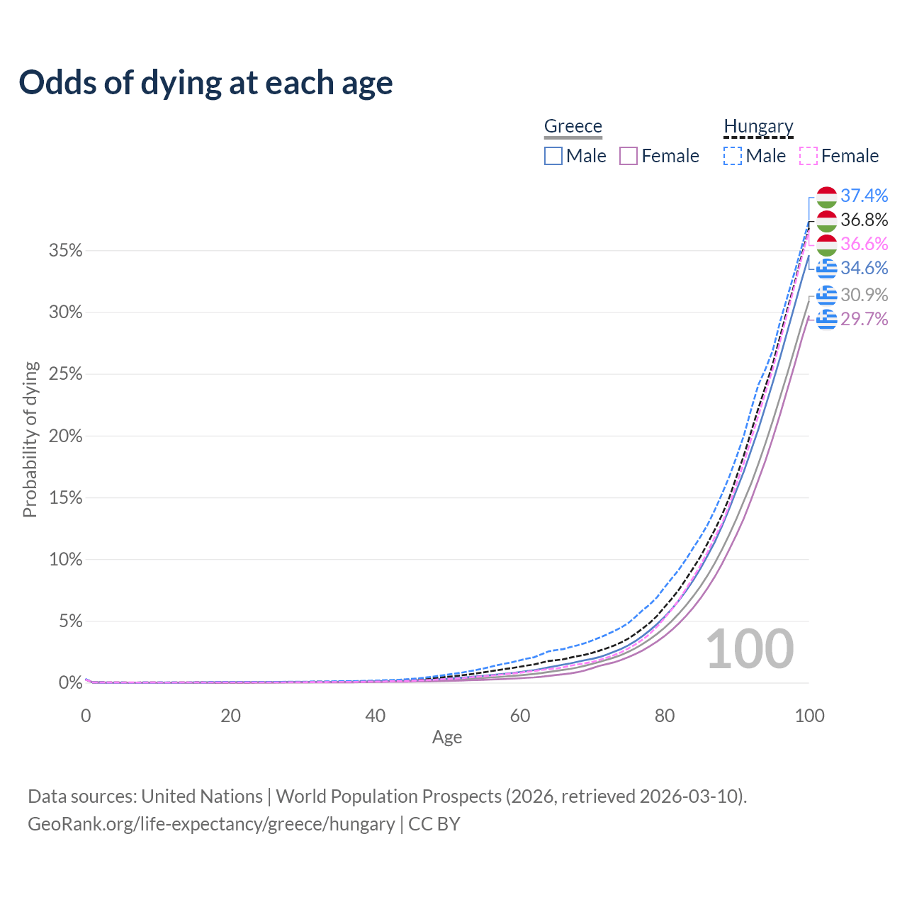 This life expectancy calculator shows the odds of living to 100, 95, 90, and below based on current age for both males and females in Greece and Hungary, along with mean and median age of death. The calculations are based on the 2026 life tables (actuarial tables) from the UN World Population Prospects.