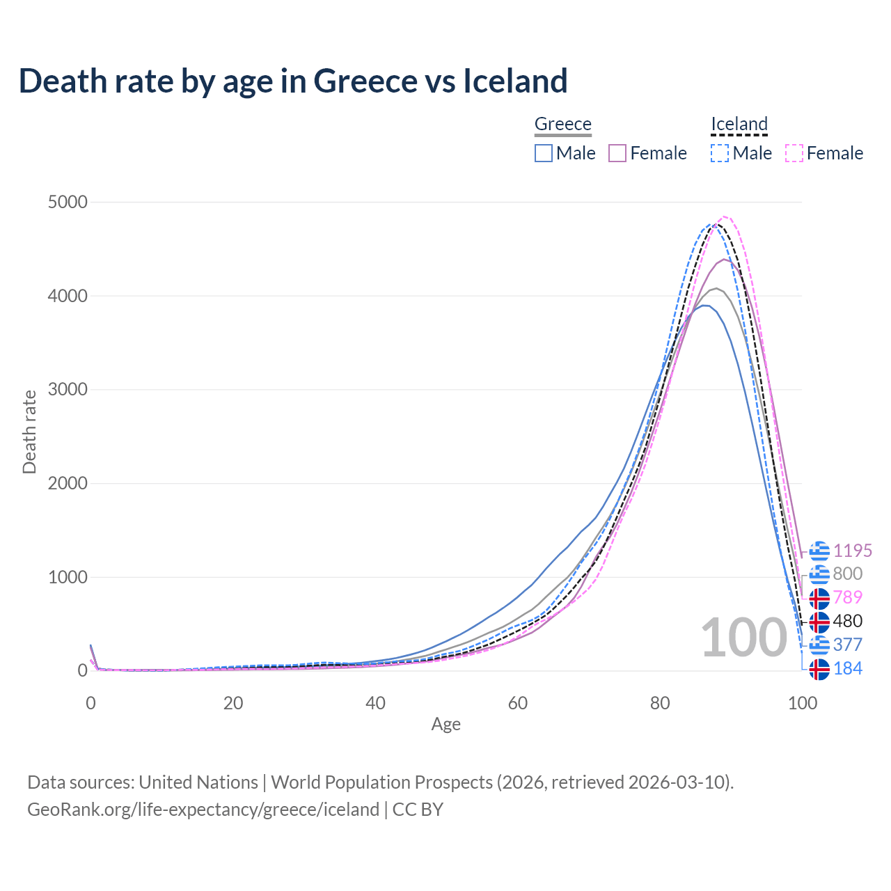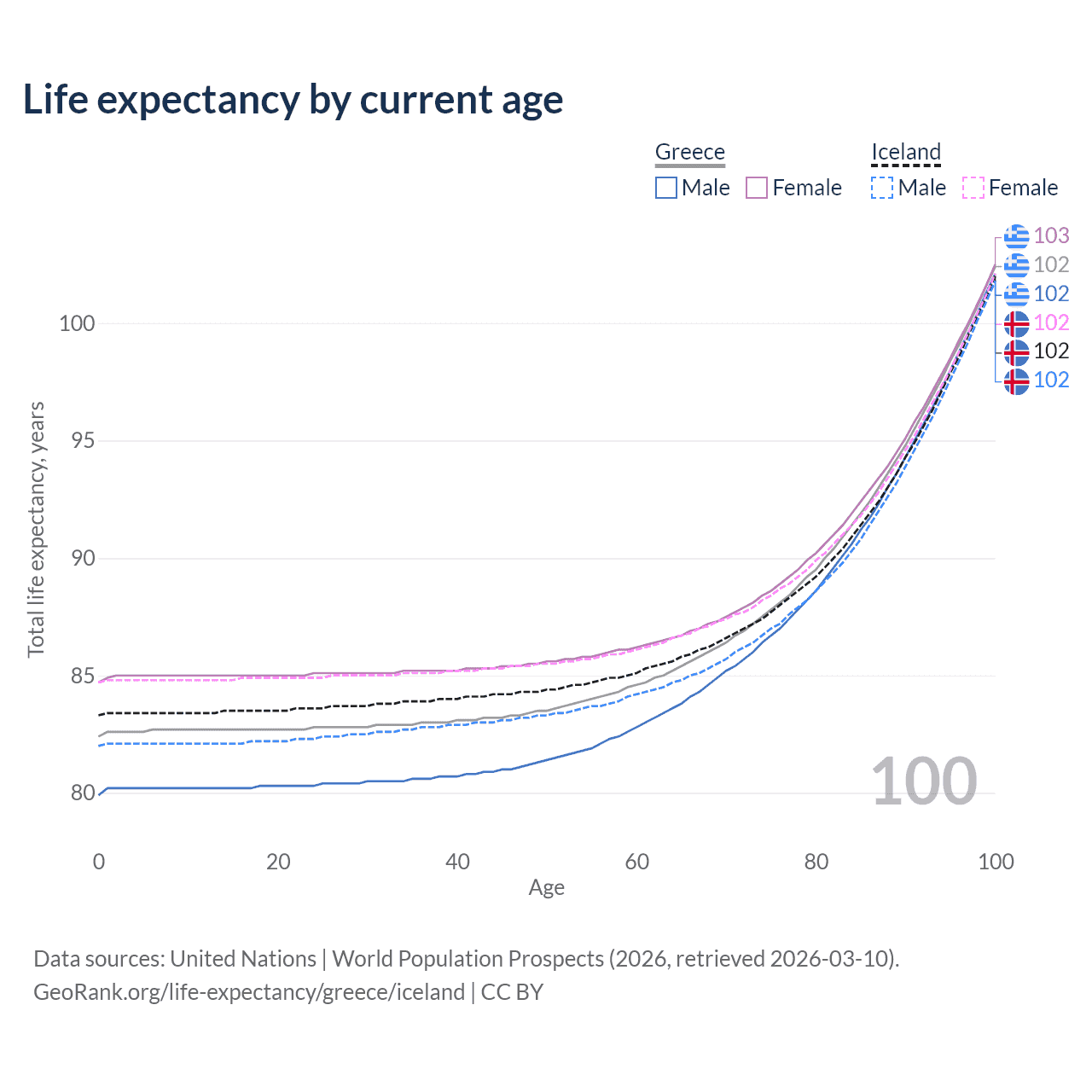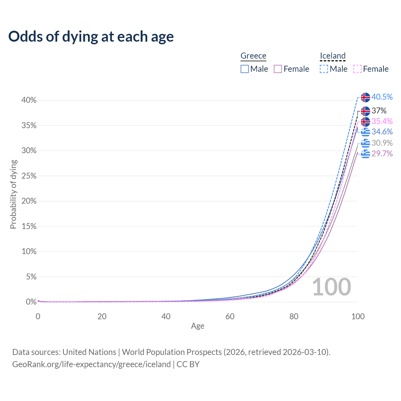 This life expectancy calculator shows the odds of living to 100, 95, 90, and below based on current age for both males and females in Greece and Iceland, along with mean and median age of death. The calculations are based on the 2026 life tables (actuarial tables) from the UN World Population Prospects.