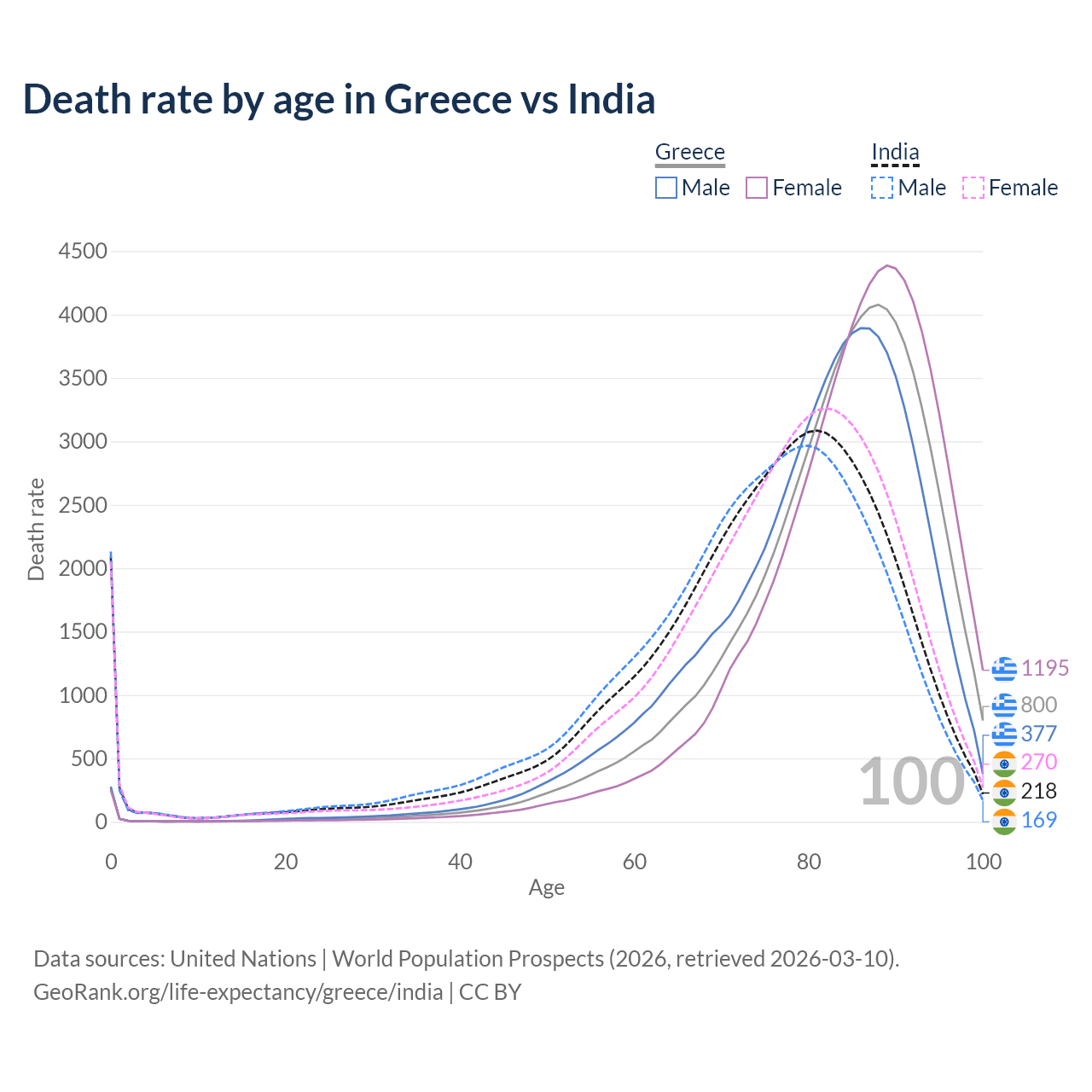 In Greece, the most common age of death is 88, compared to 81 in India. The median age of death is 84.9 in Greece and 76.8 in India, meaning only half of each cohort is expected to live past that age.