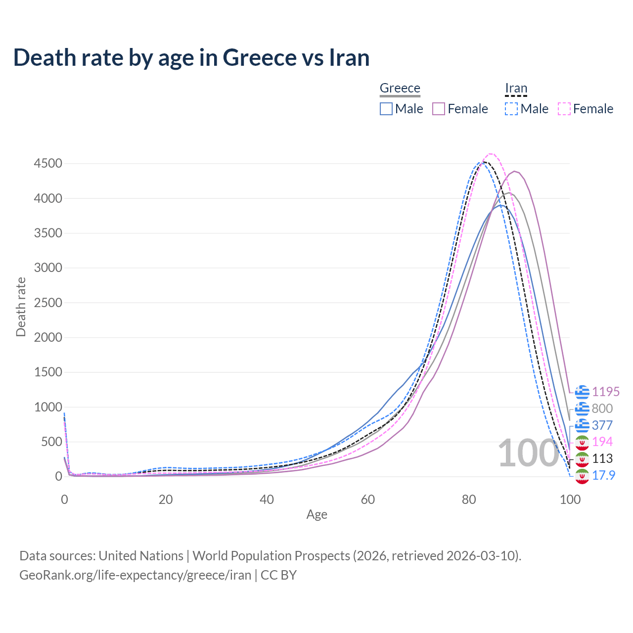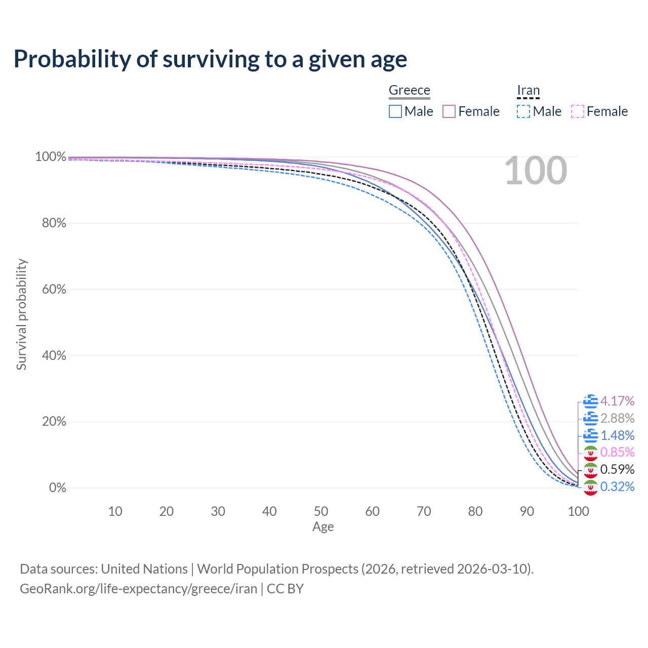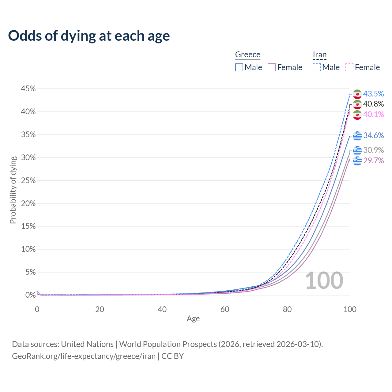 This life expectancy calculator shows the odds of living to 100, 95, 90, and below based on current age for both males and females in Greece and Iran, along with mean and median age of death. The calculations are based on the 2026 life tables (actuarial tables) from the UN World Population Prospects.
