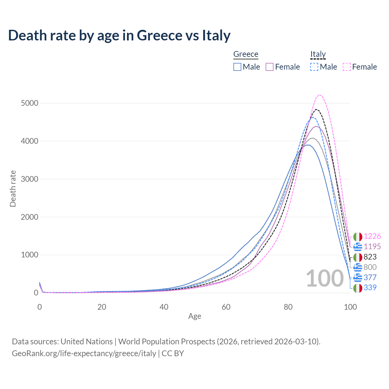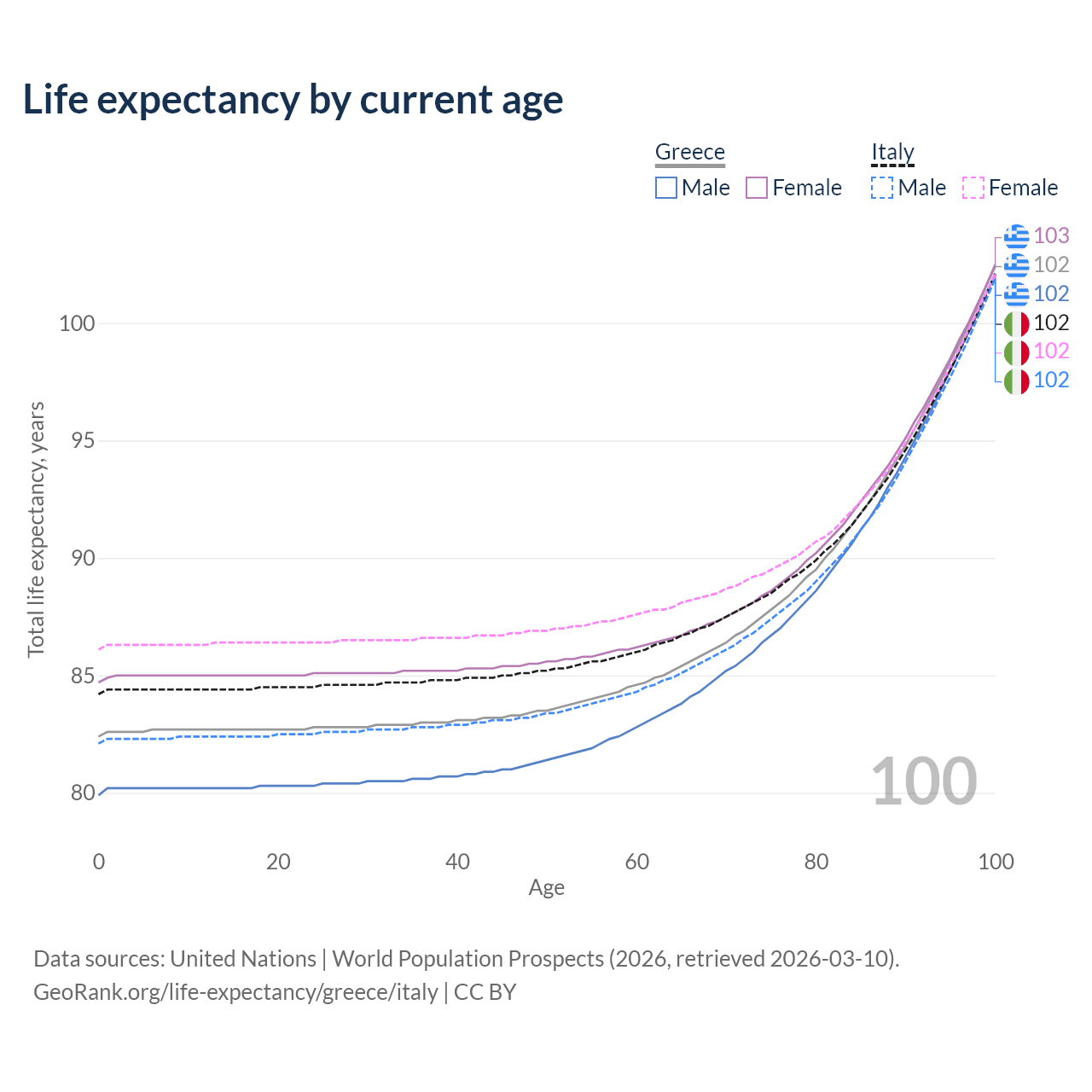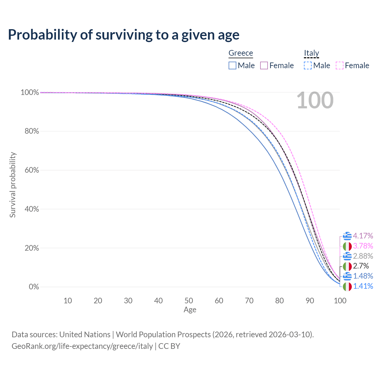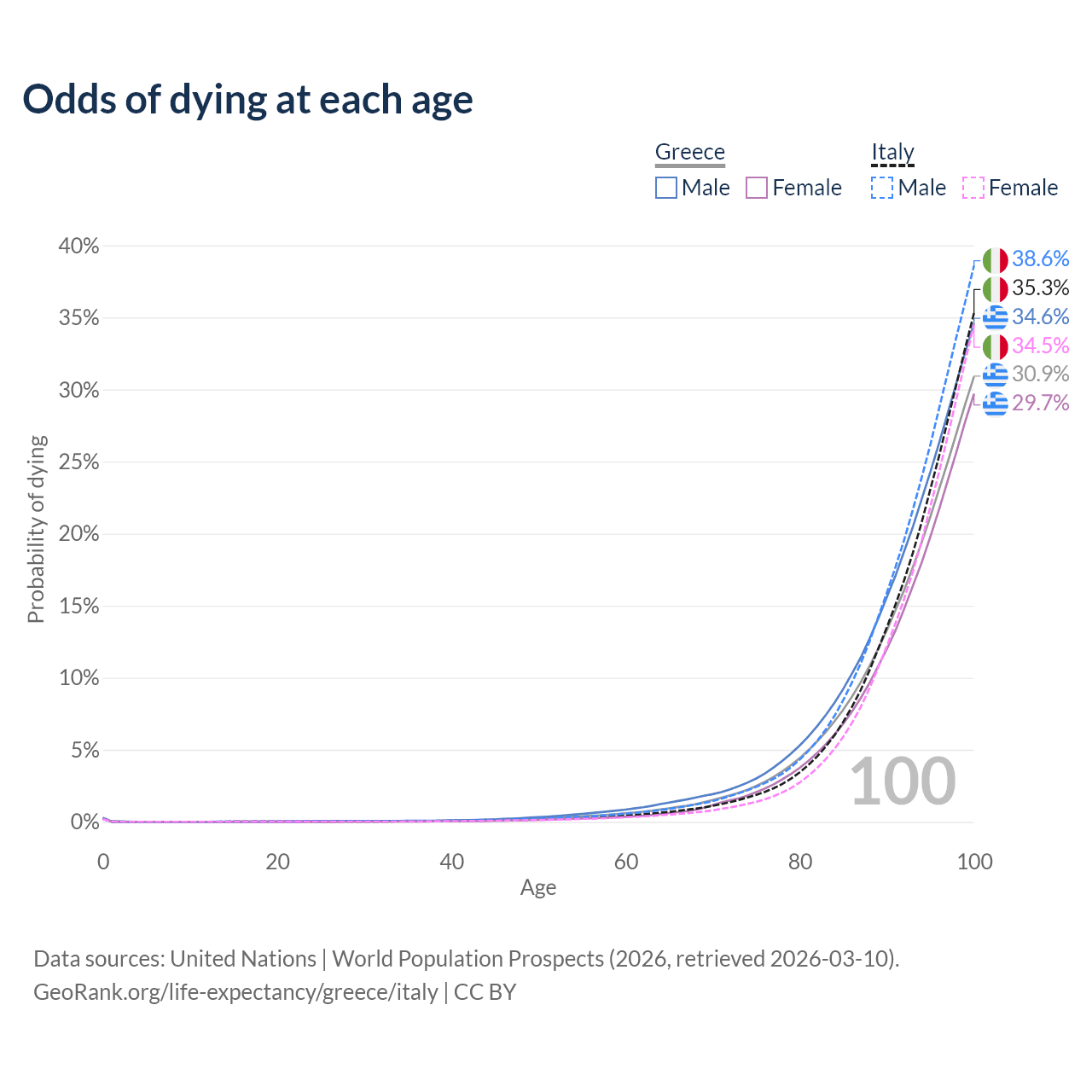 This life expectancy calculator shows the odds of living to 100, 95, 90, and below based on current age for both males and females in Greece and Italy, along with mean and median age of death. The calculations are based on the 2026 life tables (actuarial tables) from the UN World Population Prospects.