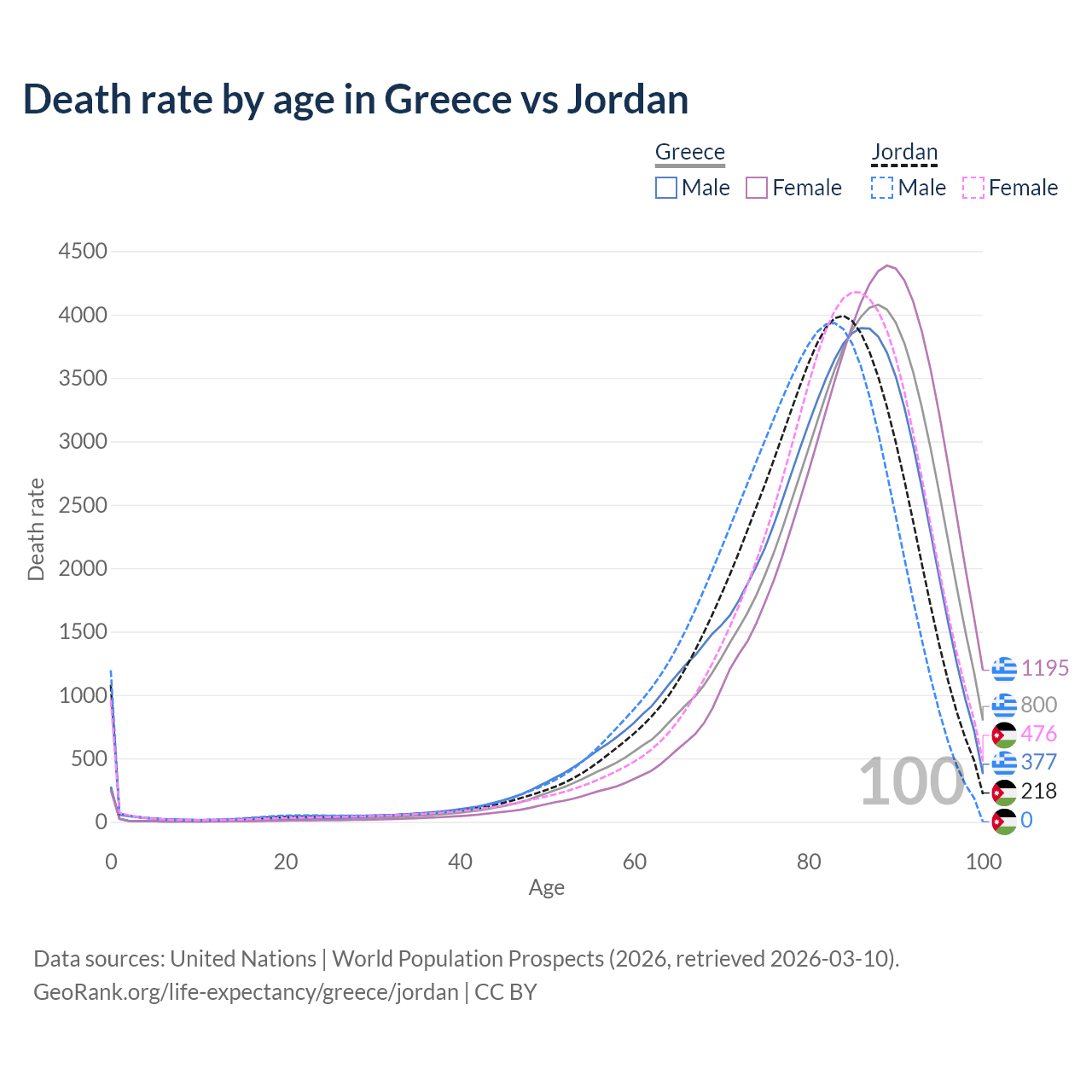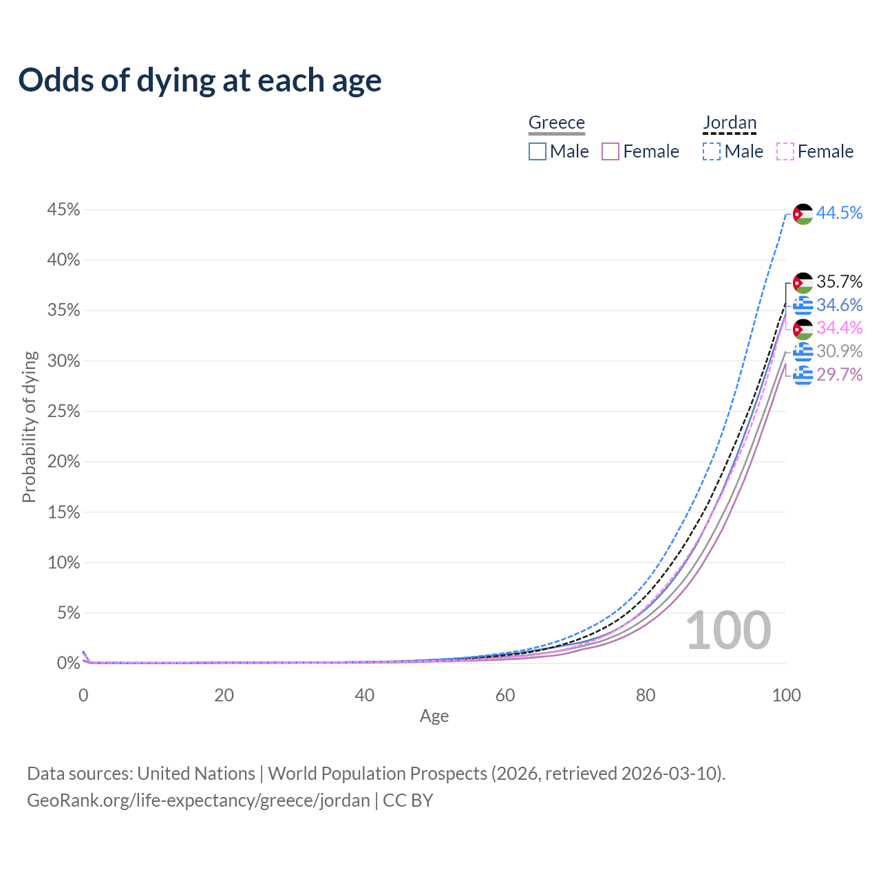 This life expectancy calculator shows the odds of living to 100, 95, 90, and below based on current age for both males and females in Greece and Jordan, along with mean and median age of death. The calculations are based on the 2026 life tables (actuarial tables) from the UN World Population Prospects.