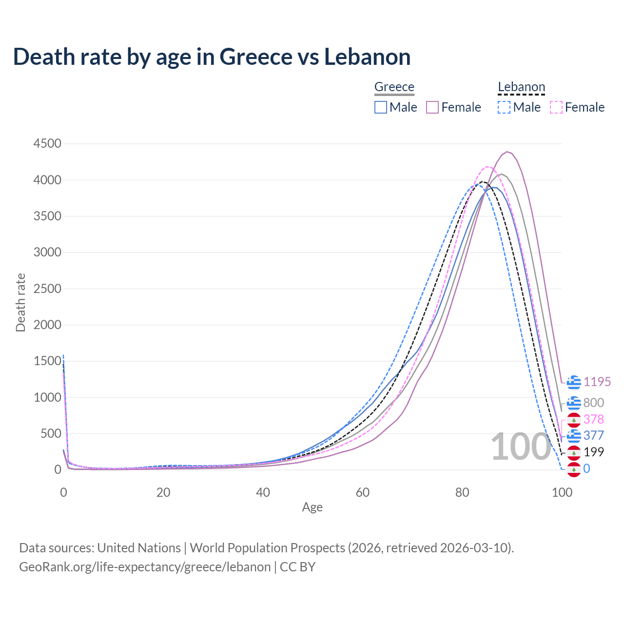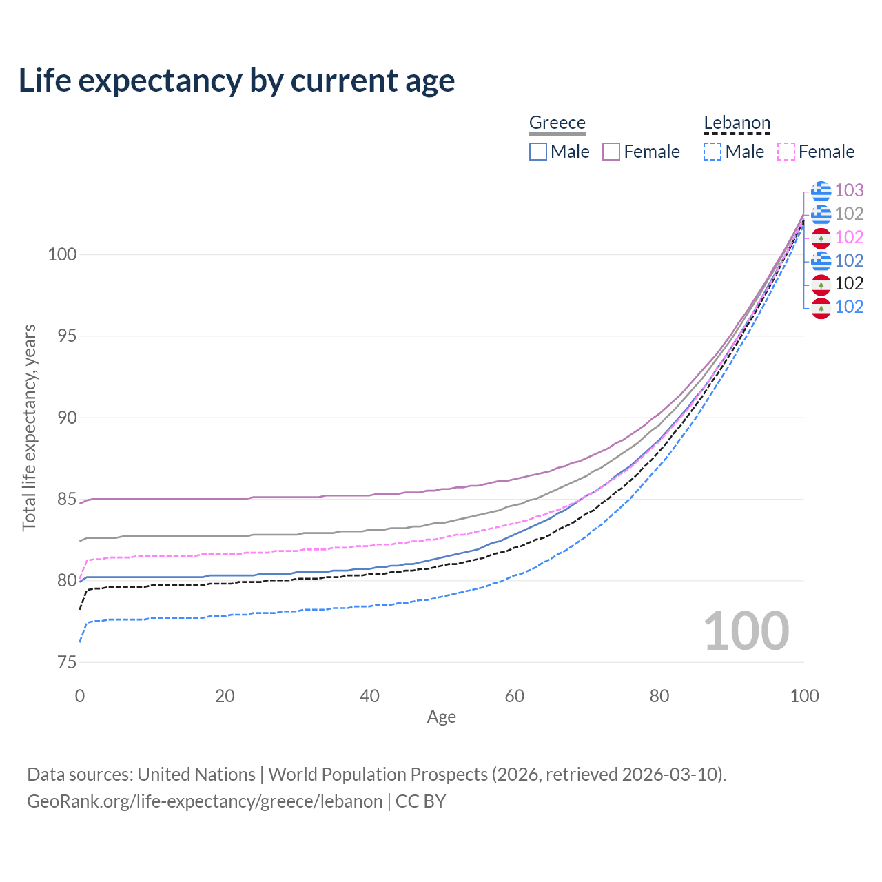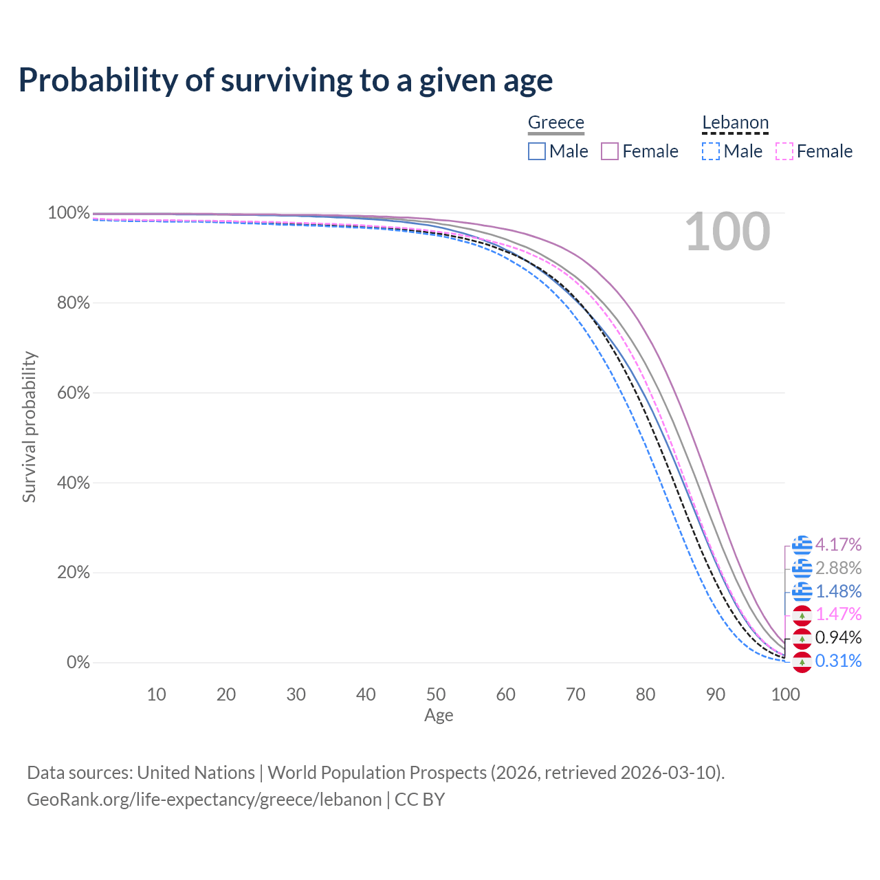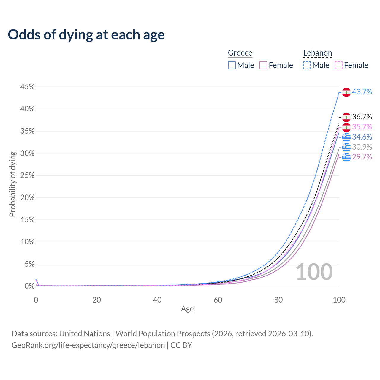 This life expectancy calculator shows the odds of living to 100, 95, 90, and below based on current age for both males and females in Greece and Lebanon, along with mean and median age of death. The calculations are based on the 2026 life tables (actuarial tables) from the UN World Population Prospects.