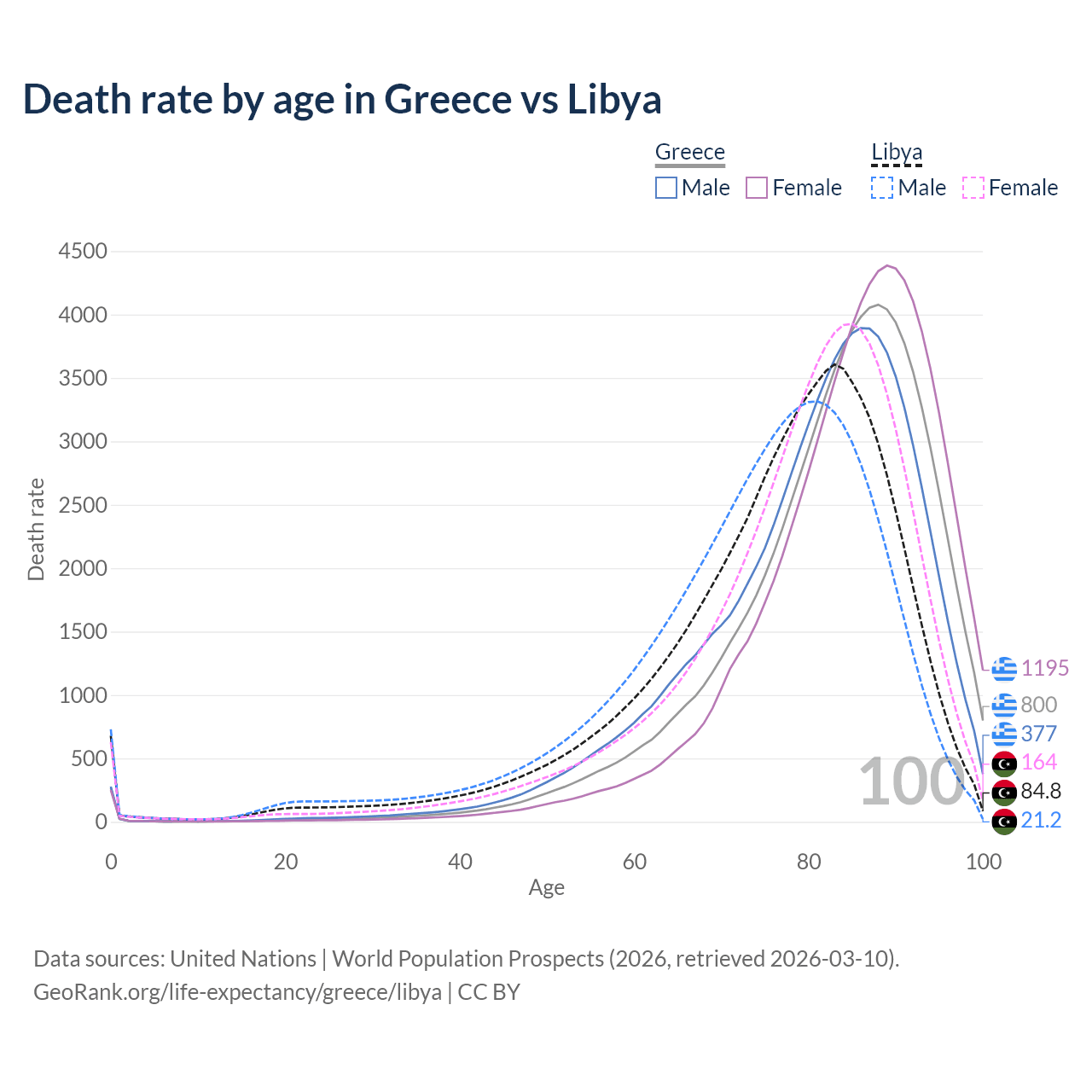 In Greece, the most common age of death is 88, compared to 83 in Libya. The median age of death is 84.9 in Greece and 78.8 in Libya, meaning only half of each cohort is expected to live past that age.
