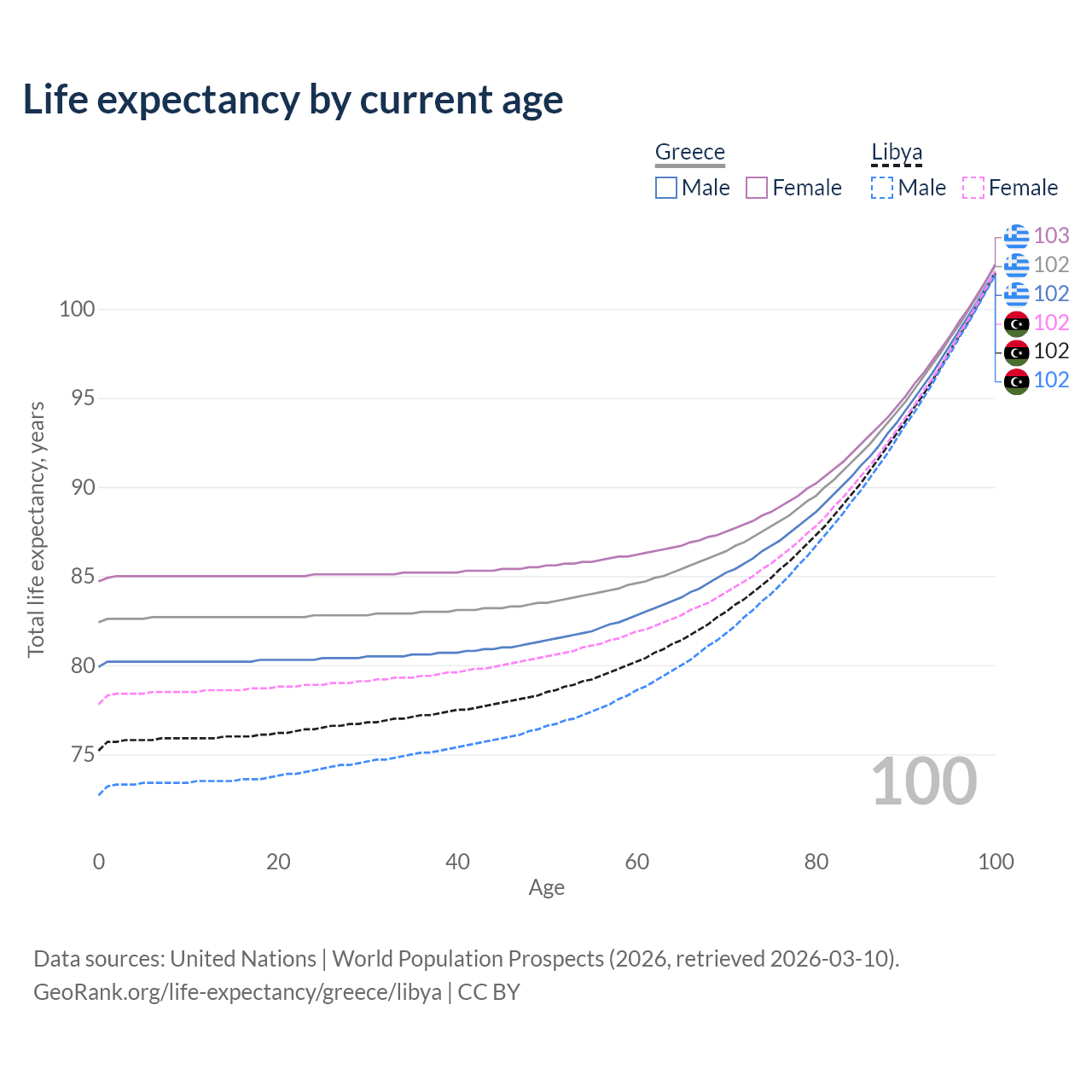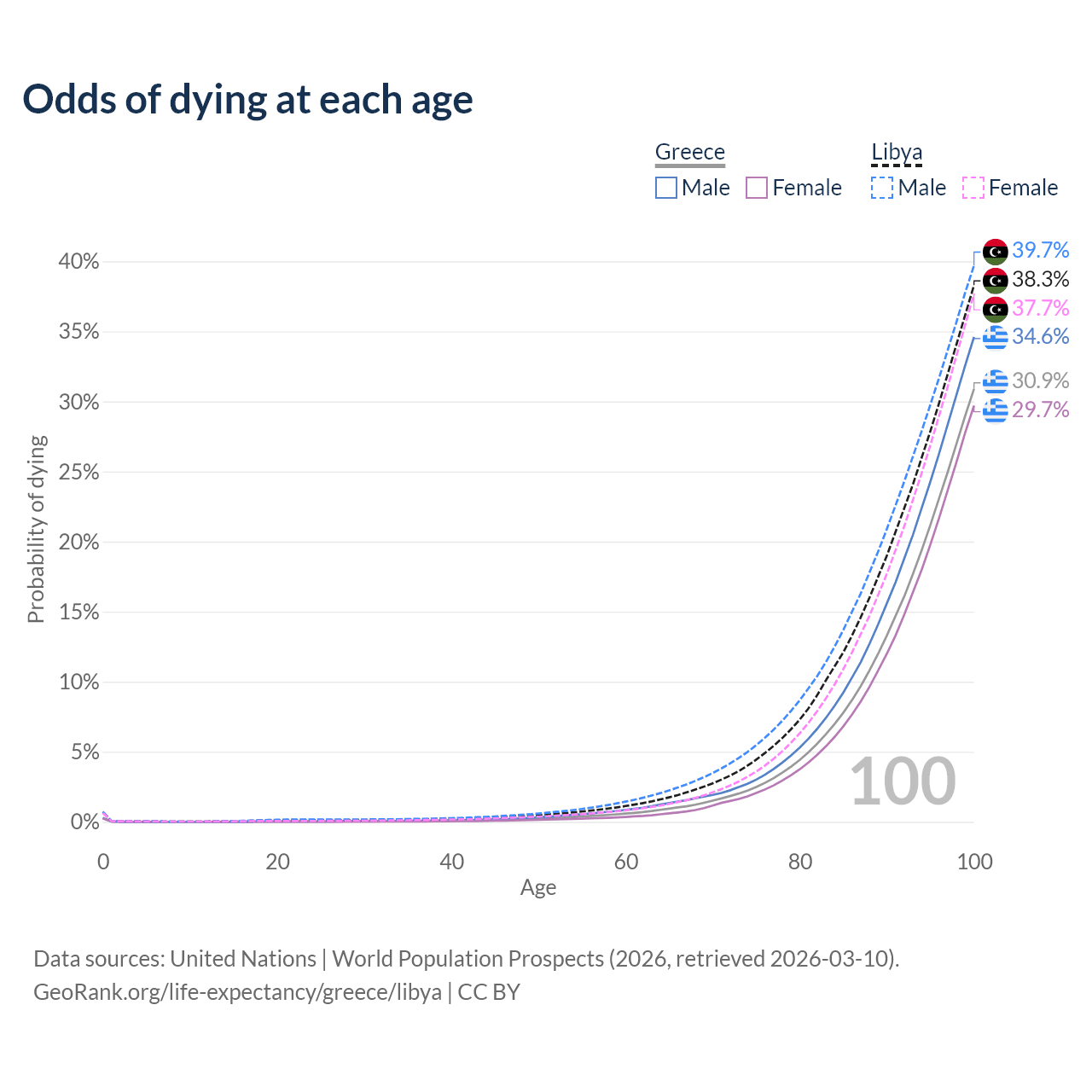 This life expectancy calculator shows the odds of living to 100, 95, 90, and below based on current age for both males and females in Greece and Libya, along with mean and median age of death. The calculations are based on the 2026 life tables (actuarial tables) from the UN World Population Prospects.