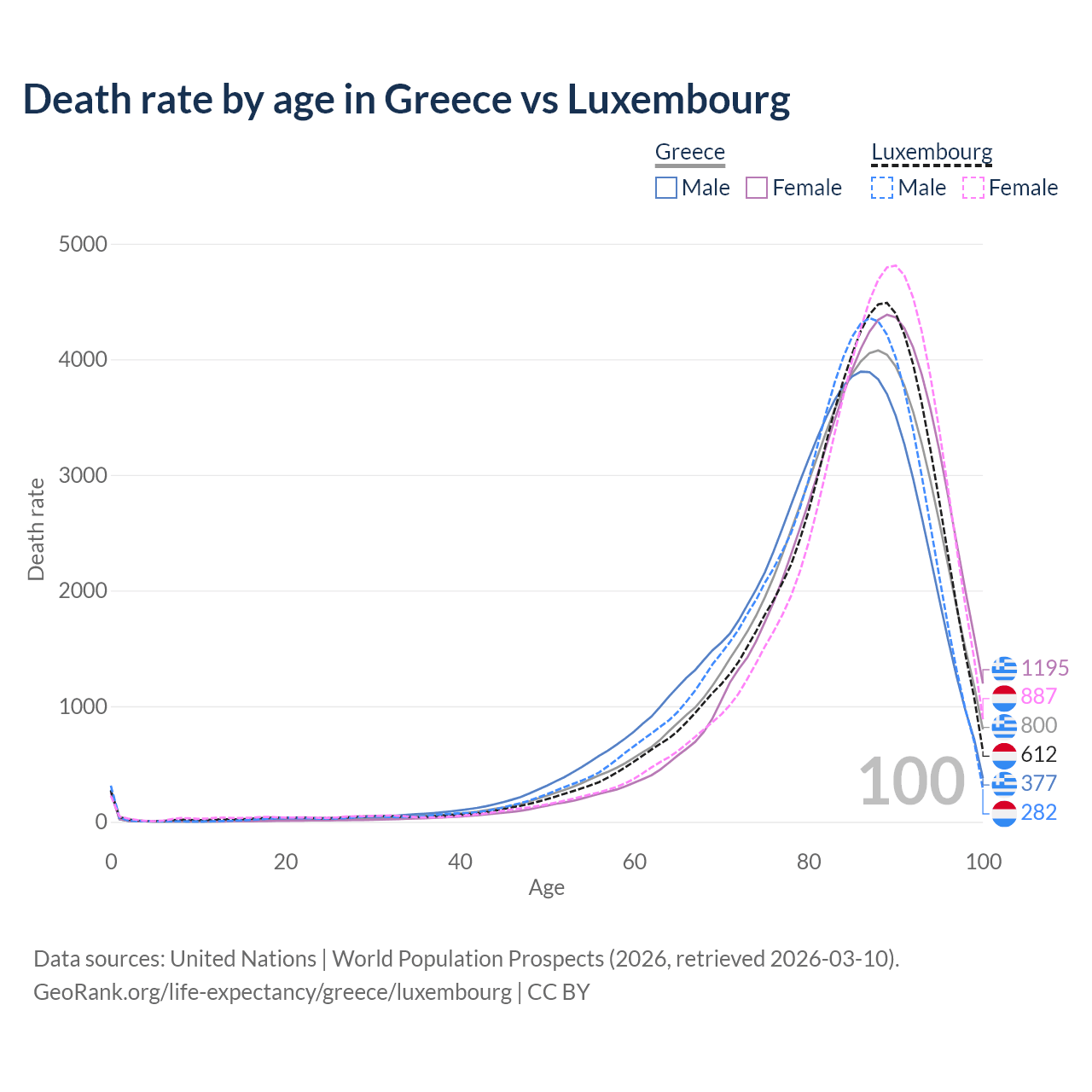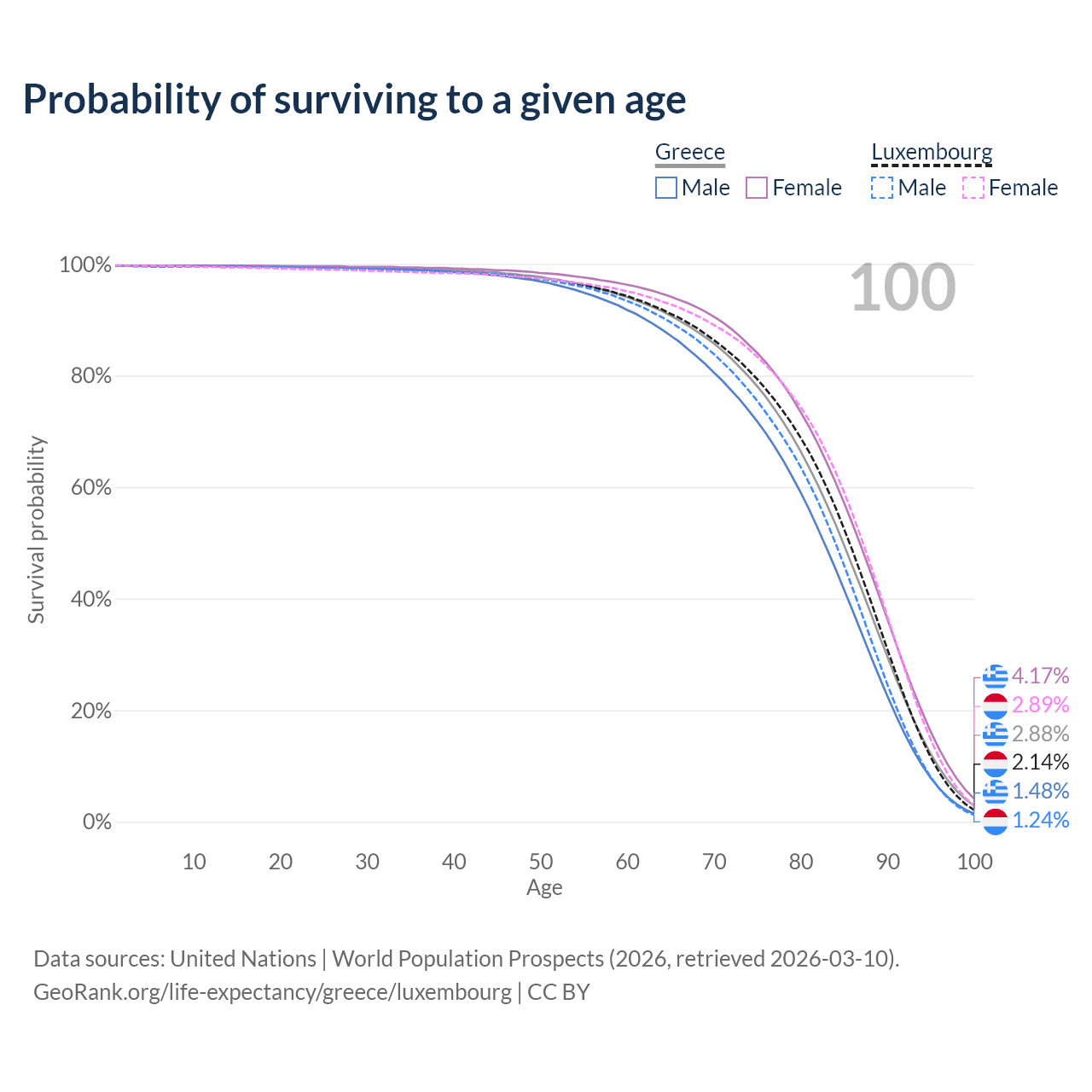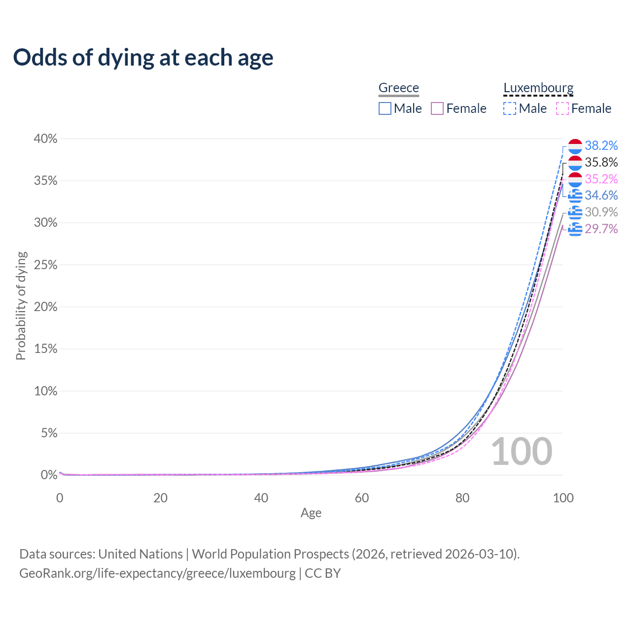 This life expectancy calculator shows the odds of living to 100, 95, 90, and below based on current age for both males and females in Greece and Luxembourg, along with mean and median age of death. The calculations are based on the 2026 life tables (actuarial tables) from the UN World Population Prospects.
