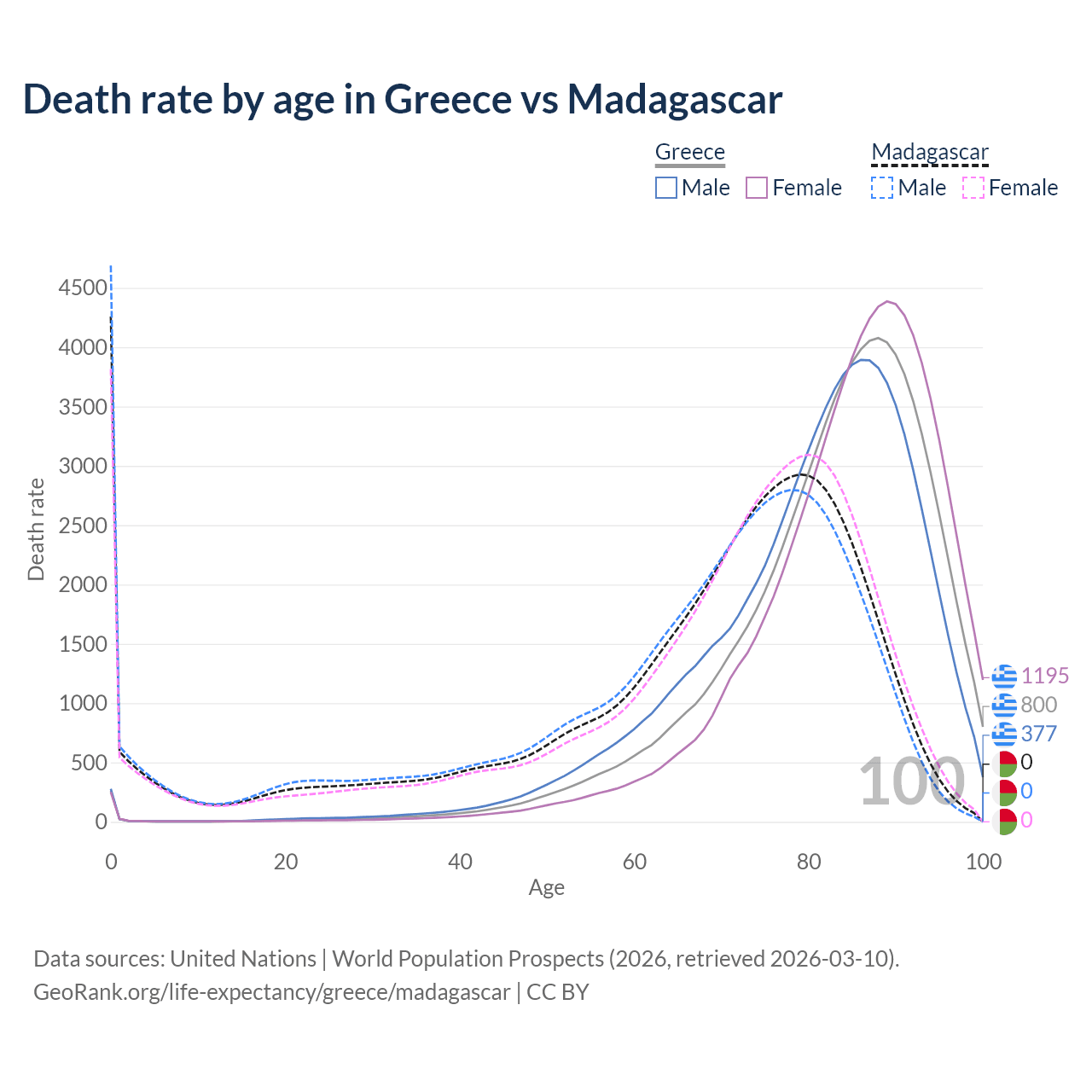 In Greece, the most common age of death is 88, compared to 0 in Madagascar. The median age of death is 84.9 in Greece and 72.2 in Madagascar, meaning only half of each cohort is expected to live past that age.