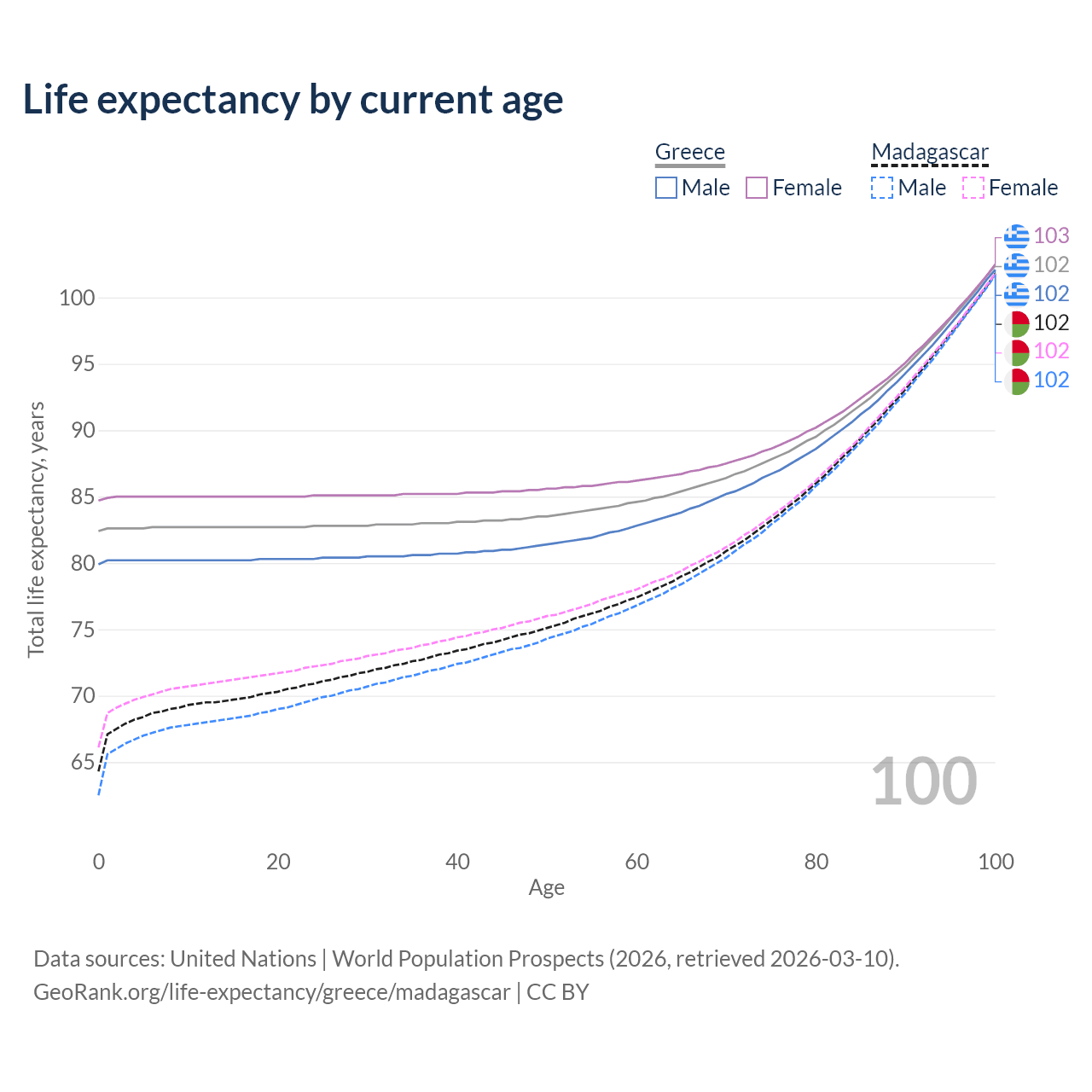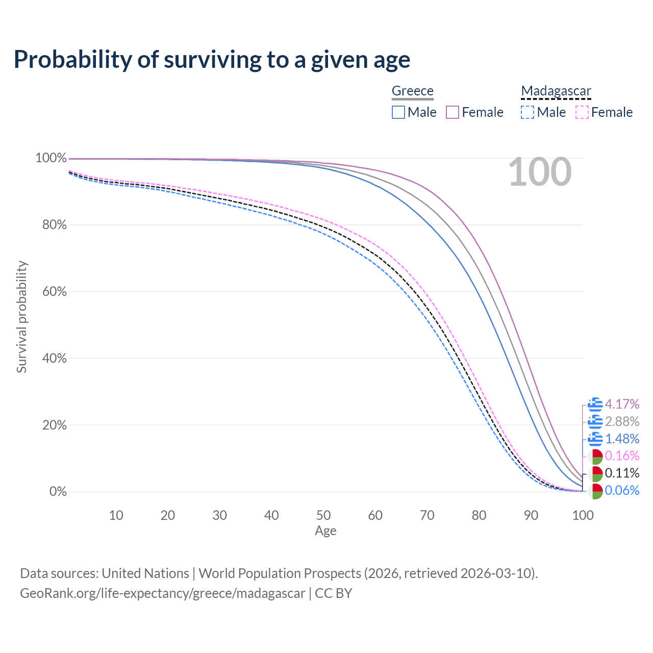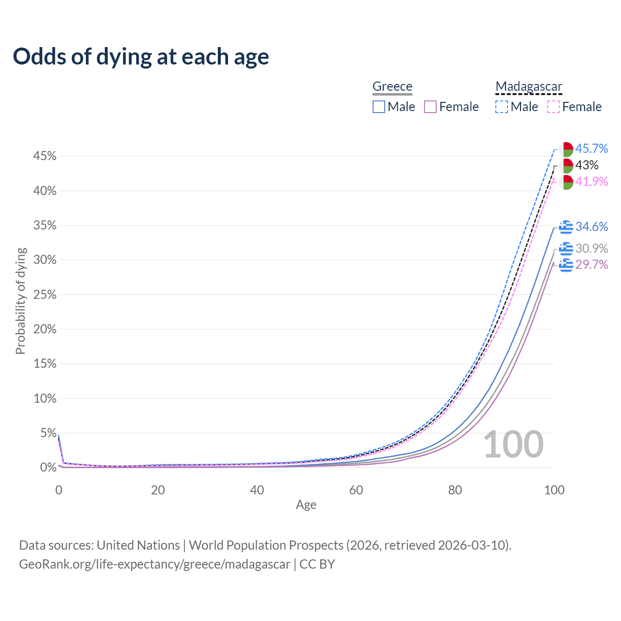 This life expectancy calculator shows the odds of living to 100, 95, 90, and below based on current age for both males and females in Greece and Madagascar, along with mean and median age of death. The calculations are based on the 2026 life tables (actuarial tables) from the UN World Population Prospects.