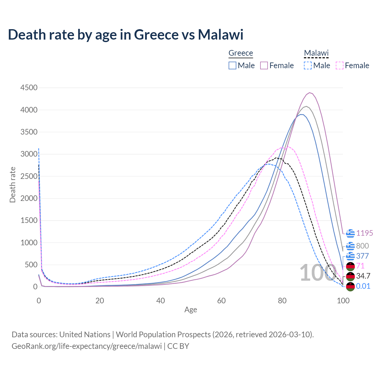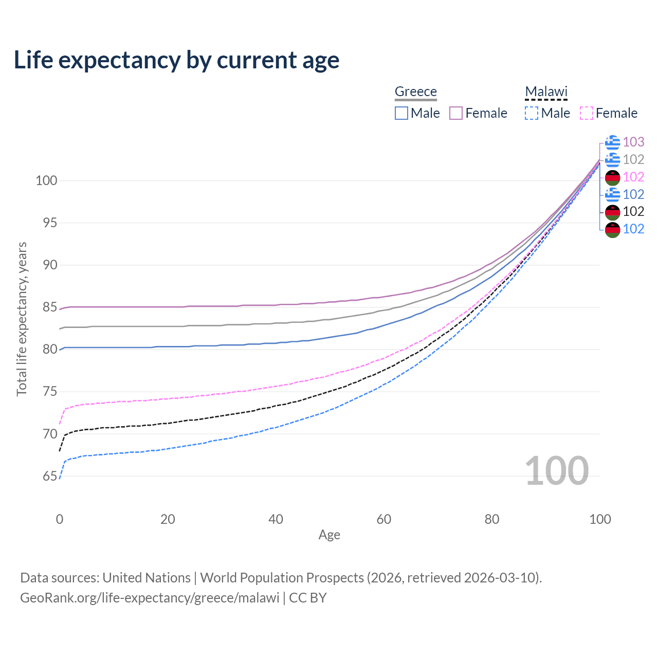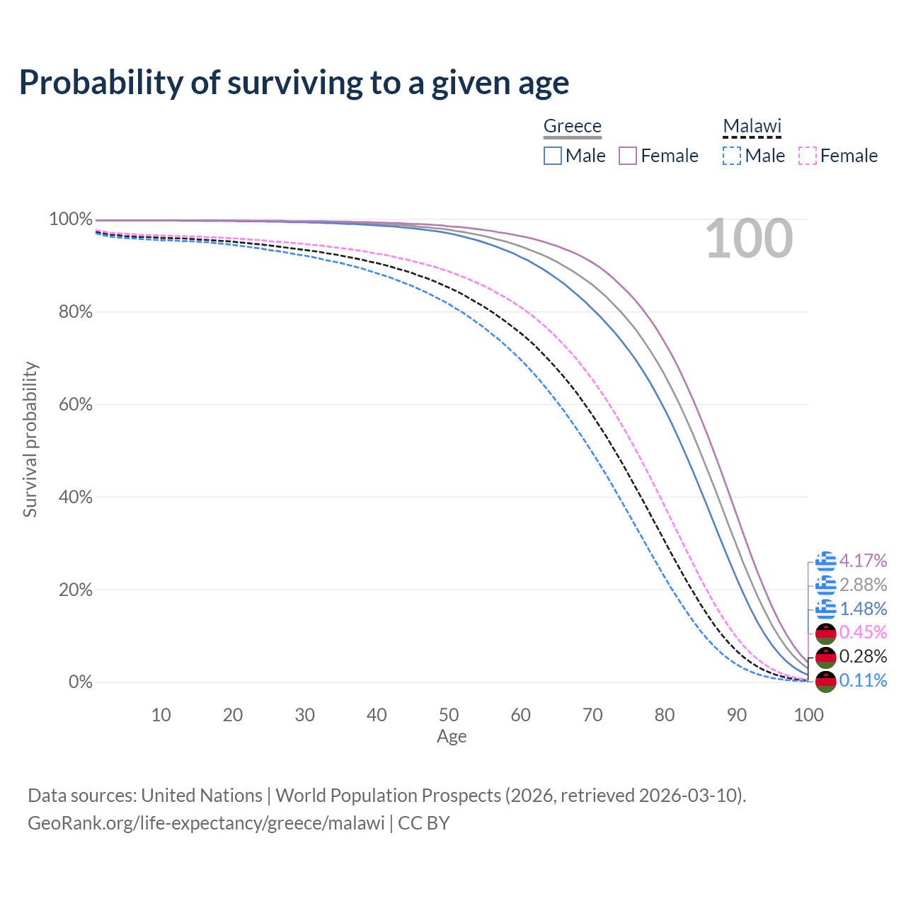 This life expectancy calculator shows the odds of living to 100, 95, 90, and below based on current age for both males and females in Greece and Malawi, along with mean and median age of death. The calculations are based on the 2026 life tables (actuarial tables) from the UN World Population Prospects.