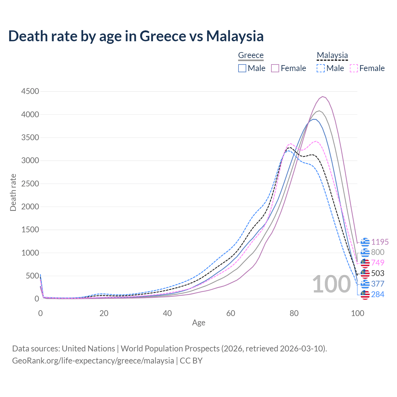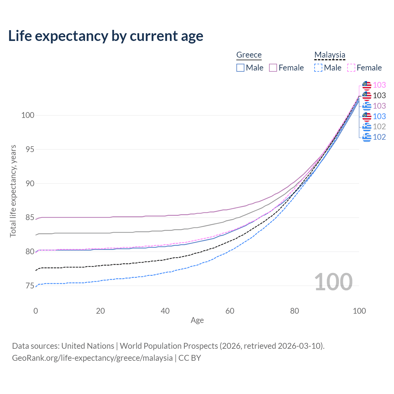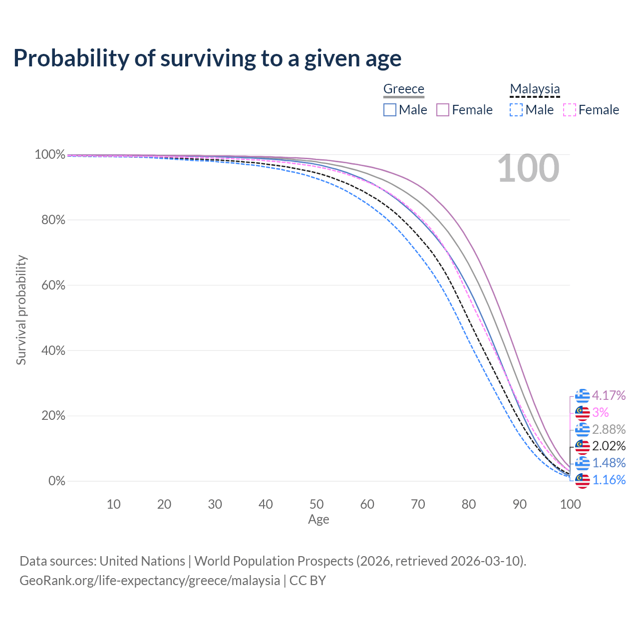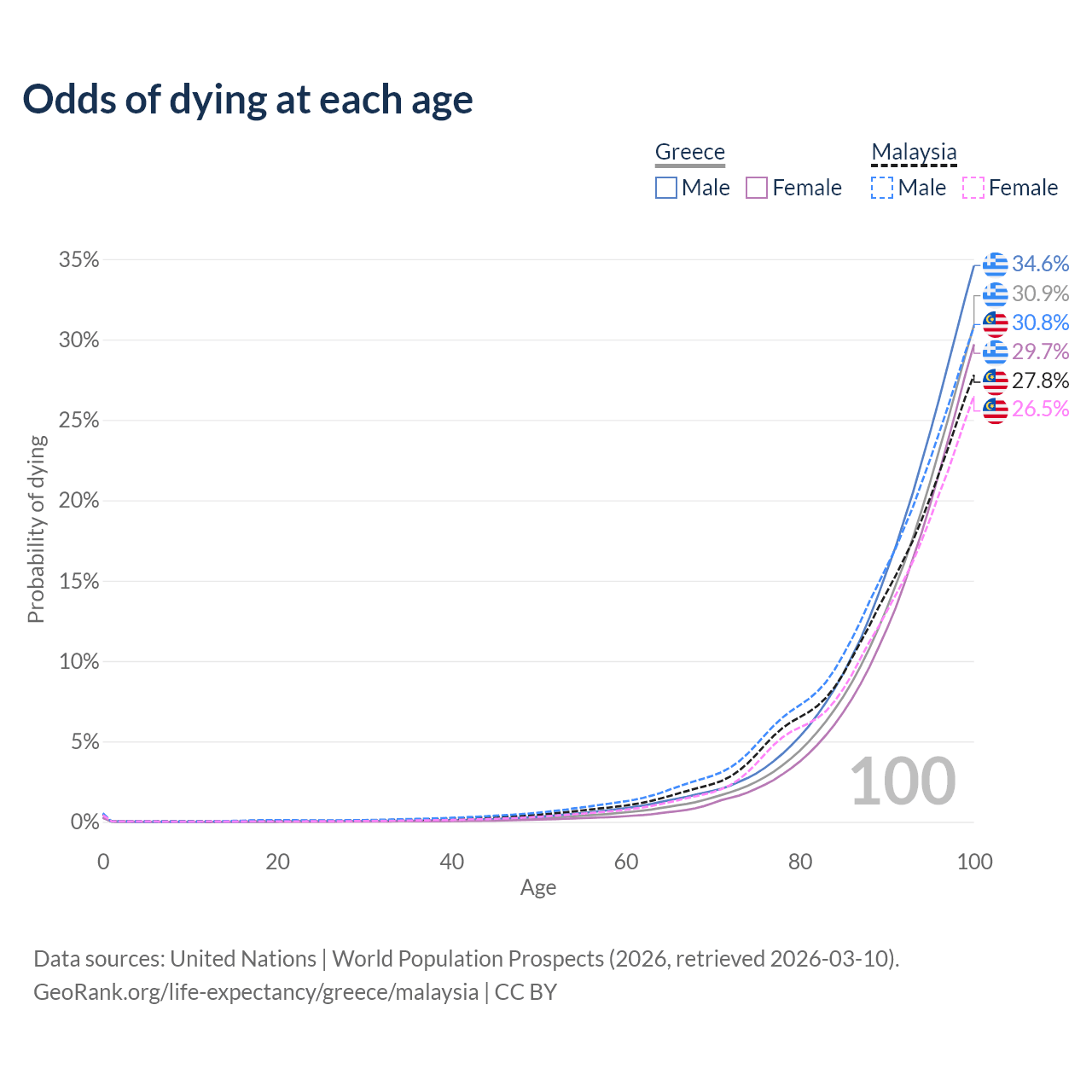 This life expectancy calculator shows the odds of living to 100, 95, 90, and below based on current age for both males and females in Greece and Malaysia, along with mean and median age of death. The calculations are based on the 2026 life tables (actuarial tables) from the UN World Population Prospects.