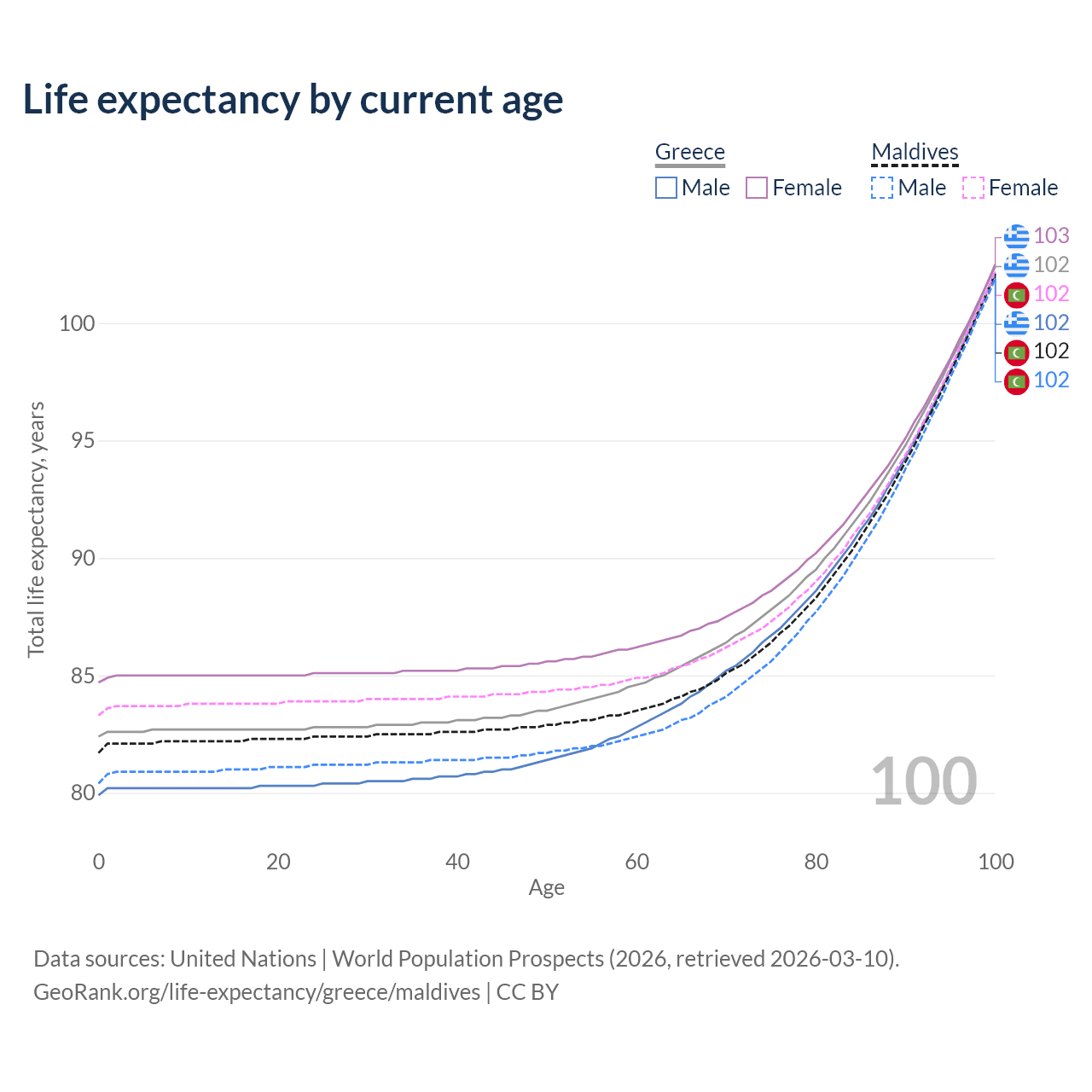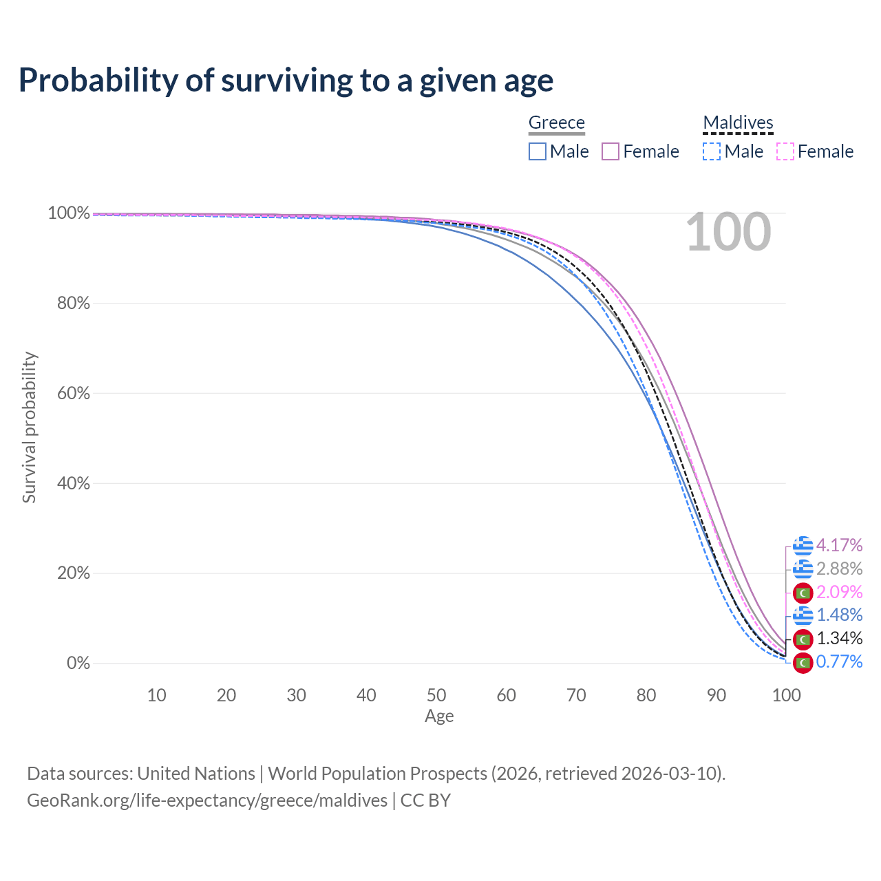 This life expectancy calculator shows the odds of living to 100, 95, 90, and below based on current age for both males and females in Greece and Maldives, along with mean and median age of death. The calculations are based on the 2026 life tables (actuarial tables) from the UN World Population Prospects.