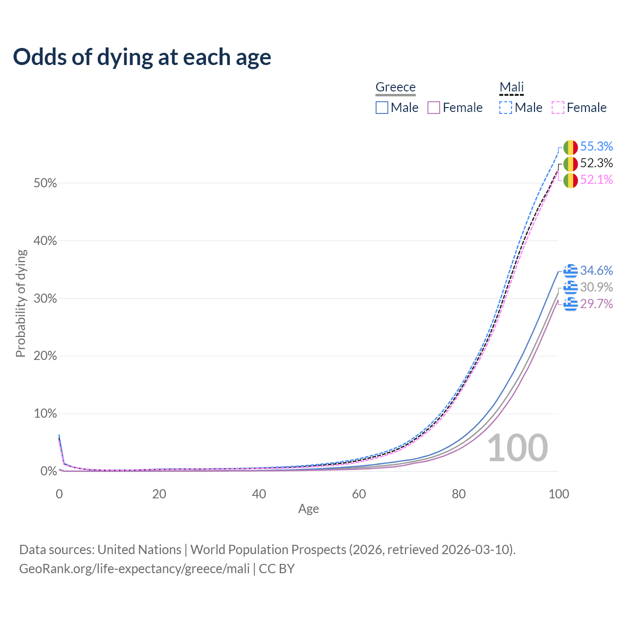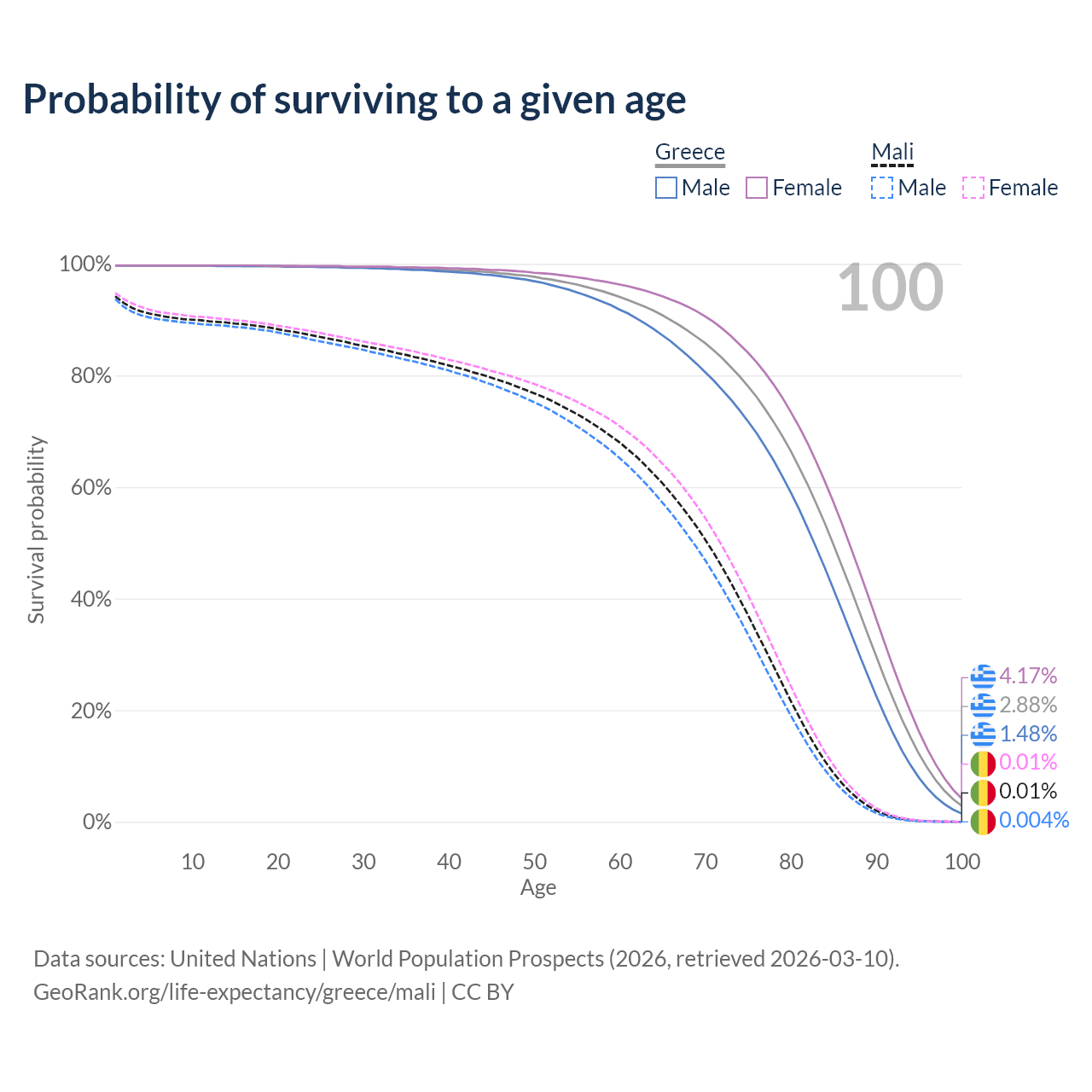 This life expectancy calculator shows the odds of living to 100, 95, 90, and below based on current age for both males and females in Greece and Mali, along with mean and median age of death. The calculations are based on the 2026 life tables (actuarial tables) from the UN World Population Prospects.