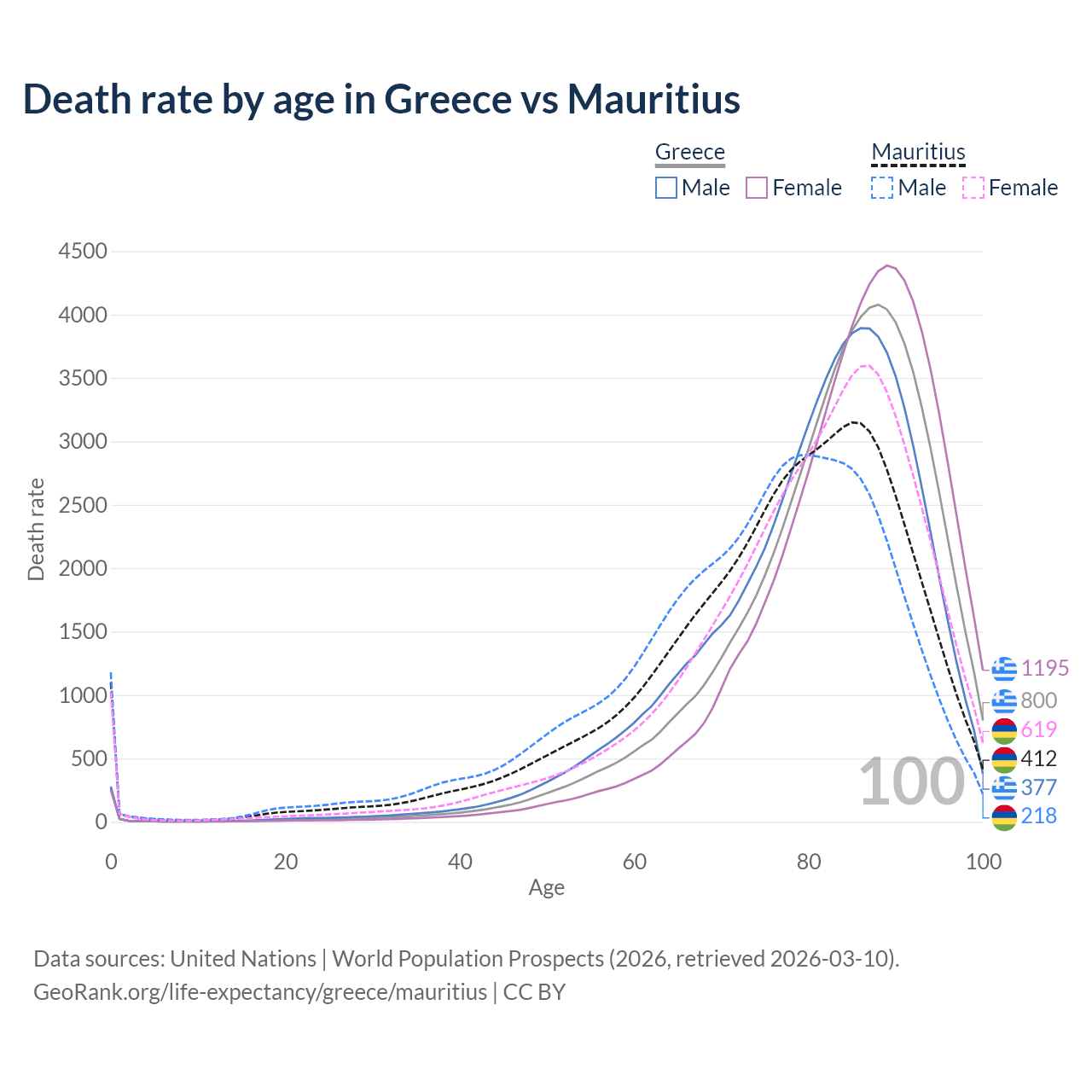 In Greece, the most common age of death is 88, compared to 85 in Mauritius. The median age of death is 84.9 in Greece and 79.1 in Mauritius, meaning only half of each cohort is expected to live past that age.