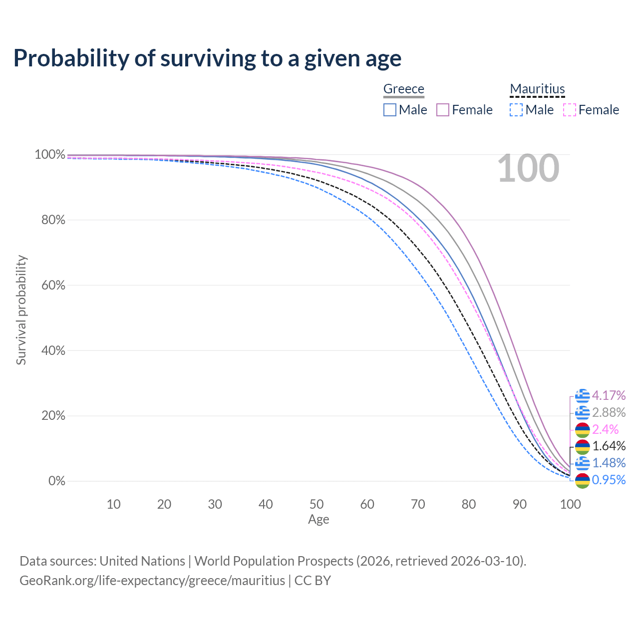 This life expectancy calculator shows the odds of living to 100, 95, 90, and below based on current age for both males and females in Greece and Mauritius, along with mean and median age of death. The calculations are based on the 2026 life tables (actuarial tables) from the UN World Population Prospects.