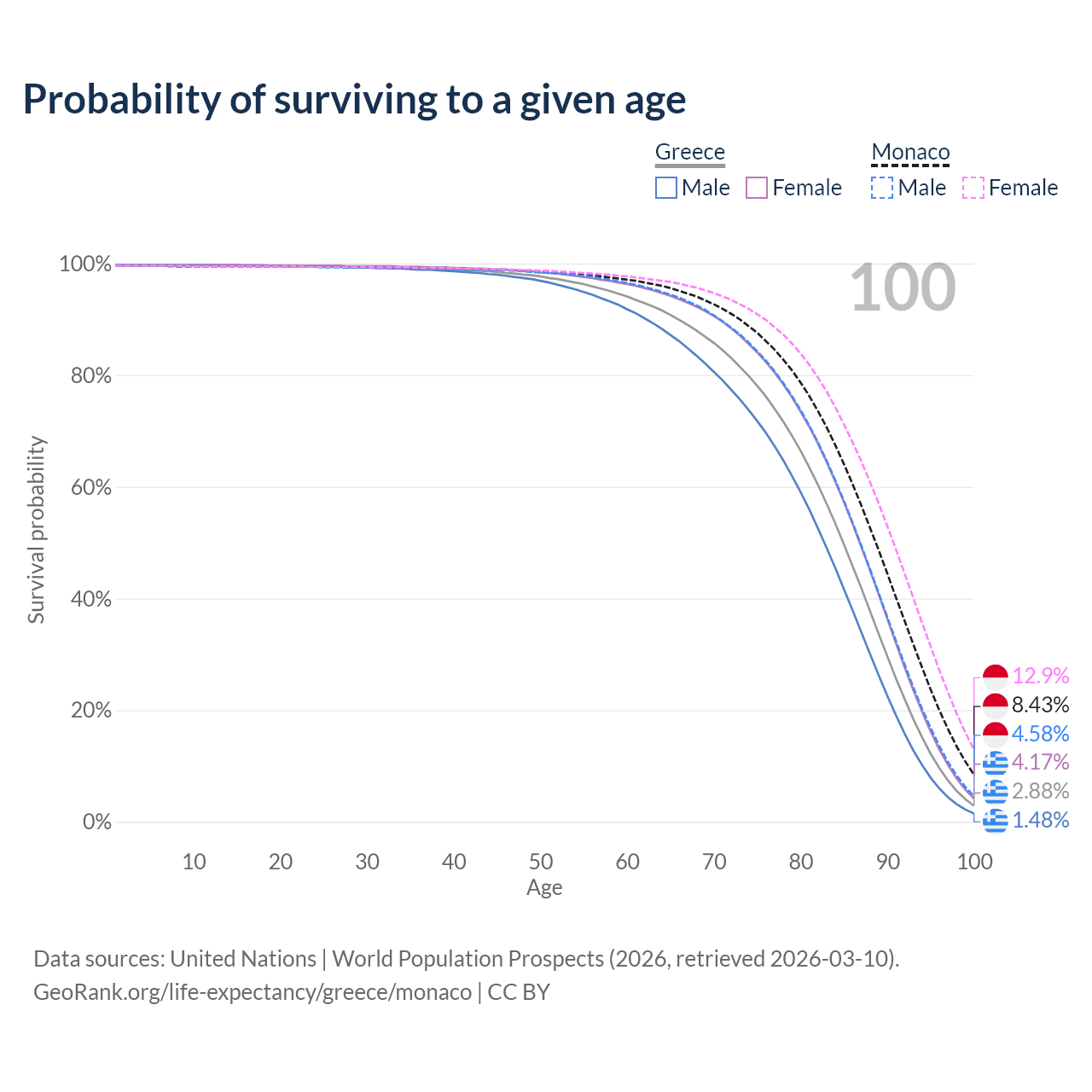 This life expectancy calculator shows the odds of living to 100, 95, 90, and below based on current age for both males and females in Greece and Monaco, along with mean and median age of death. The calculations are based on the 2026 life tables (actuarial tables) from the UN World Population Prospects.