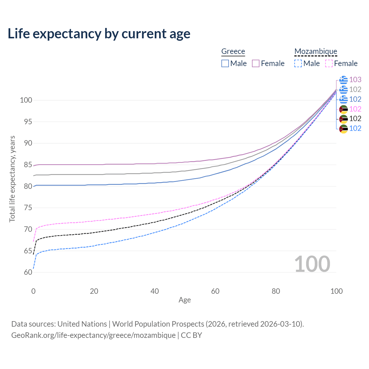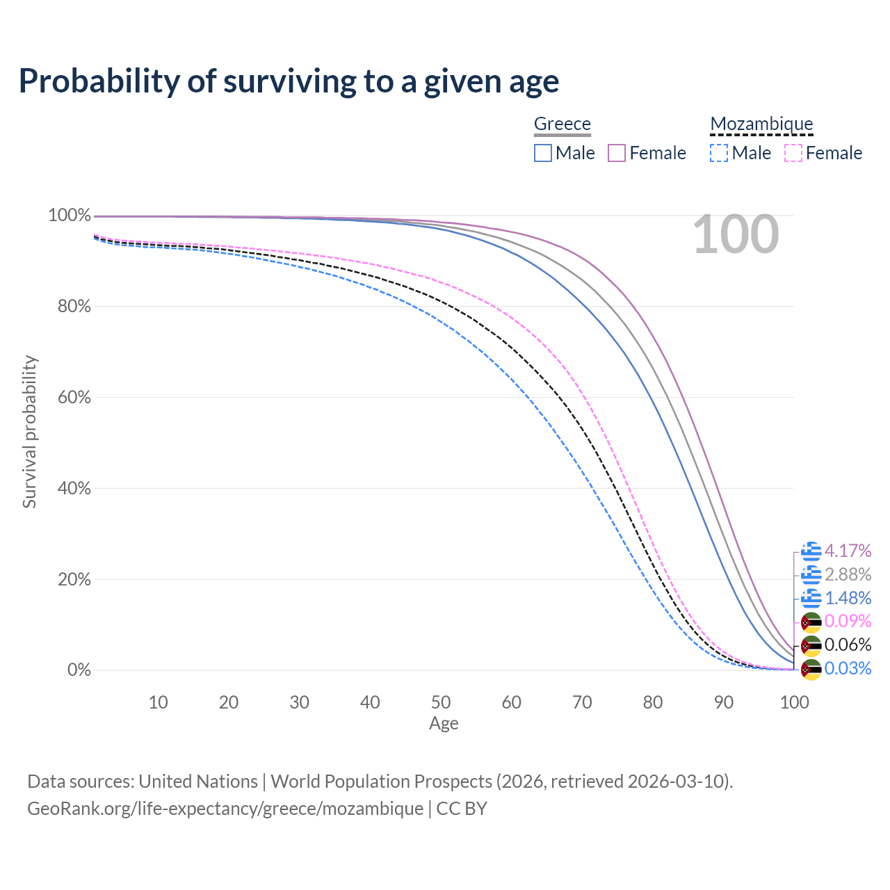 This life expectancy calculator shows the odds of living to 100, 95, 90, and below based on current age for both males and females in Greece and Mozambique, along with mean and median age of death. The calculations are based on the 2026 life tables (actuarial tables) from the UN World Population Prospects.