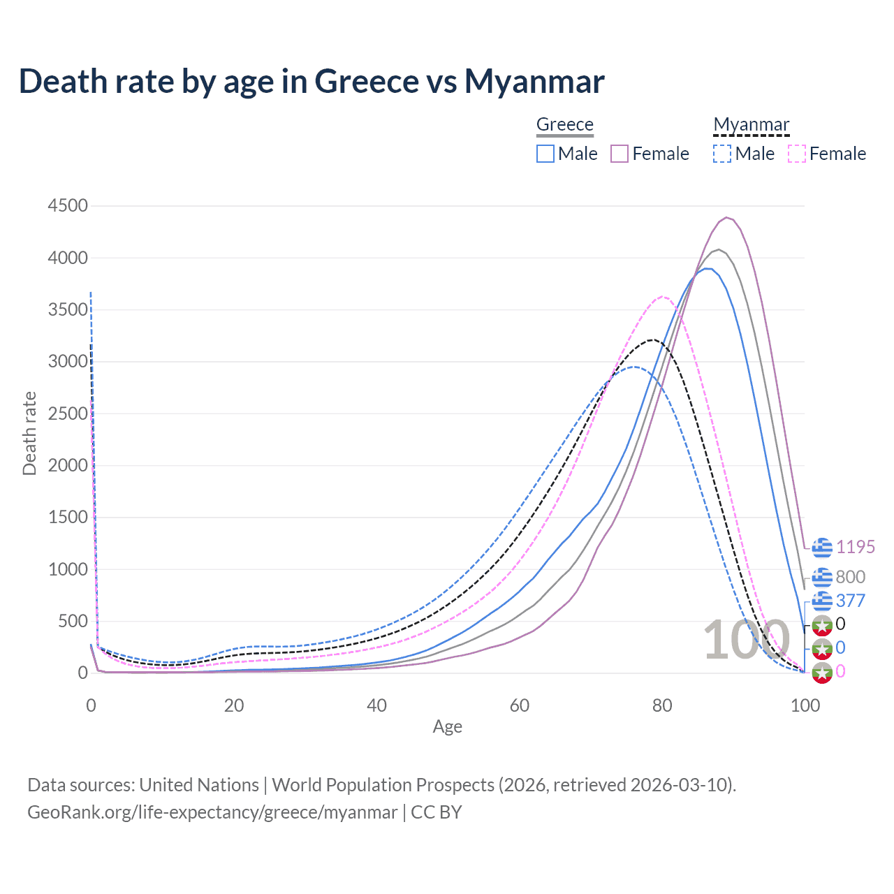 In Greece, the most common age of death is 88, compared to 79 in Myanmar. The median age of death is 84.9 in Greece and 73.1 in Myanmar, meaning only half of each cohort is expected to live past that age.
