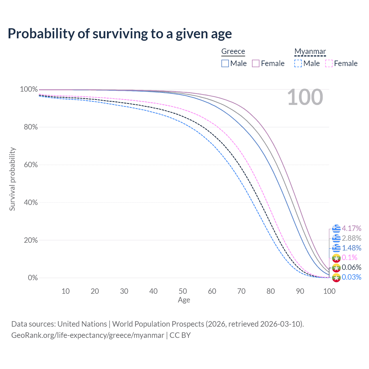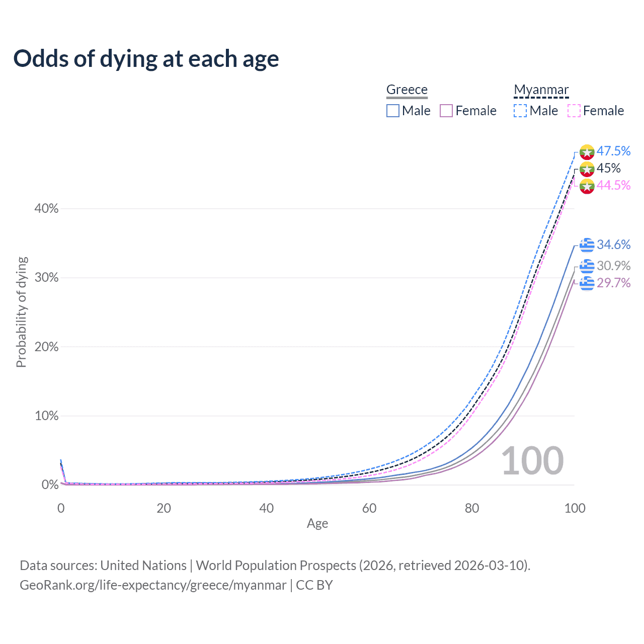 This life expectancy calculator shows the odds of living to 100, 95, 90, and below based on current age for both males and females in Greece and Myanmar, along with mean and median age of death. The calculations are based on the 2026 life tables (actuarial tables) from the UN World Population Prospects.