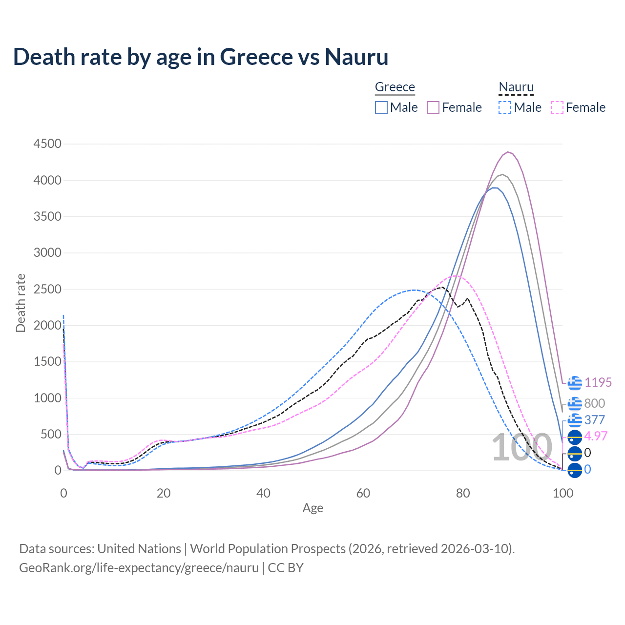 In Greece, the most common age of death is 88, compared to 76 in Nauru. The median age of death is 84.9 in Greece and 67.3 in Nauru, meaning only half of each cohort is expected to live past that age.