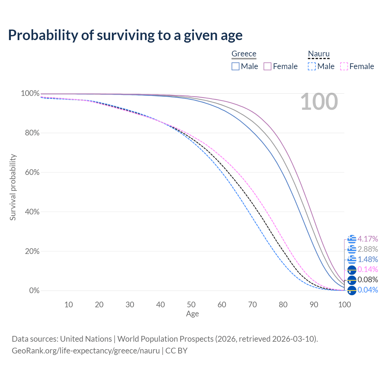 This life expectancy calculator shows the odds of living to 100, 95, 90, and below based on current age for both males and females in Greece and Nauru, along with mean and median age of death. The calculations are based on the 2026 life tables (actuarial tables) from the UN World Population Prospects.