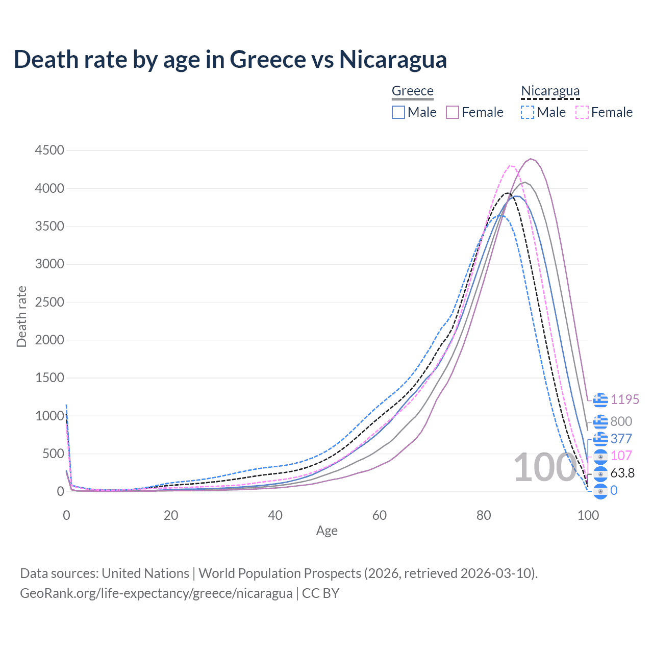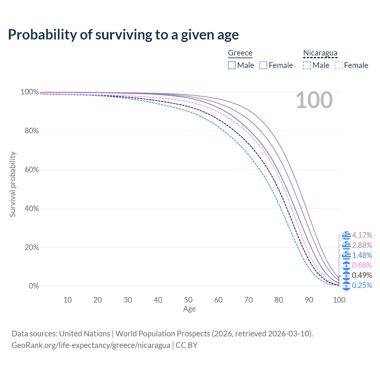 This life expectancy calculator shows the odds of living to 100, 95, 90, and below based on current age for both males and females in Greece and Nicaragua, along with mean and median age of death. The calculations are based on the 2026 life tables (actuarial tables) from the UN World Population Prospects.