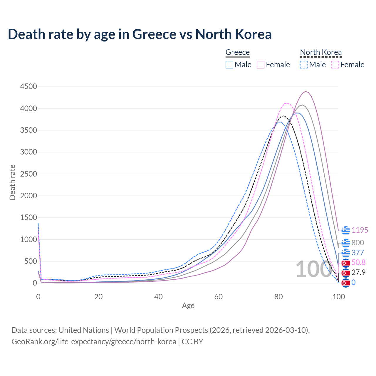 In Greece, the most common age of death is 88, compared to 82 in North Korea. The median age of death is 84.9 in Greece and 78.5 in North Korea, meaning only half of each cohort is expected to live past that age.