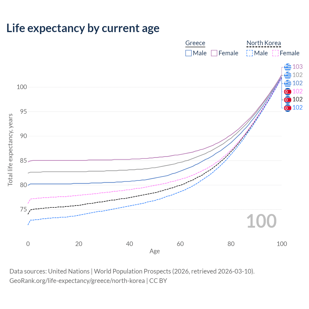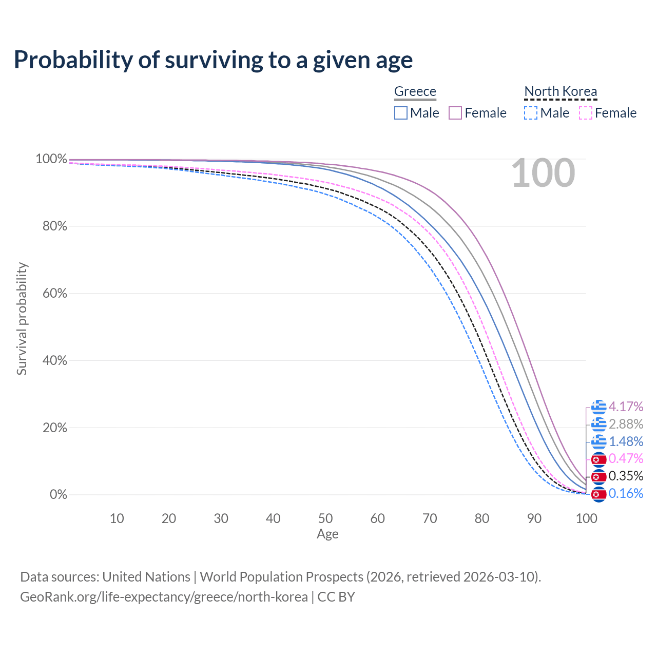 This life expectancy calculator shows the odds of living to 100, 95, 90, and below based on current age for both males and females in Greece and North Korea, along with mean and median age of death. The calculations are based on the 2026 life tables (actuarial tables) from the UN World Population Prospects.