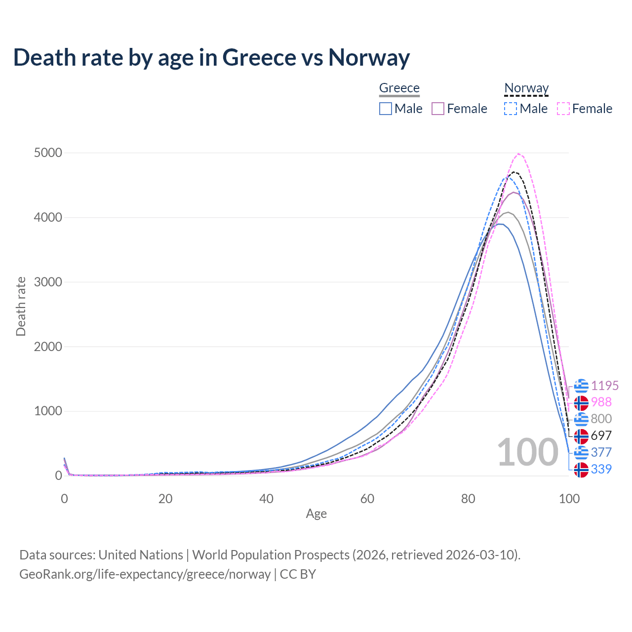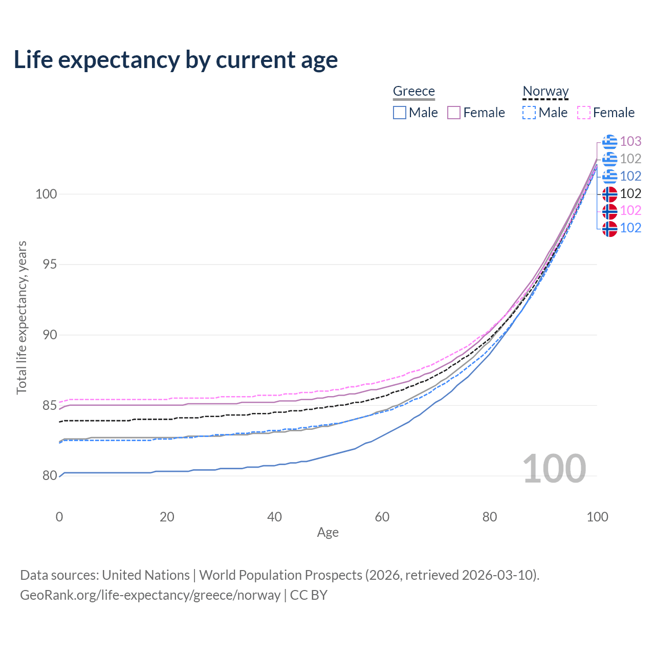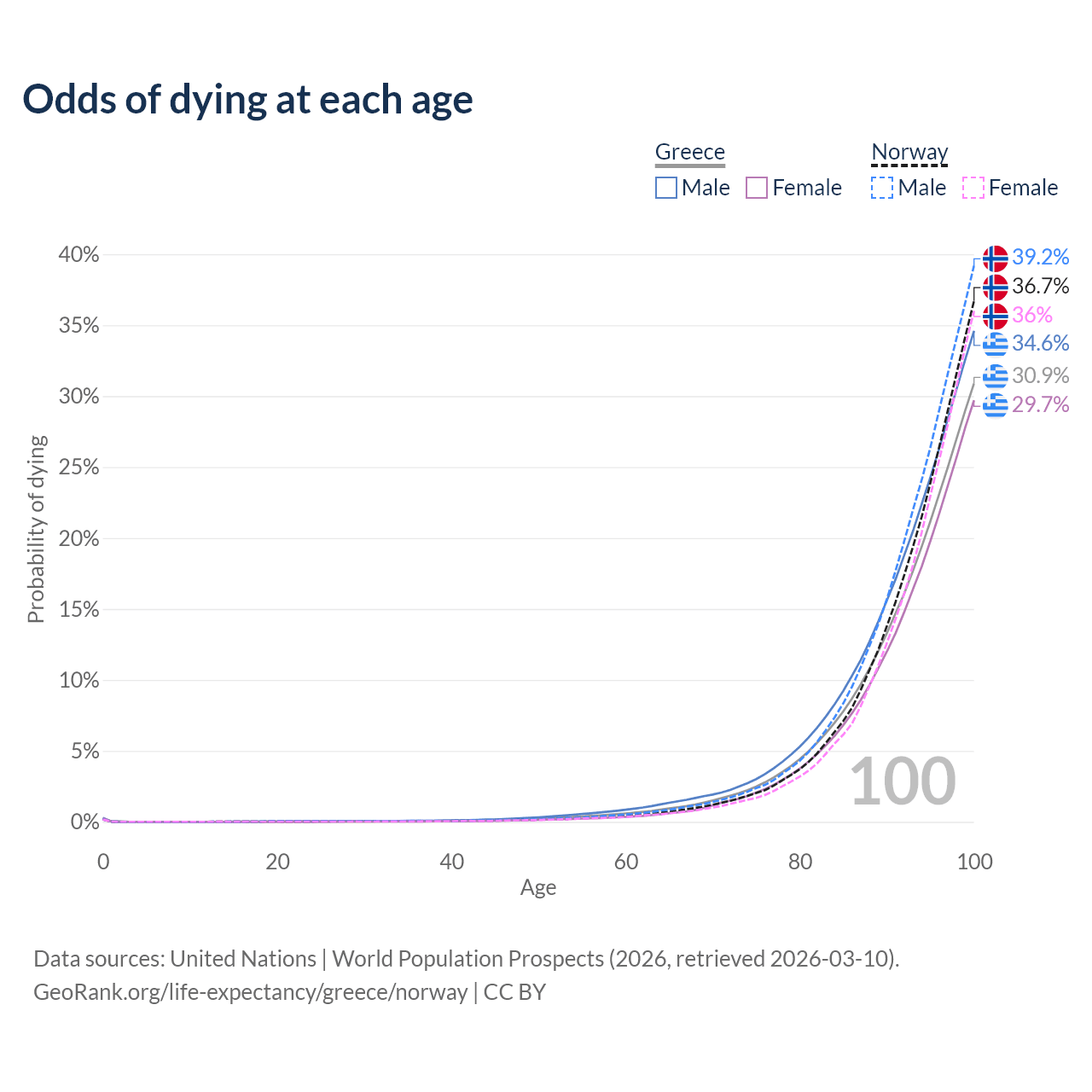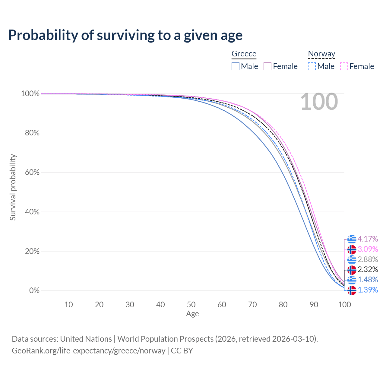 This life expectancy calculator shows the odds of living to 100, 95, 90, and below based on current age for both males and females in Greece and Norway, along with mean and median age of death. The calculations are based on the 2026 life tables (actuarial tables) from the UN World Population Prospects.