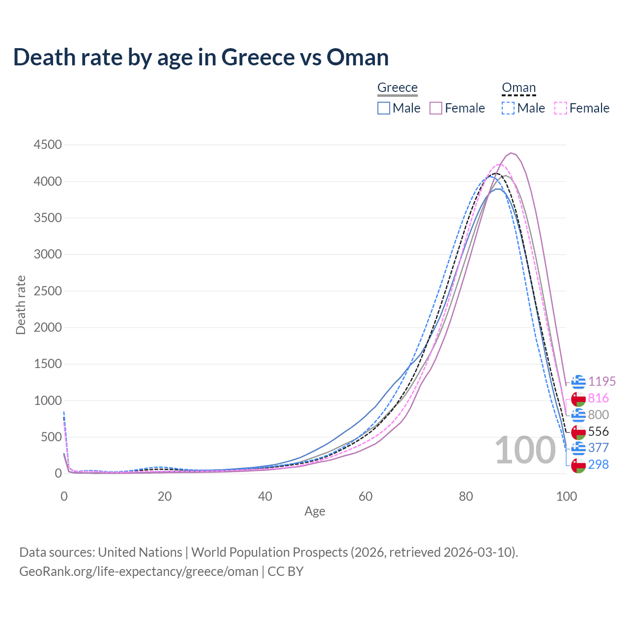 This life expectancy calculator shows the odds of living to 100, 95, 90, and below based on current age for both males and females in Greece and Oman, along with mean and median age of death. The calculations are based on the 2026 life tables (actuarial tables) from the UN World Population Prospects.