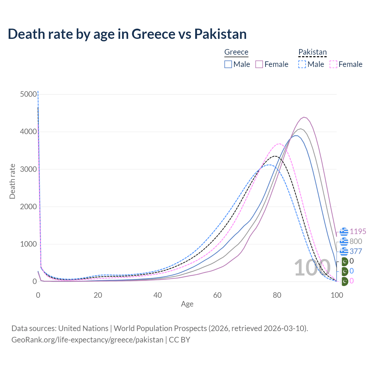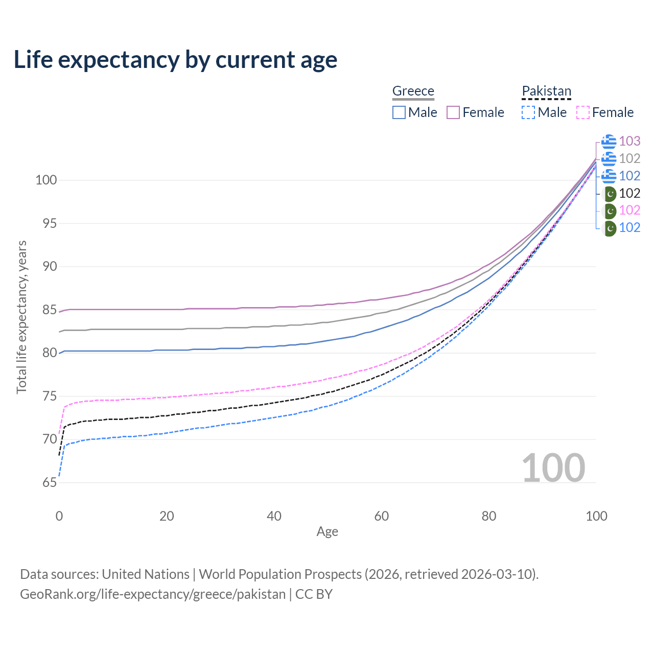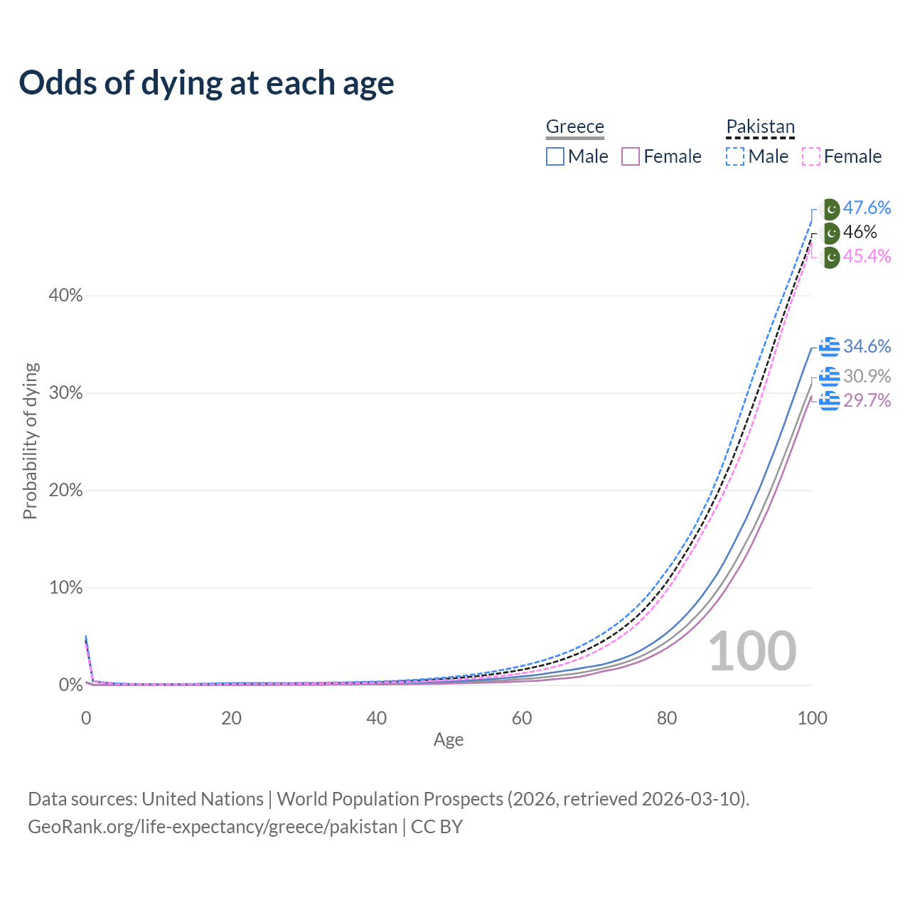 This life expectancy calculator shows the odds of living to 100, 95, 90, and below based on current age for both males and females in Greece and Pakistan, along with mean and median age of death. The calculations are based on the 2026 life tables (actuarial tables) from the UN World Population Prospects.
